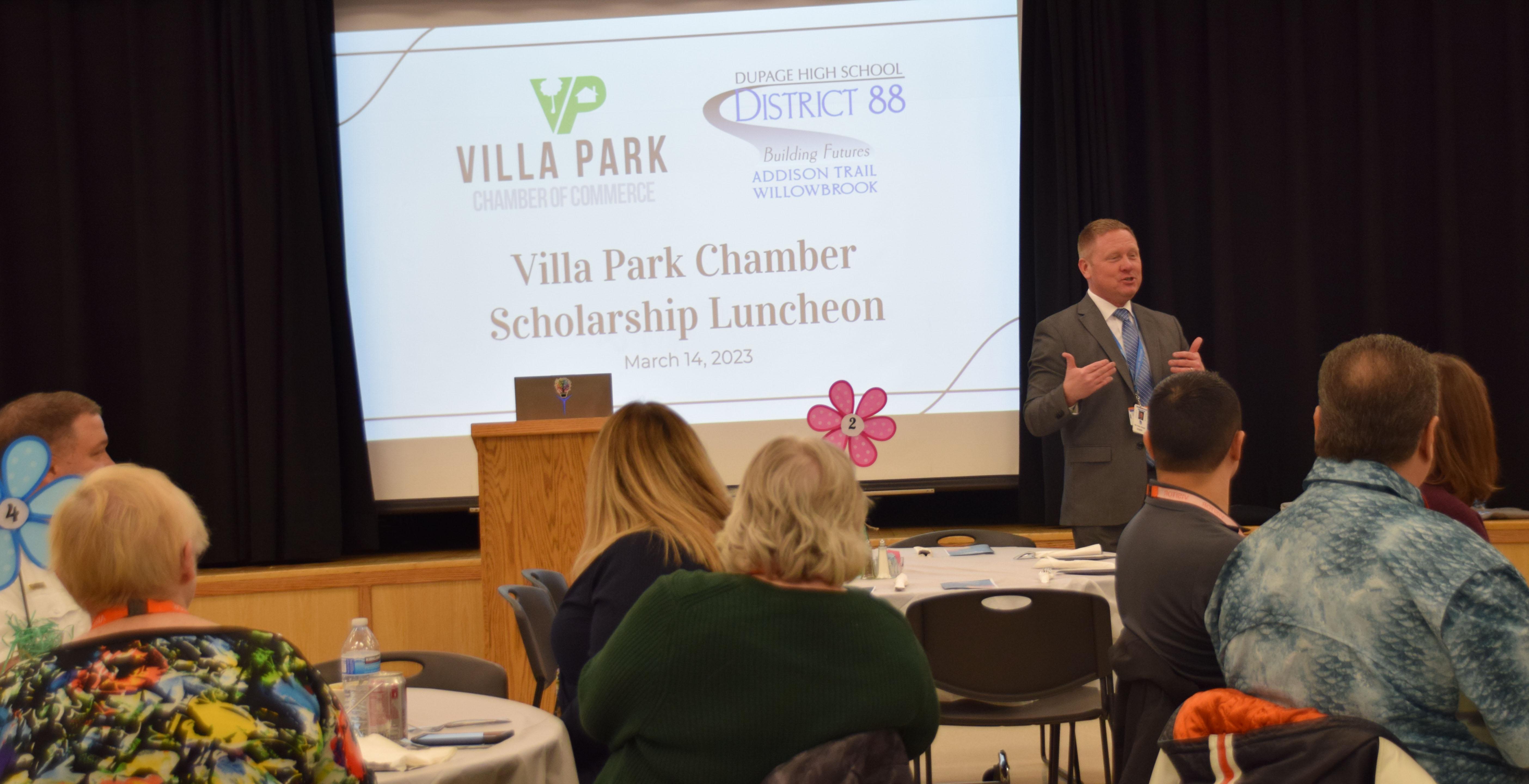 More than 30 people from the chamber, the Village of Villa Park, District 88/Willowbrook and local service organizations attended the luncheon. The audience was welcomed by Villa Park Chamber of Commerce President Alex Saucedo, District 88 Board of Education President Donna Craft Cain and Willowbrook Principal Dr. Daniel Krause.