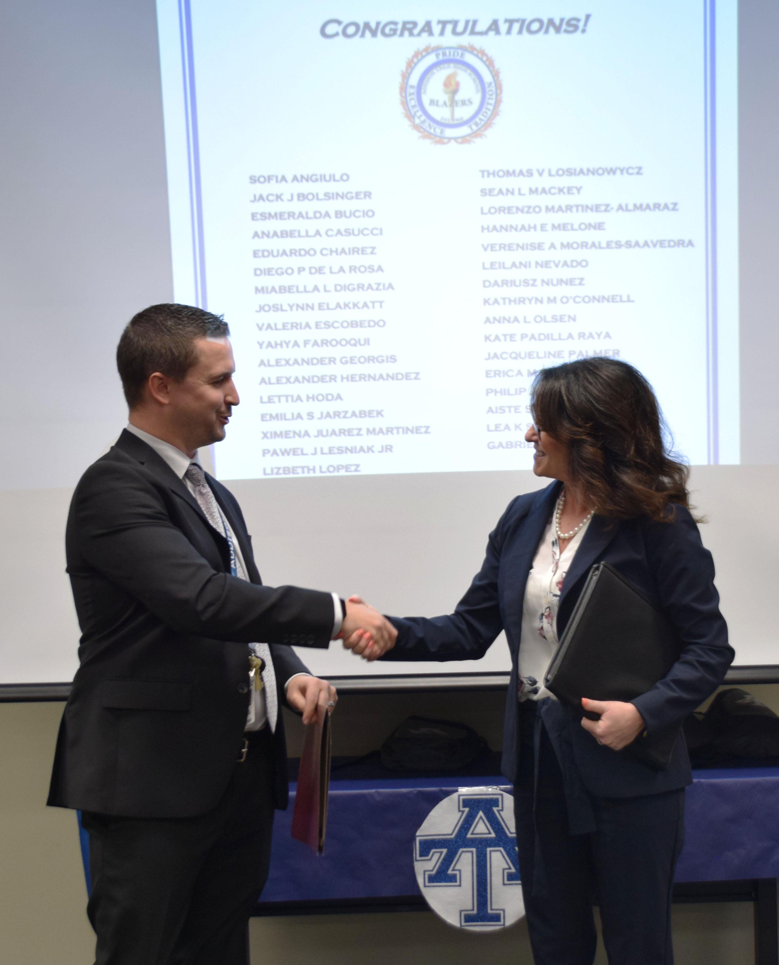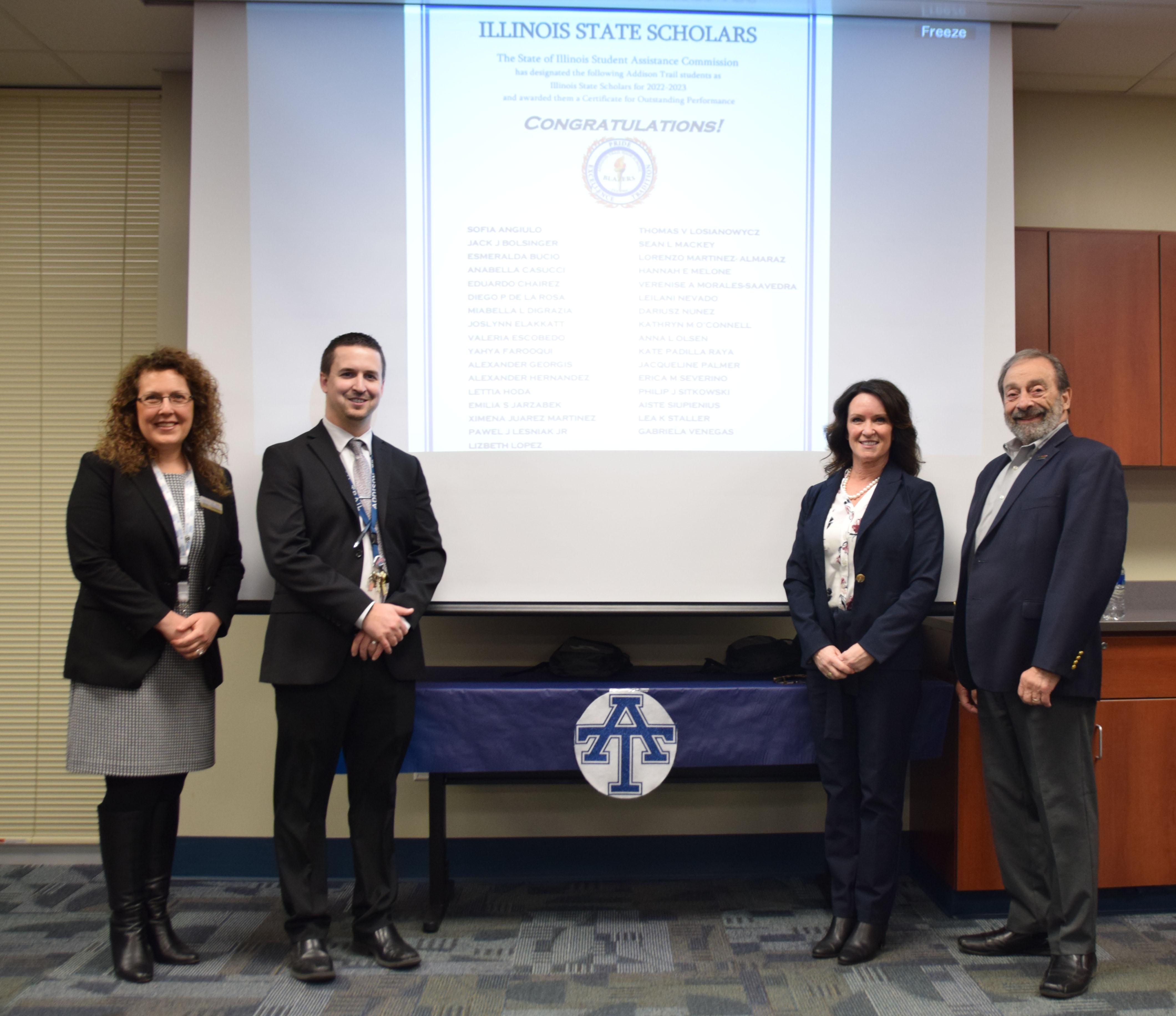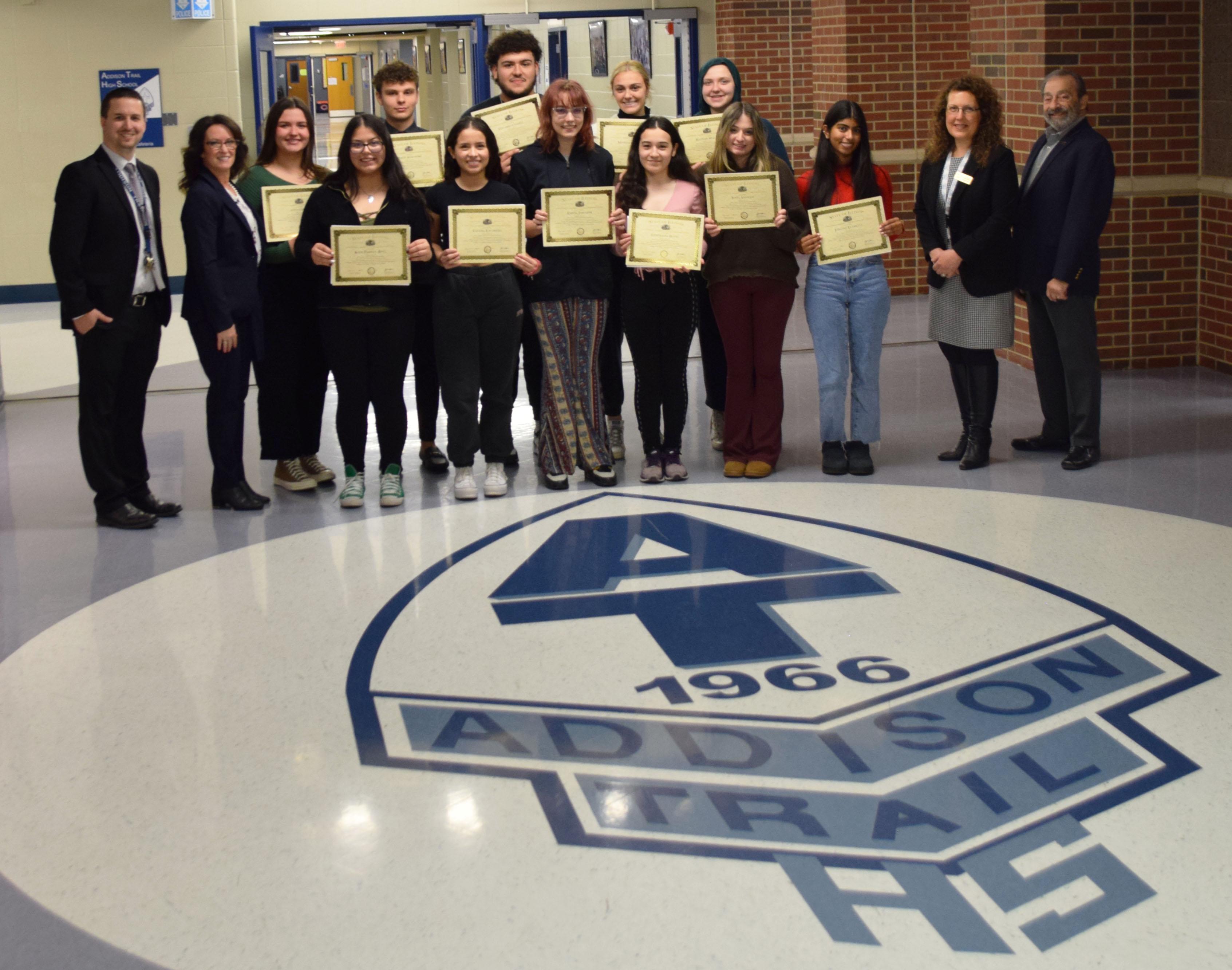 On March 13, State Rep. Jennifer Sanalitro and representatives from the office of State Sen. Seth Lewis visited Addison Trail. Sanalitro presented certificates to Addison Trail students who have been designated as 2023-24 State Scholars (read more at https://dupage88.net/site/page/15215) and honored Addison Trail Principal Jack Andrews with a proclamation to recognize and celebrate the recent birth of his daughter. The group also toured the school and met with Village of Addison Mayor Rich Veenstra, District 88 Superintendent Dr. Jean Barbanente and Andrews.