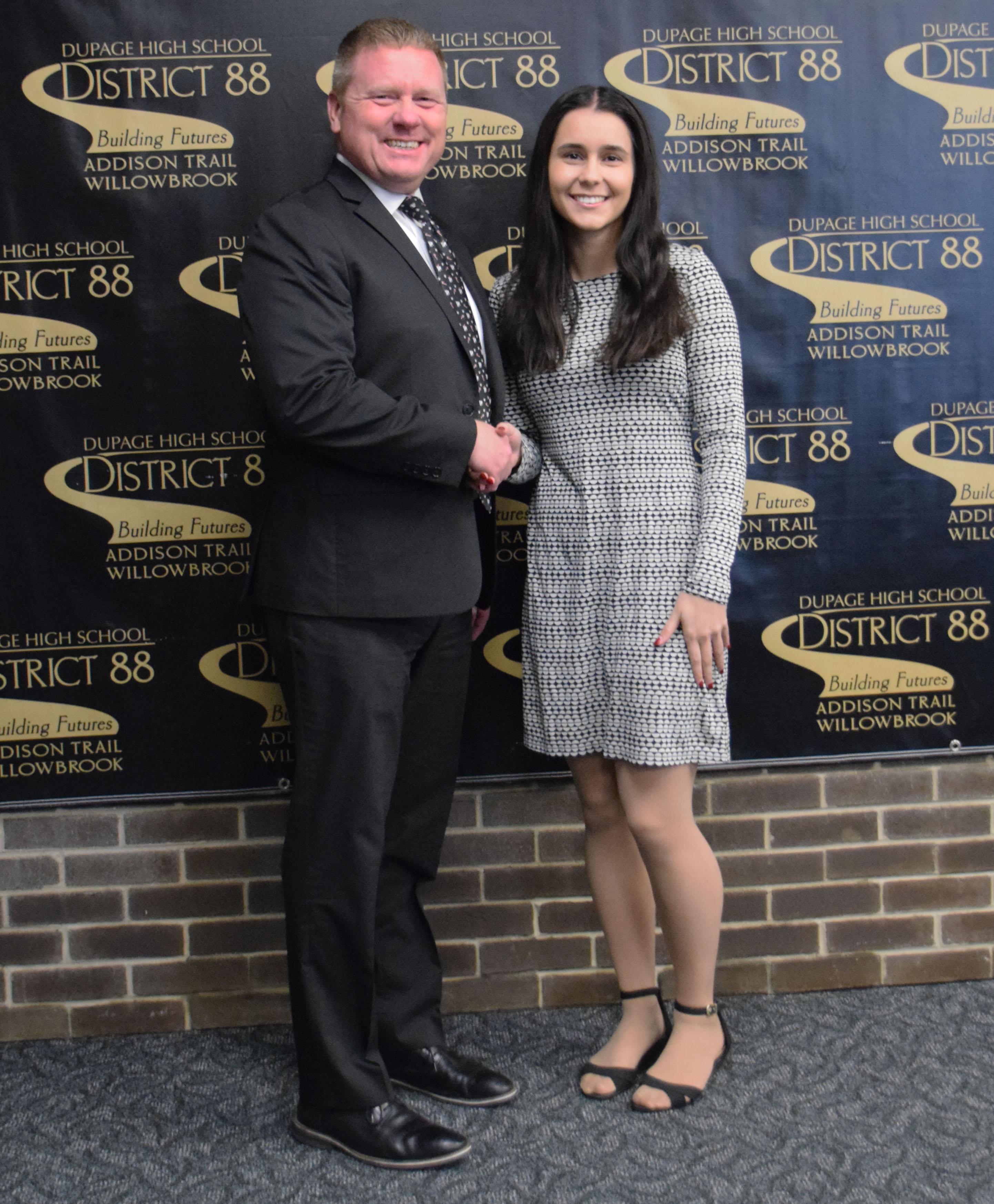 District 88 values the hard work and achievements of students and wants to make sure students are honored and recognized for their accomplishments. The District 88 Board of Education and administration created the 88’s Best award to highlight students’ success. That award recognizes nine Addison Trail and nine Willowbrook students each school year for reaching their personal best in various areas. Recipients are honored during a District 88 Board of Education meeting in one of the following areas: academics, highly improved performance, extracurricular activities, service work or performing arts/electives. They receive an 88’s Best glass sculpture and a certificate to a local restaurant.