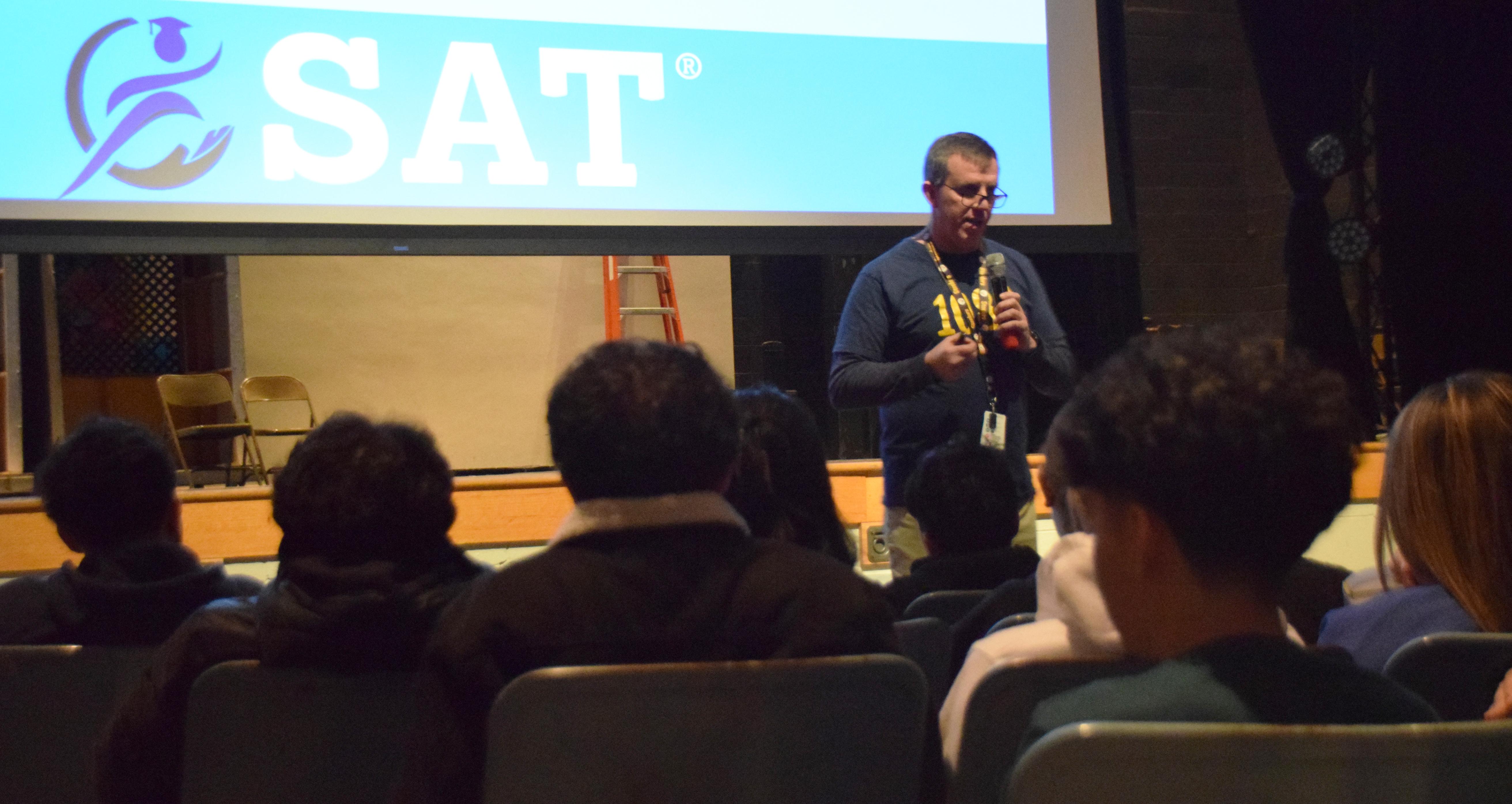 The Addison Trail Counseling Department and administration are working with members of the class of 2025 to help them achieve a score of 1080 or higher on the SAT, or improve their score by at least 60 points from the PSAT (pre-exam) they took this past fall. Students who reach or surpass those benchmarks will be entered into a raffle to receive free prom tickets, free homecoming tickets, or a free parking pass. To help share this information, an assembly took place on Jan. 17 (see a photo gallery from the event above, and click on the images for photo captions).
