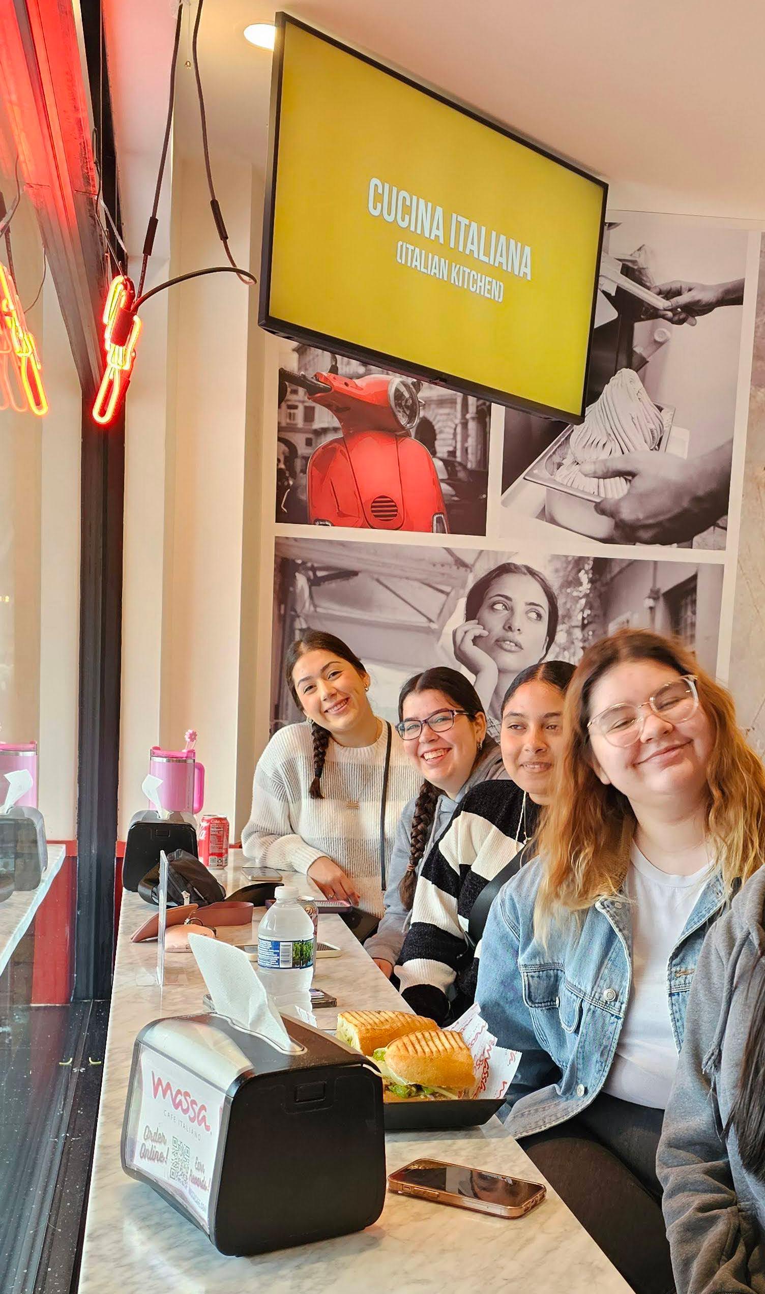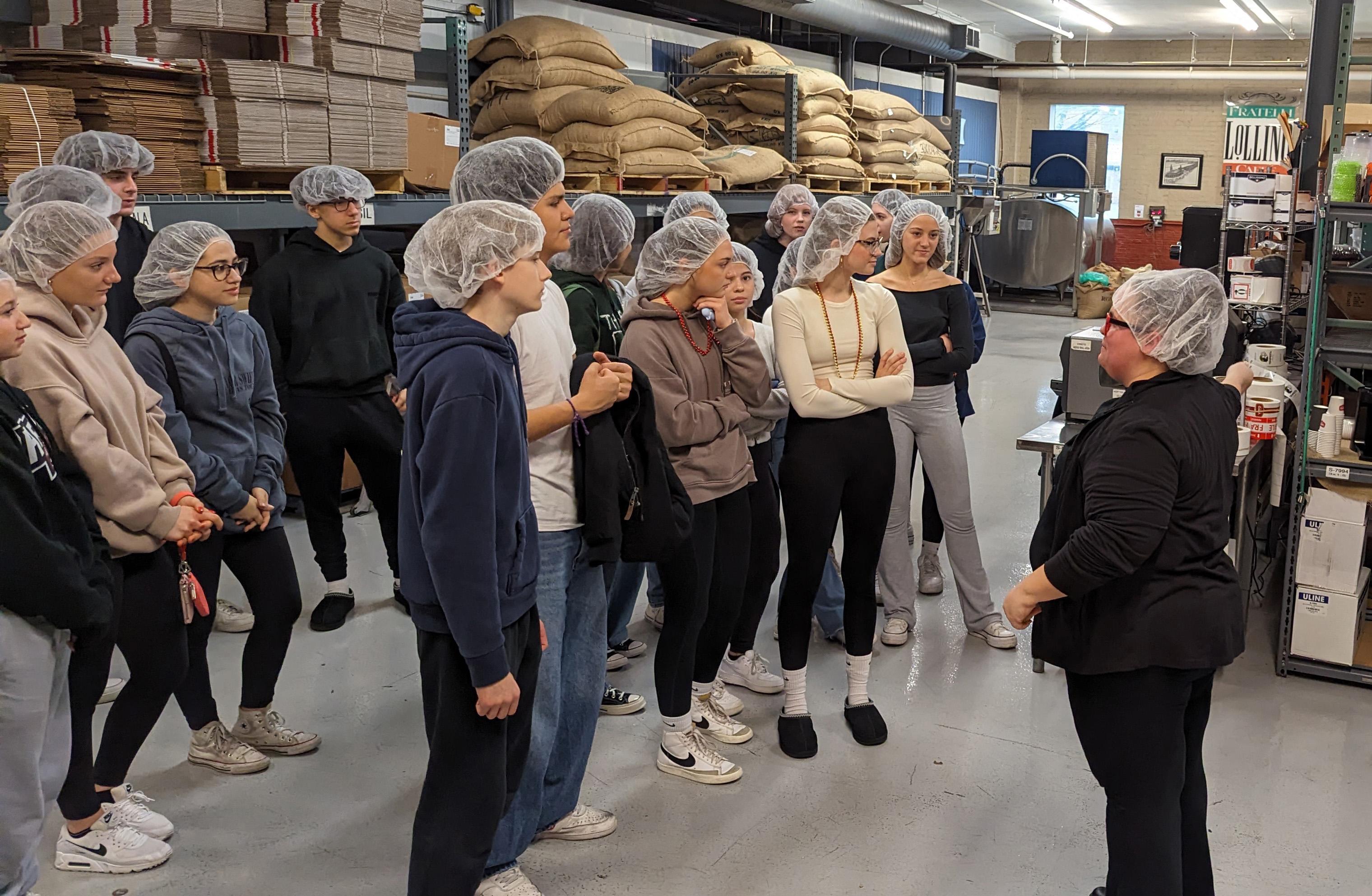 During their visit, the students met with Angelo Lollino, Owner of Alamode Foods and Massa Cafe Italiano, and Stephanie Leipart, Director of Business Administration with Alamode Foods, and toured the factory. They were able to see how the coffee beans are roasted and how the gelato is made fresh daily with ingredients from Italy, and they were provided with samples to taste. They also learned about summer job opportunities with the company. The group then traveled to Elmwood Park and ate at various restaurants, including Lollino’s Massa Cafe Italiano.