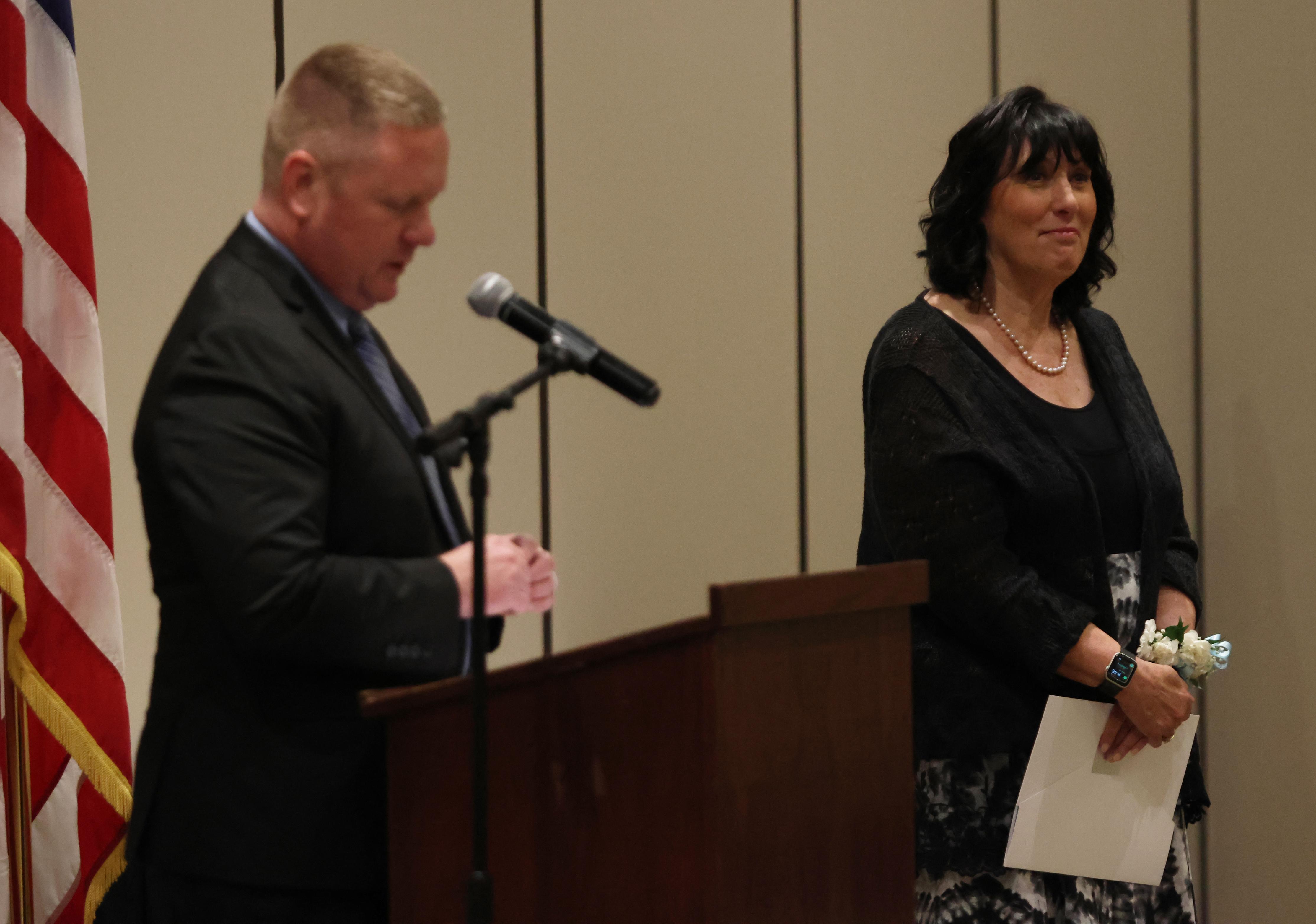 The Outstanding Achievement Awards went to Mark Corey (retiring Music Department Head and Band Director) for Addison Trail and Kathryn Wilson (English teacher and Warrior Resource Center Coordinator) for Willowbrook.
