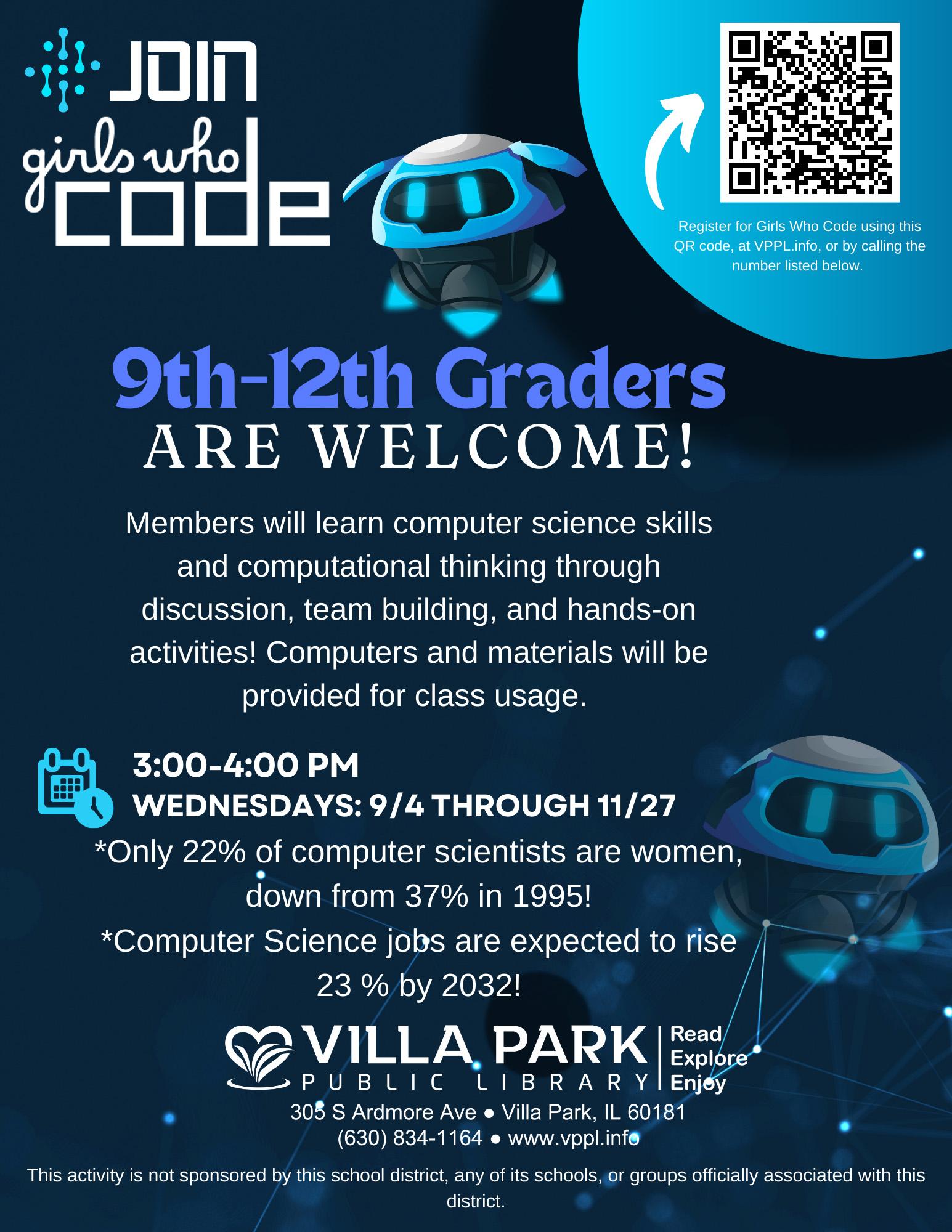 To register: Go to https://villapark.librarycalendar.com/event/girls-who-code-9-12-grade-club-35977.