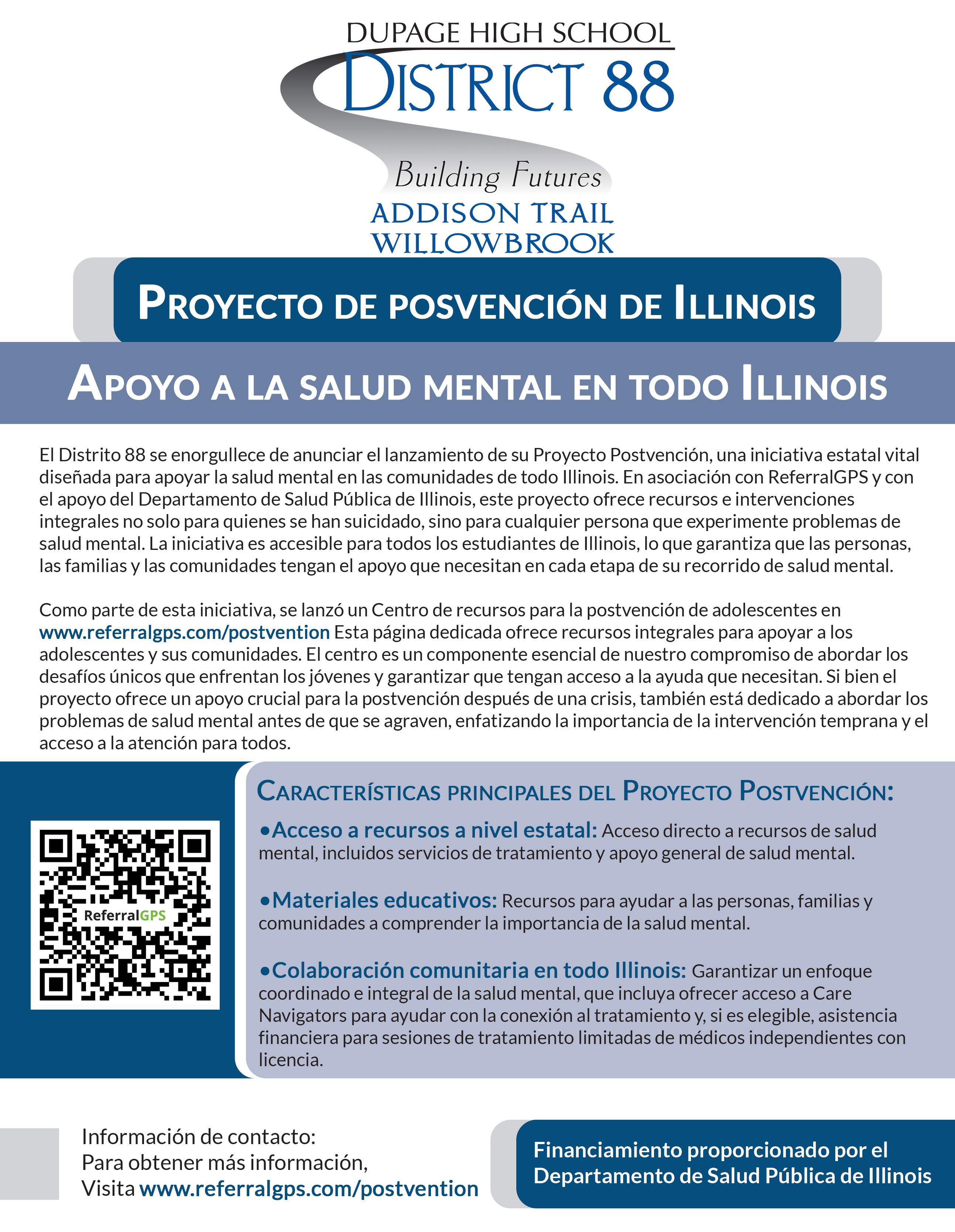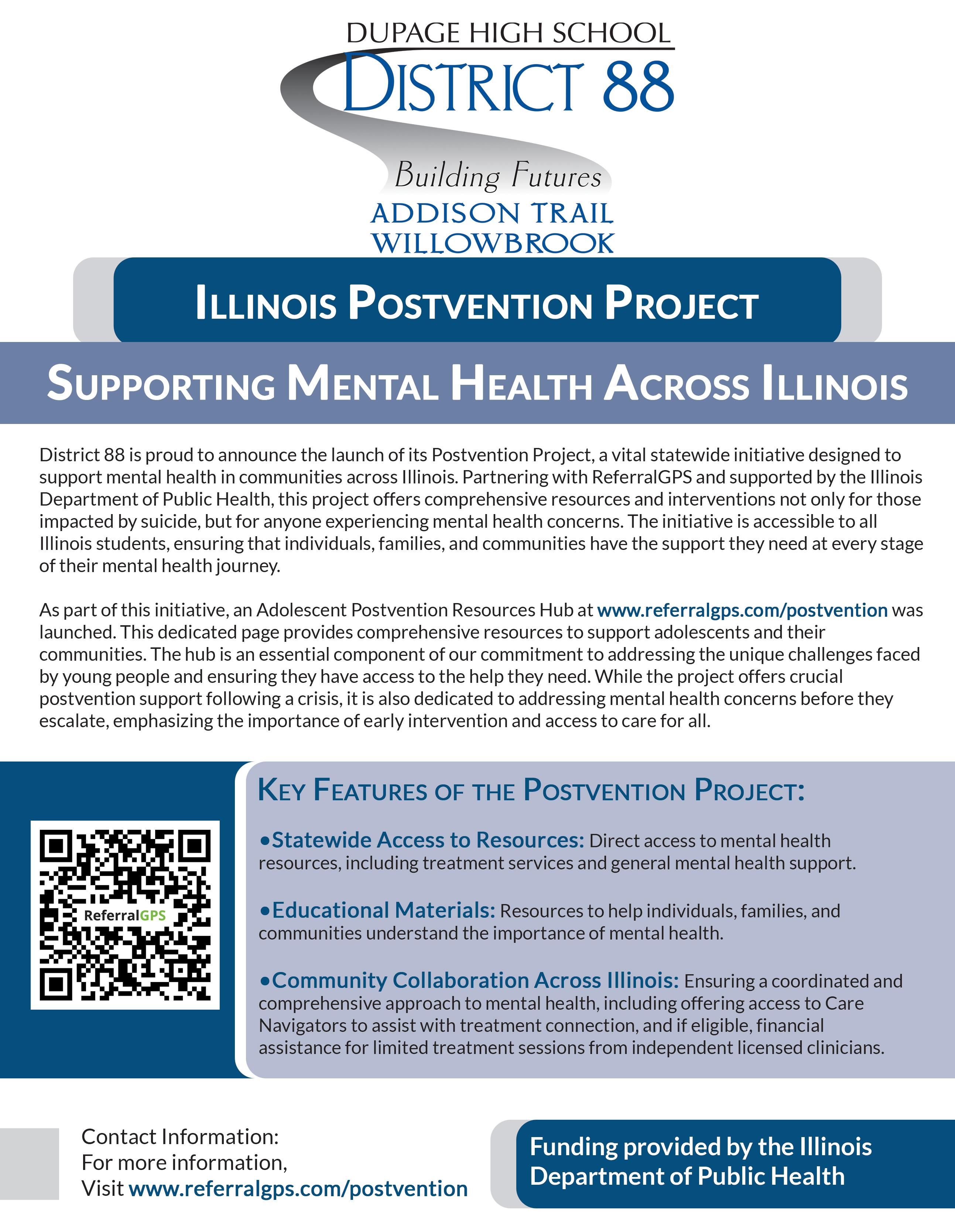 As part of that focus, District 88 is proud to announce the launch of its Postvention Project, a vital statewide initiative designed to support the mental health of District 88 students and their family members. In partnership with ReferralGPS and supported by the Illinois Department of Public Health (IDPH), this project offers an expansion of mental health services that will make it easier for District 88 students and their families to access up to eight in-person or telehealth counseling sessions. It provides comprehensive resources and interventions – not only for those impacted by suicide, but for anyone experiencing mental health concerns. Services can be accessed at referralgps.com/postvention, or by texting “HOME” to 741741. (Anyone in an emergency situation should contact the 988 Suicide and Crisis Lifeline for immediate assistance.) All inquiries will be confidential.