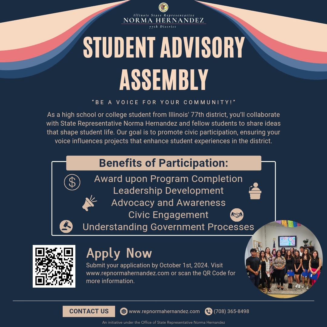 Convening under the guidance of State Rep. Norma Hernandez's office, students will share insights and ideas from their academic communities. Members will consult on various initiatives, events and resolutions, contributing to the shaping of policies and programs that impact student life within the district. The SAA aims to foster and enhance civic engagement among youth, ensuring their voices are heard and their ideas are transformed into actionable outcomes.
