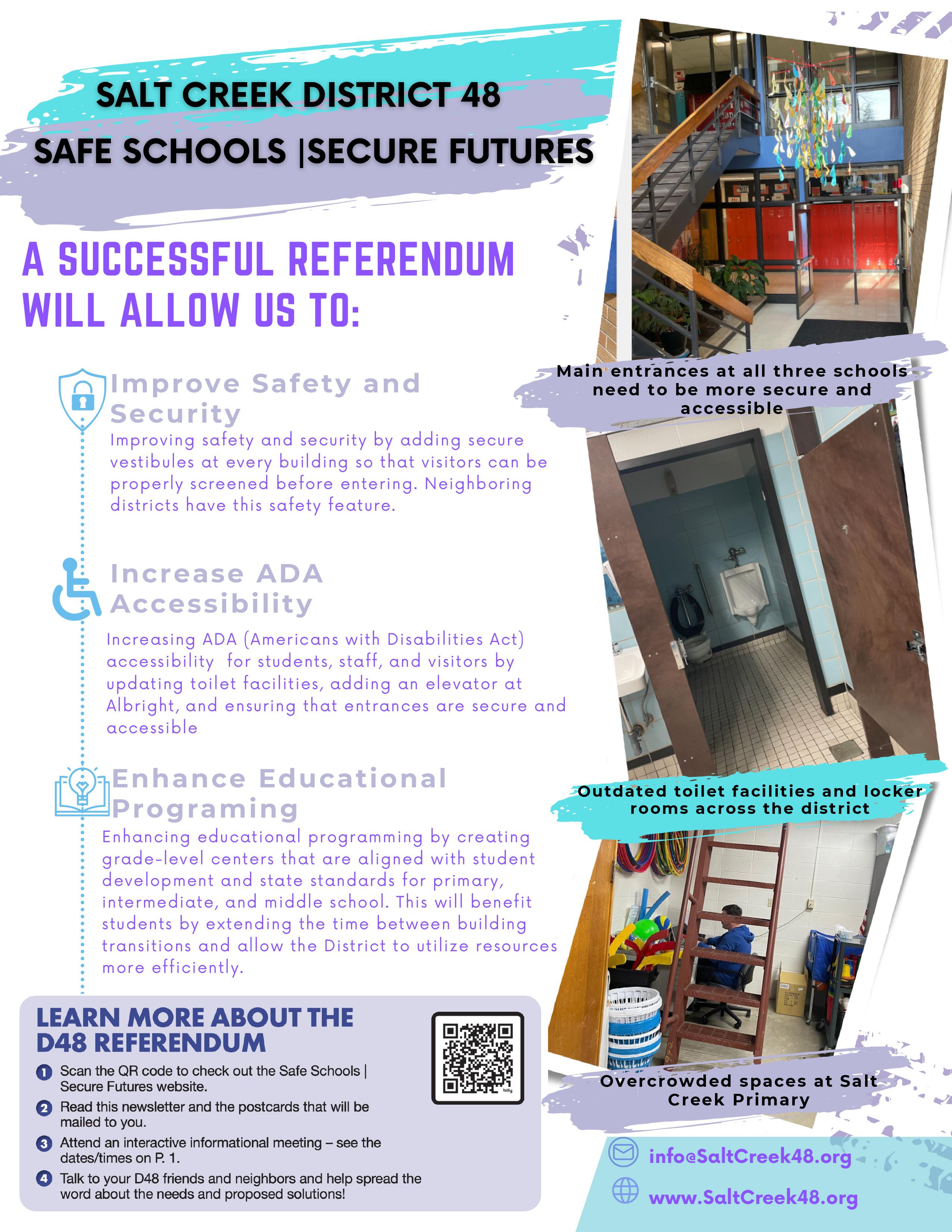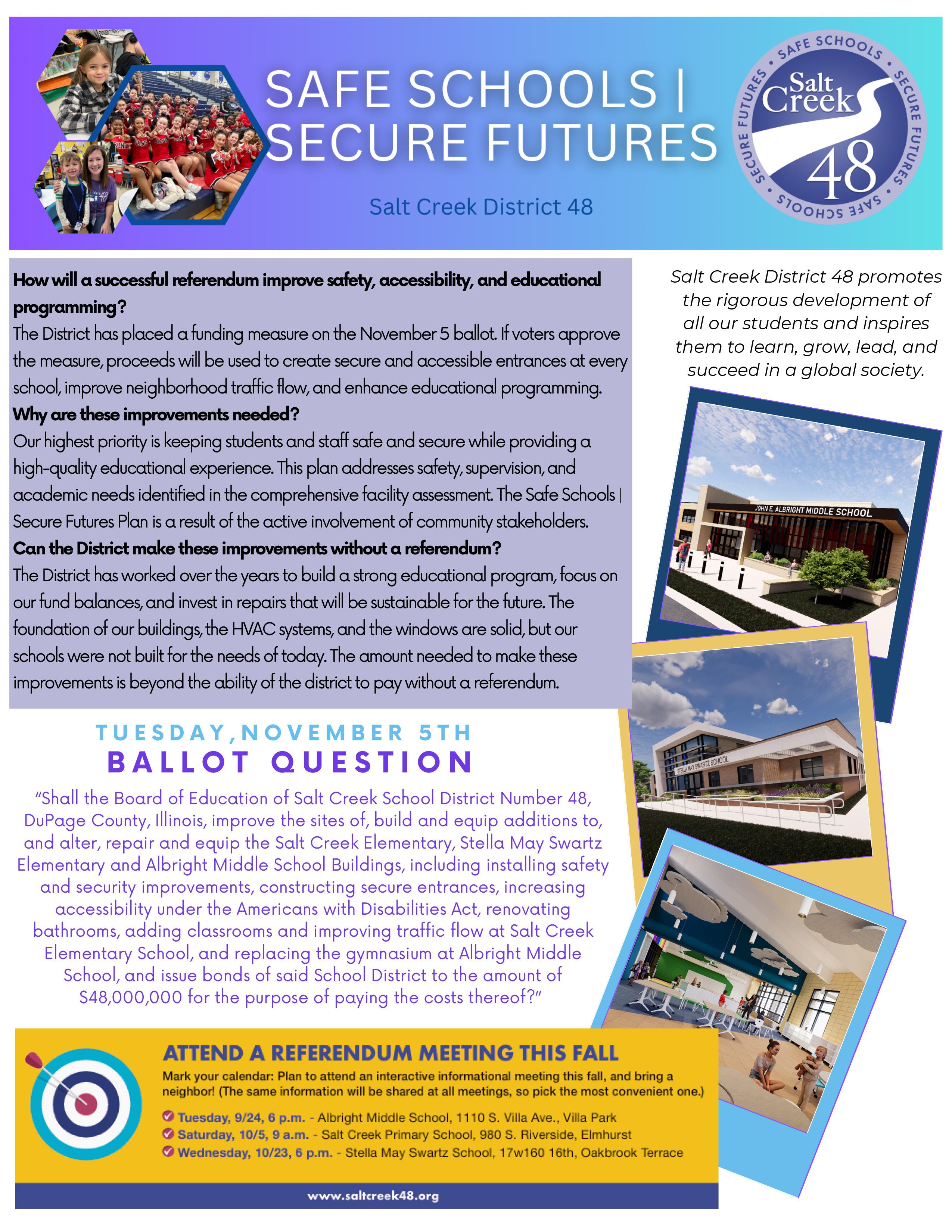 For more information about the Safe Schools | Secure Futures referendum project, including details about the plan and a list of frequently asked questions, go to https://sites.google.com/saltcreek48.org/safeschoolssecurefutures/home.