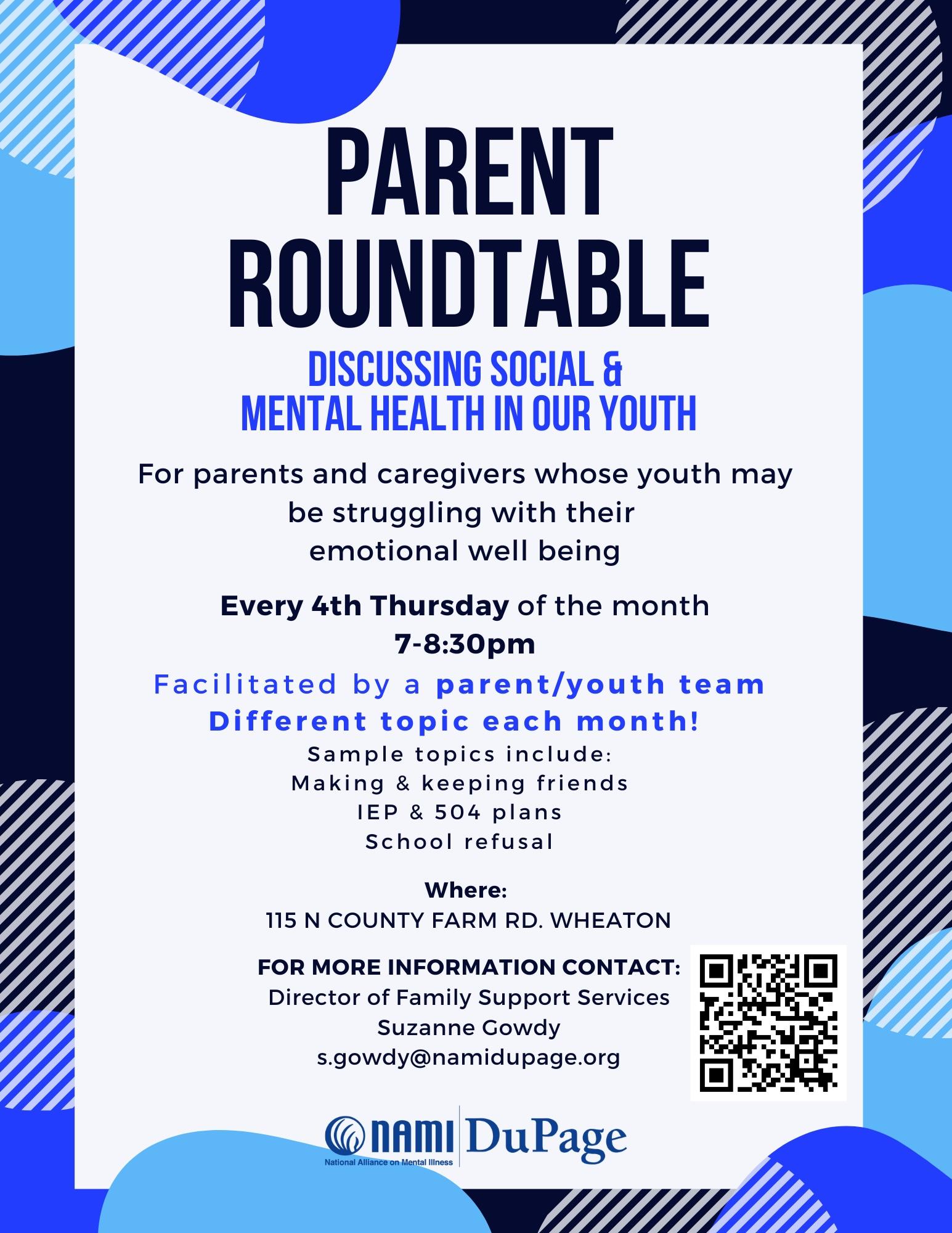 Did you know NAMI DuPage, an affiliate of the National Alliance on Mental Illness and a 501(c)(3) charitable organization, hosts a monthly Parent Roundtable?