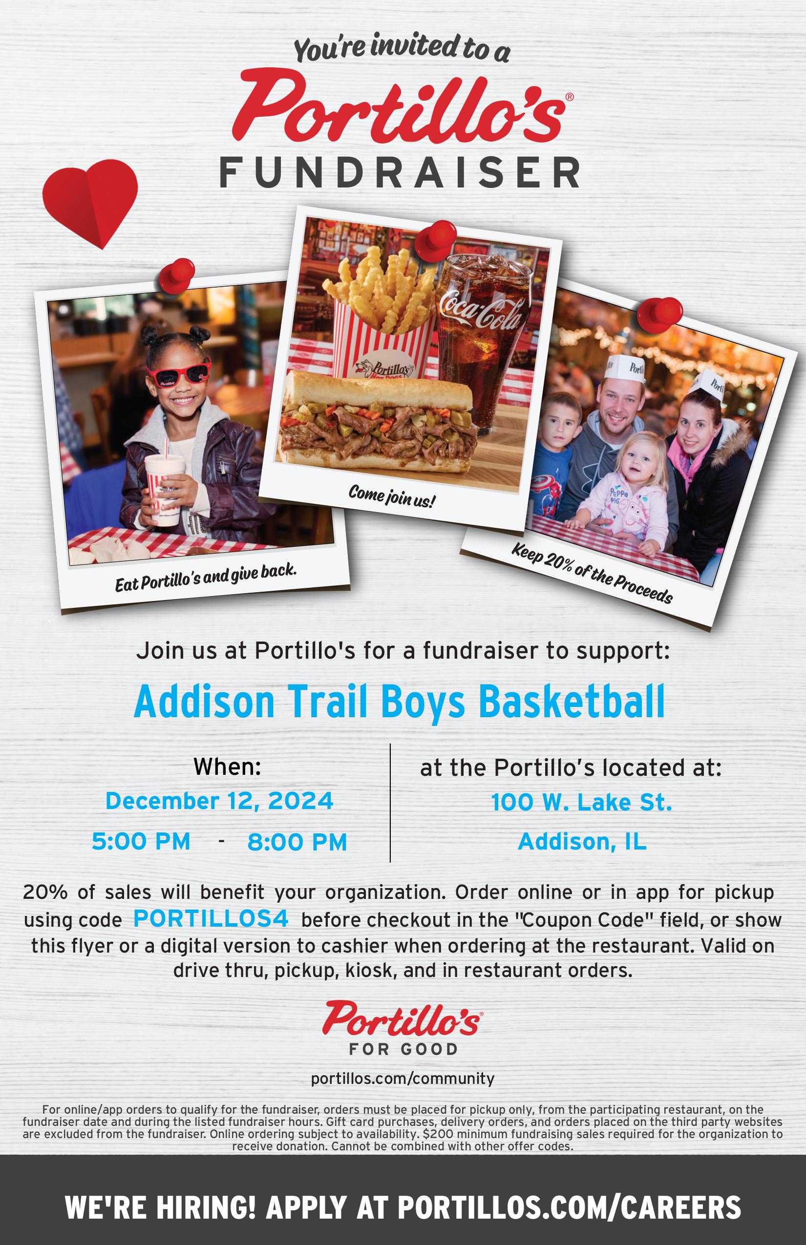 What: Enjoy a tasty treat and support the Addison Trail Boys Basketball Team with a Portillo’s fundraiser!