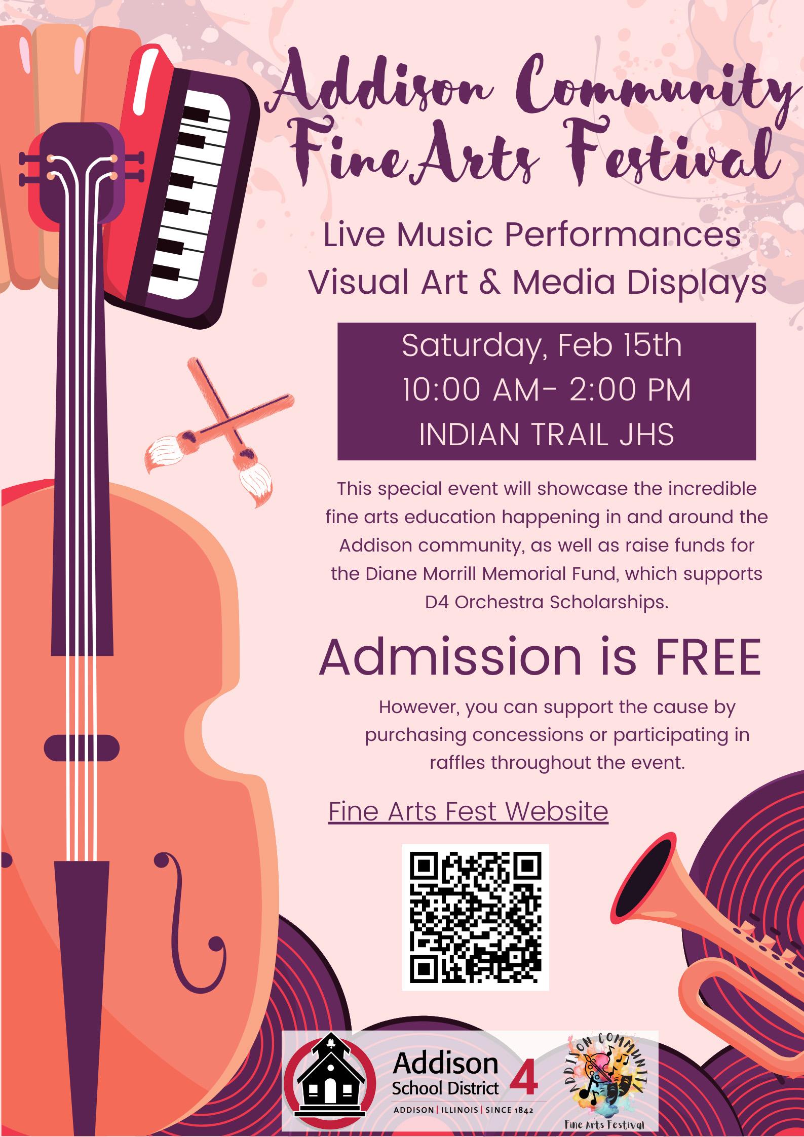 On Feb. 15, Addison School District 4 will host a Fine Arts Festival to showcase the vibrant fine arts education in and around Addison! All students, parents/guardians, alumni, staff, community members and friends are invited to attend.