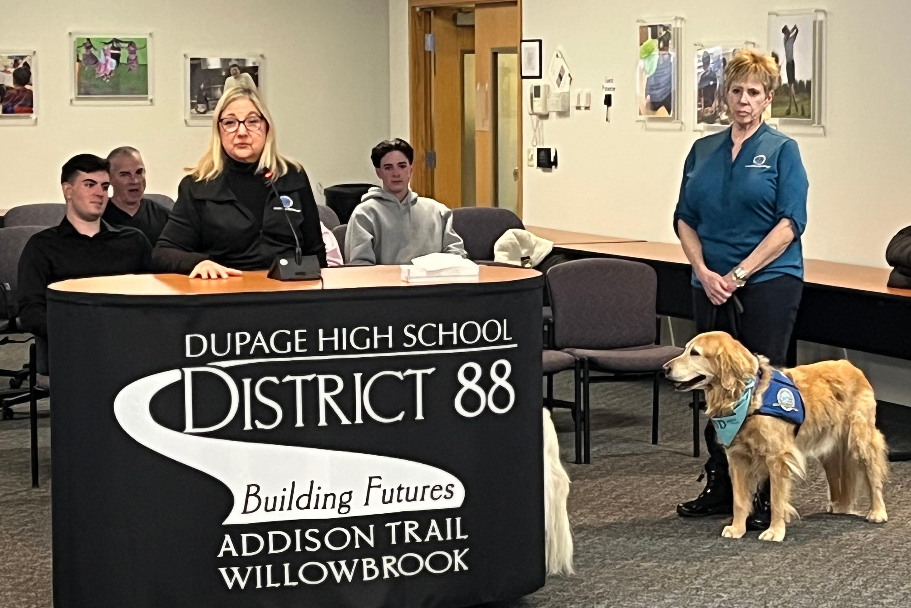 Lutheran Church Charities (LCC) K-9 Comfort Dog Ministry is a prime example of an organization working with District 88 to achieve these goals, and the District 88 Board of Education named them as a Business Partner during the Jan. 13 board meeting. To watch the presentation, click on the video above. To view photos from the recognition, see the images below.