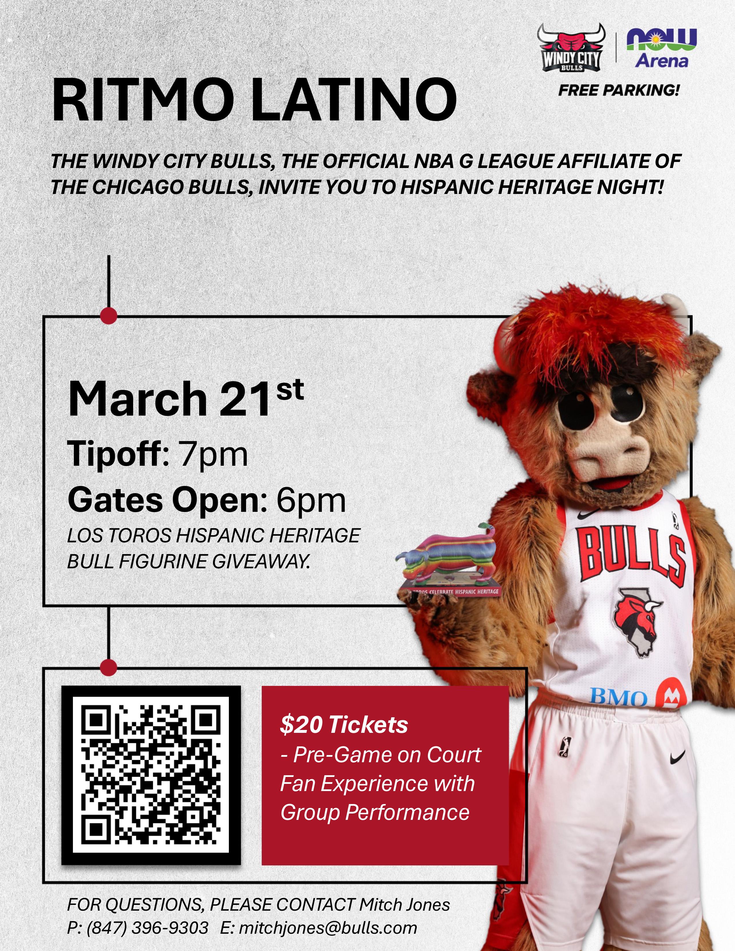 The game will take place at NOW Arena in Hoffman Estates, and doors will open at 6 p.m. Ritmo Latino will be involved in the Pre-Game On Court Fan Experience and will perform before tipoff.