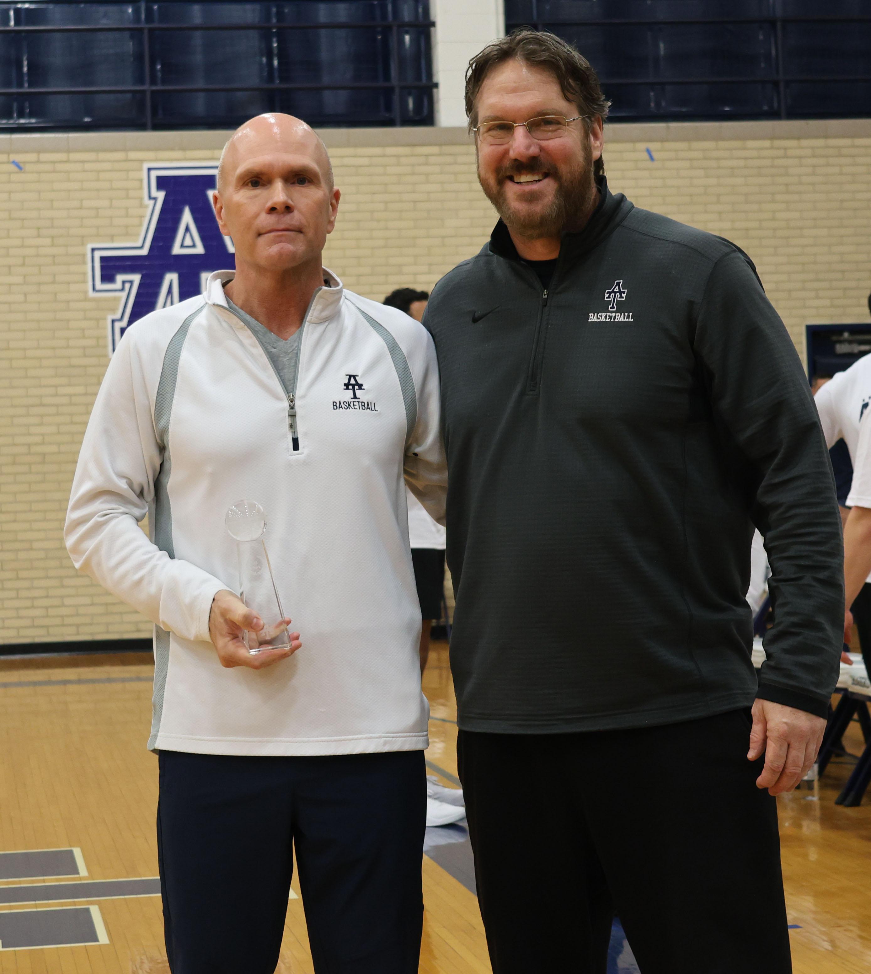 Addison Trail Boys Basketball Head Coach Brendan Lyons (right) congratulates Matt Thompson (left) for more than 30 years of service to the District 88 learning community. Thompson, who will retire at the end of the 2024-25 school year, was celebrated during the Addison Trail Boys Basketball Team Alumni Game on Feb. 15.