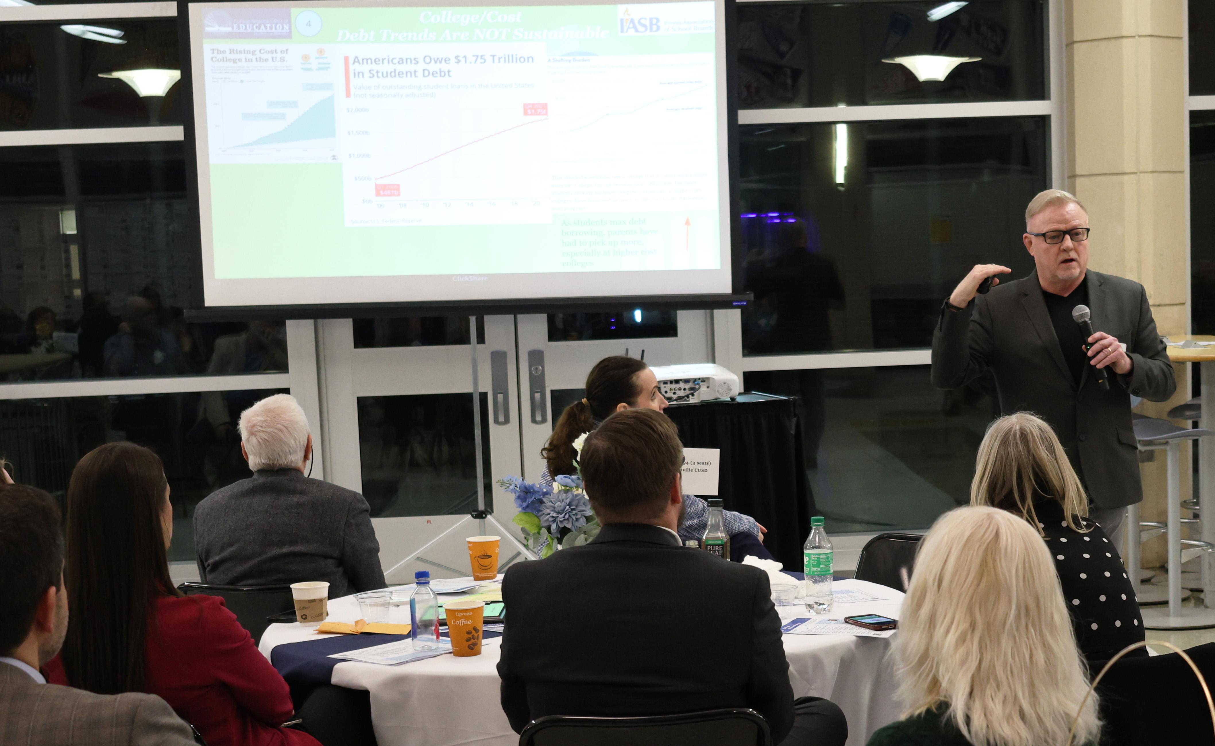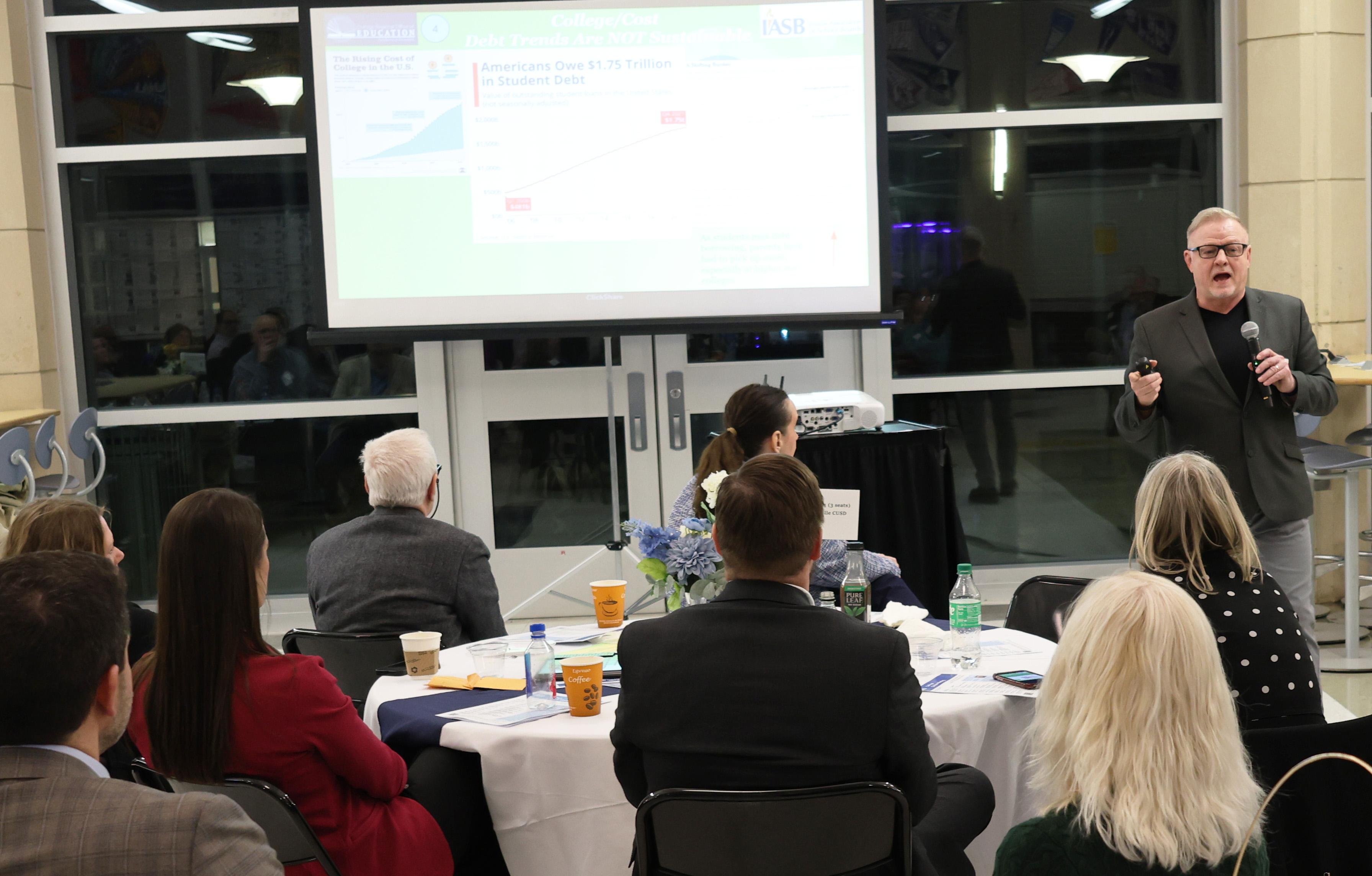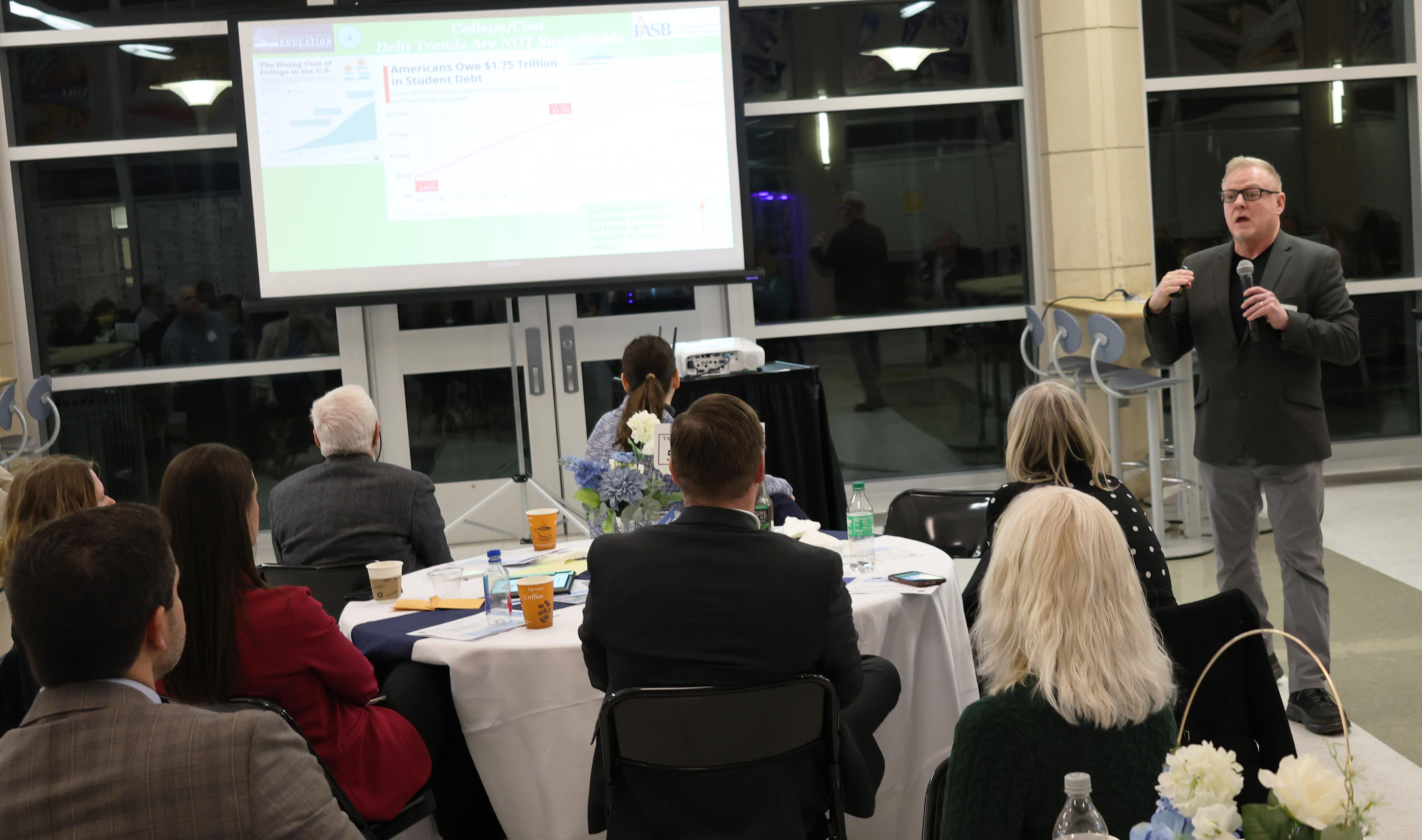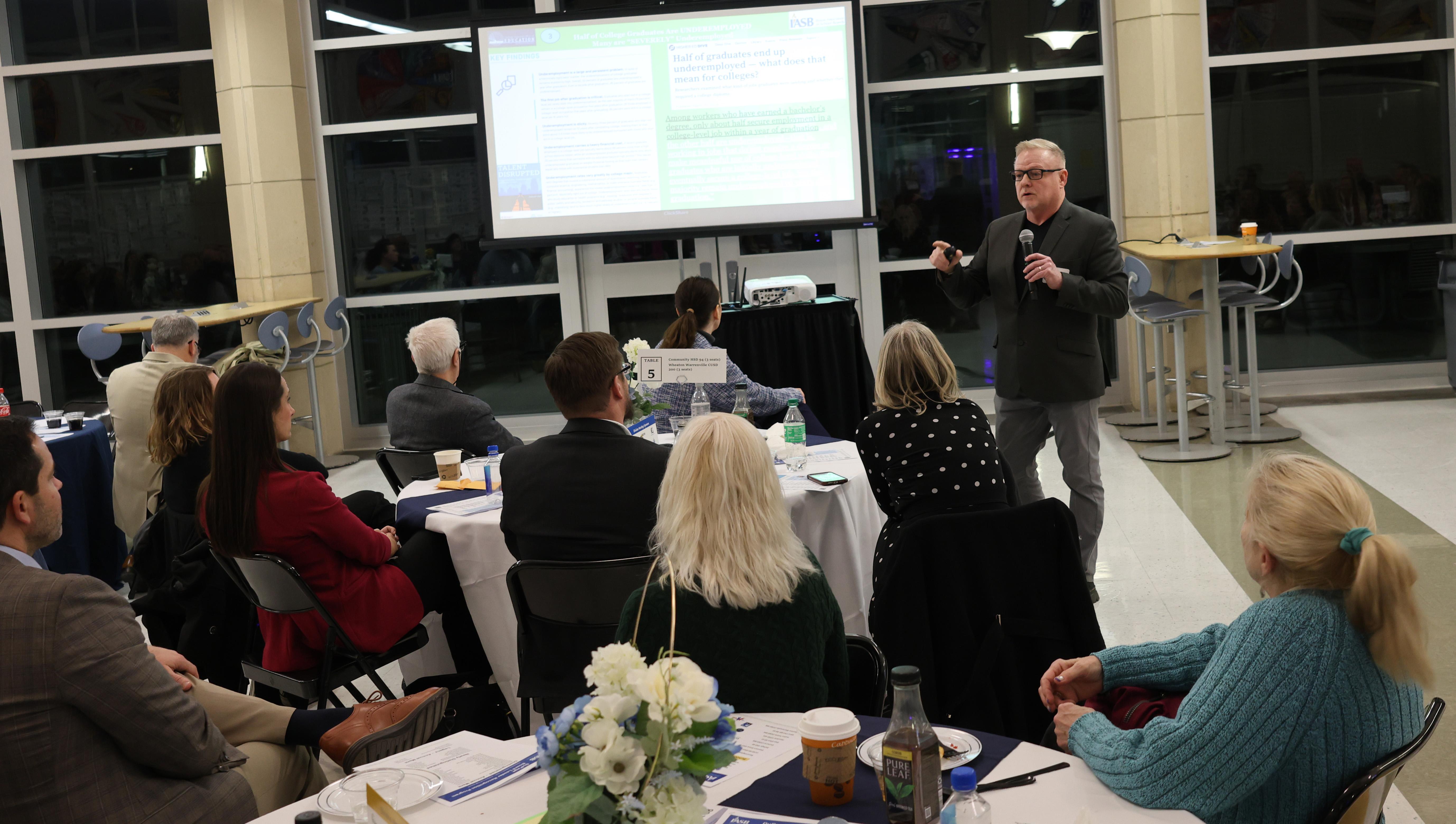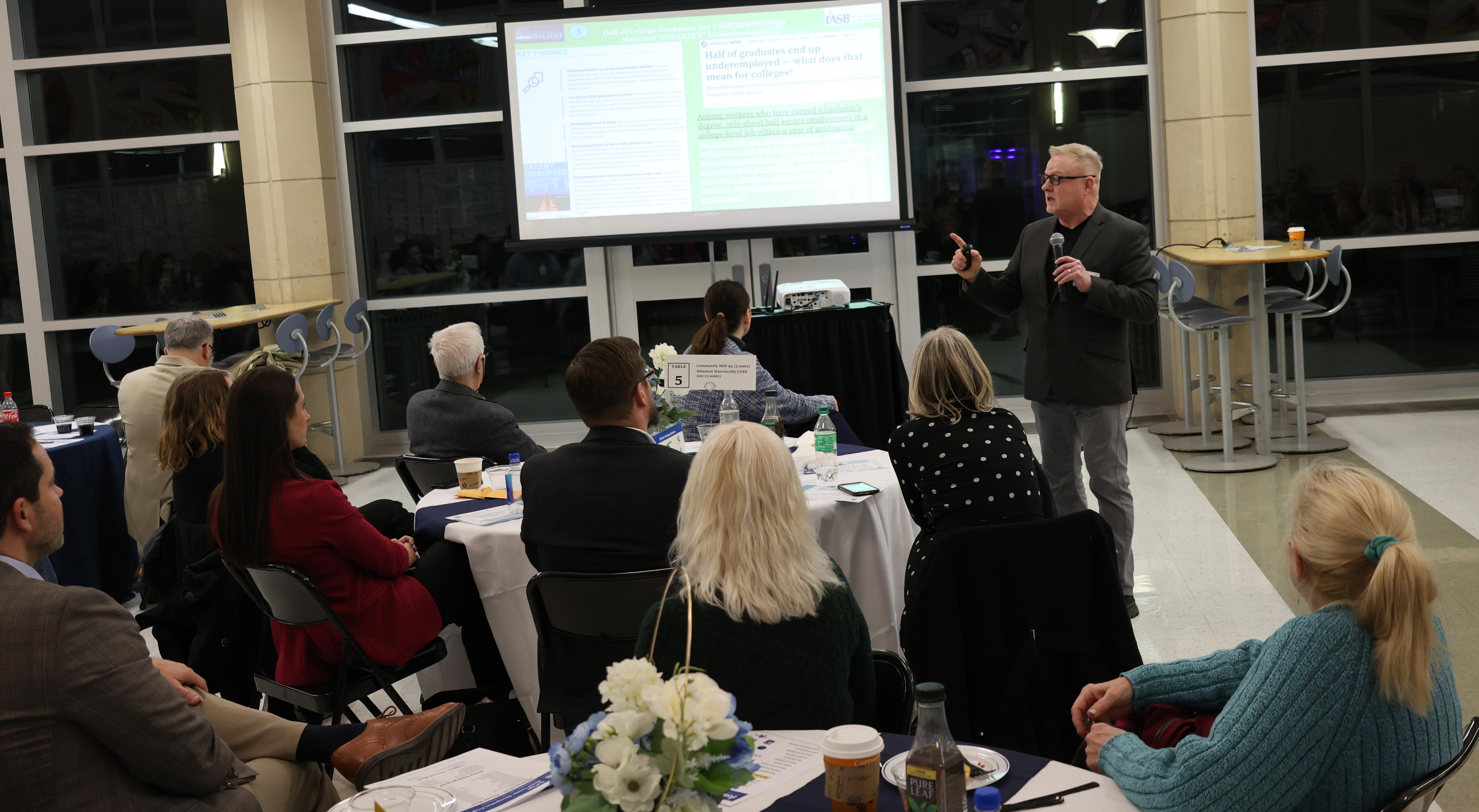 1. The keynote speaker for the evening was Ken Wallace, Ed.D., who presented on “Why and What Before Where – The Key Factors Driving Design Thinking to Prepare Students for a Changed Economy.” Dr. Wallace discussed the importance of developing a community-wide program to provide students with work-based learning experiences in a variety of pathways to help ensure they are career and college ready. He also shared information regarding implementing an individual career/return on investment (ROI) plan for each student to guide each child to a successful future.