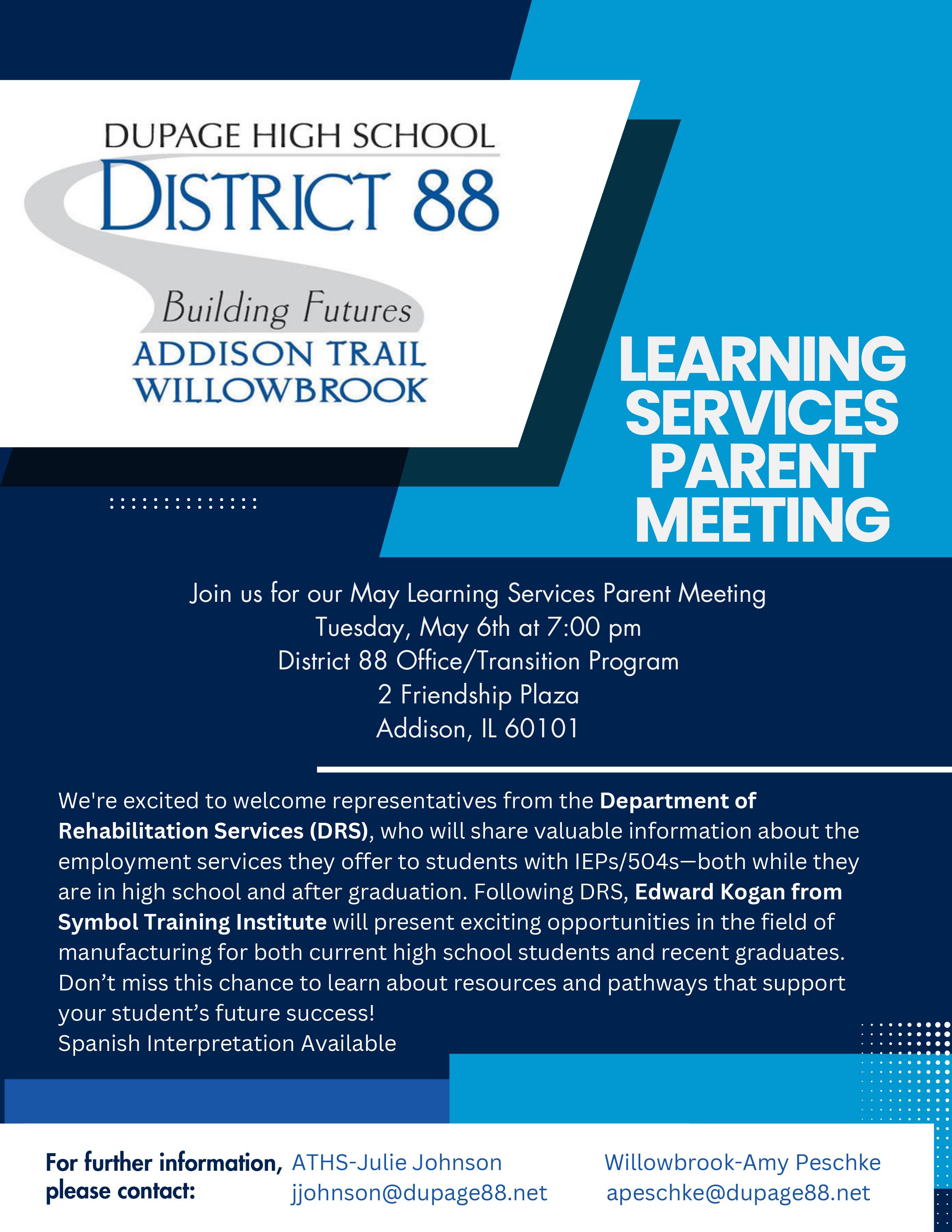On May 6, District 88 will host a Learning Services meeting for parents/guardians of Addison Trail and Willowbrook students who have an Individualized Education Plan (IEP).