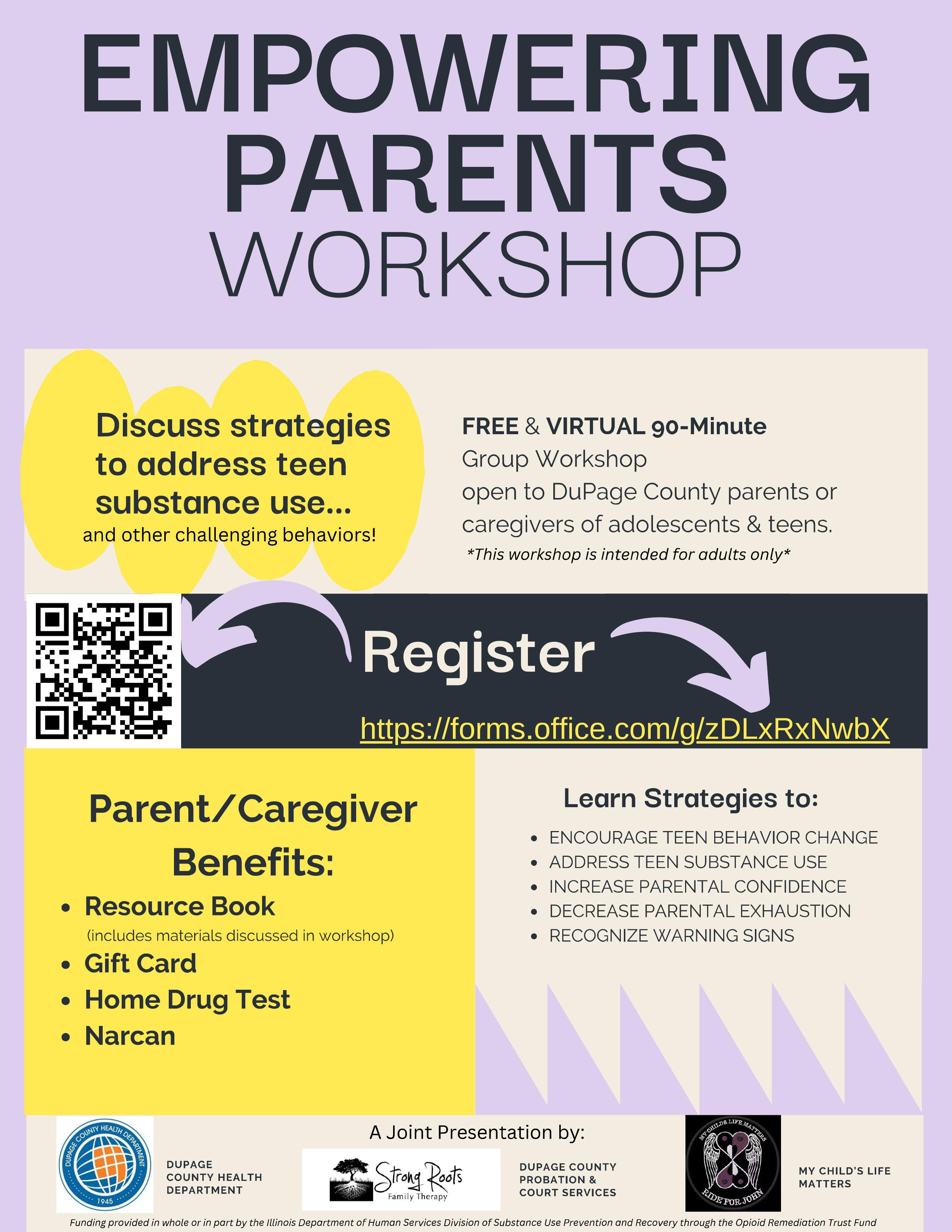 The DuPage County Health Department is partnering with Juvenile Probation to offer an Empowering Parents Workshop, designed for parents and caregivers who are concerned about their teen’s substance use behaviors.
