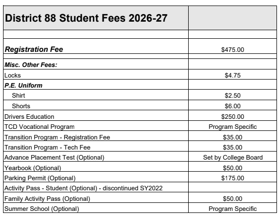 District 88 charges a flat registration fee for all students attending the district. The registration fee, along with other miscellaneous fees, are displayed below.  The registration fee covers book rental costs, general course fees, IT device fees, and other miscellaneous costs associated with attending District 88.  There are no charges for District bus transportation to and from school for students eligible for busing services.