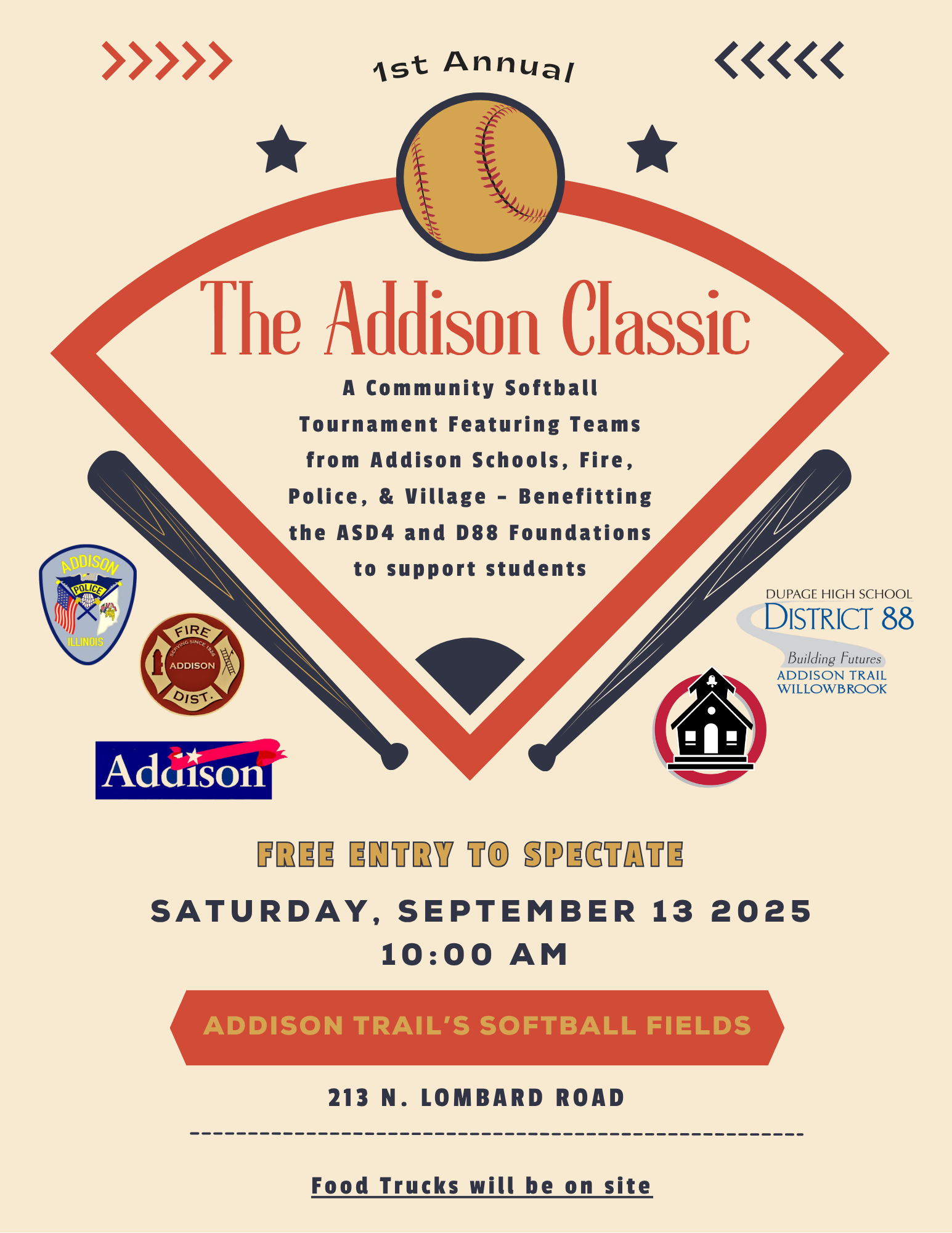 Batter up! District 88 will participate in The Addison Classic, a community softball tournament featuring teams from Addison schools, the Village of Addison, the Addison Police Department and the Addison Fire Protection District.