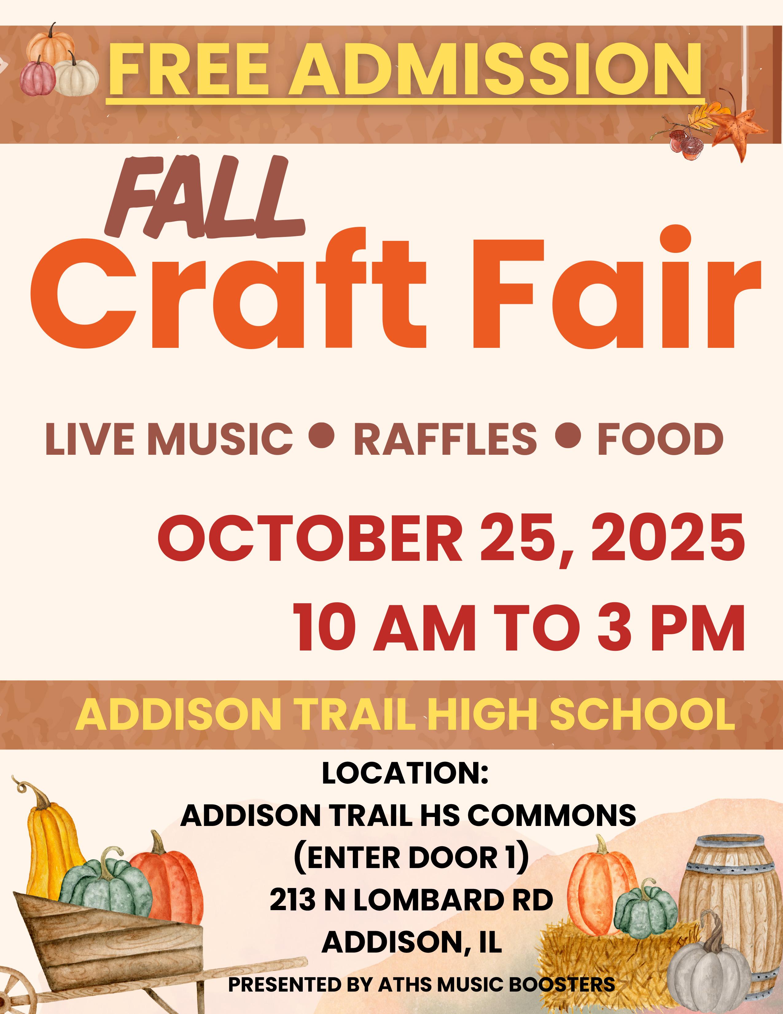 The Addison Trail Music Booster Club invites all students, parents/guardians, alumni, staff, community members and friends to attend a Fall Craft Fair! See the details below.