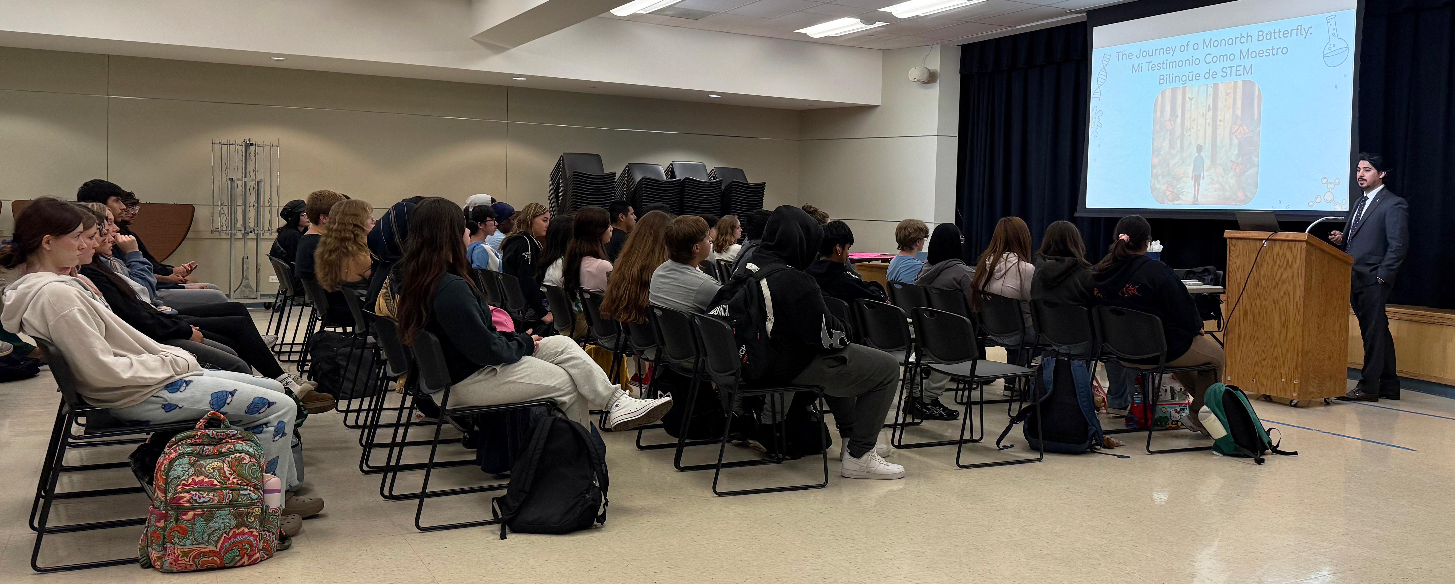 On Oct. 7, Víctor Gómez (Addison Trail alumnus, class of 2012) met with students. Gómez, pictured above, is the Illinois State Board of Education (ISBE) 2025 Illinois Teacher of the Year. He is a bilingual chemistry teacher in Leyden High School District 212 and a leader in advancing bilingual education. To read more about Gómez, go to www.dupage88.net/WBCareerPresentationsOctober2025 and https://www.dupage88.net/site/page/16859.