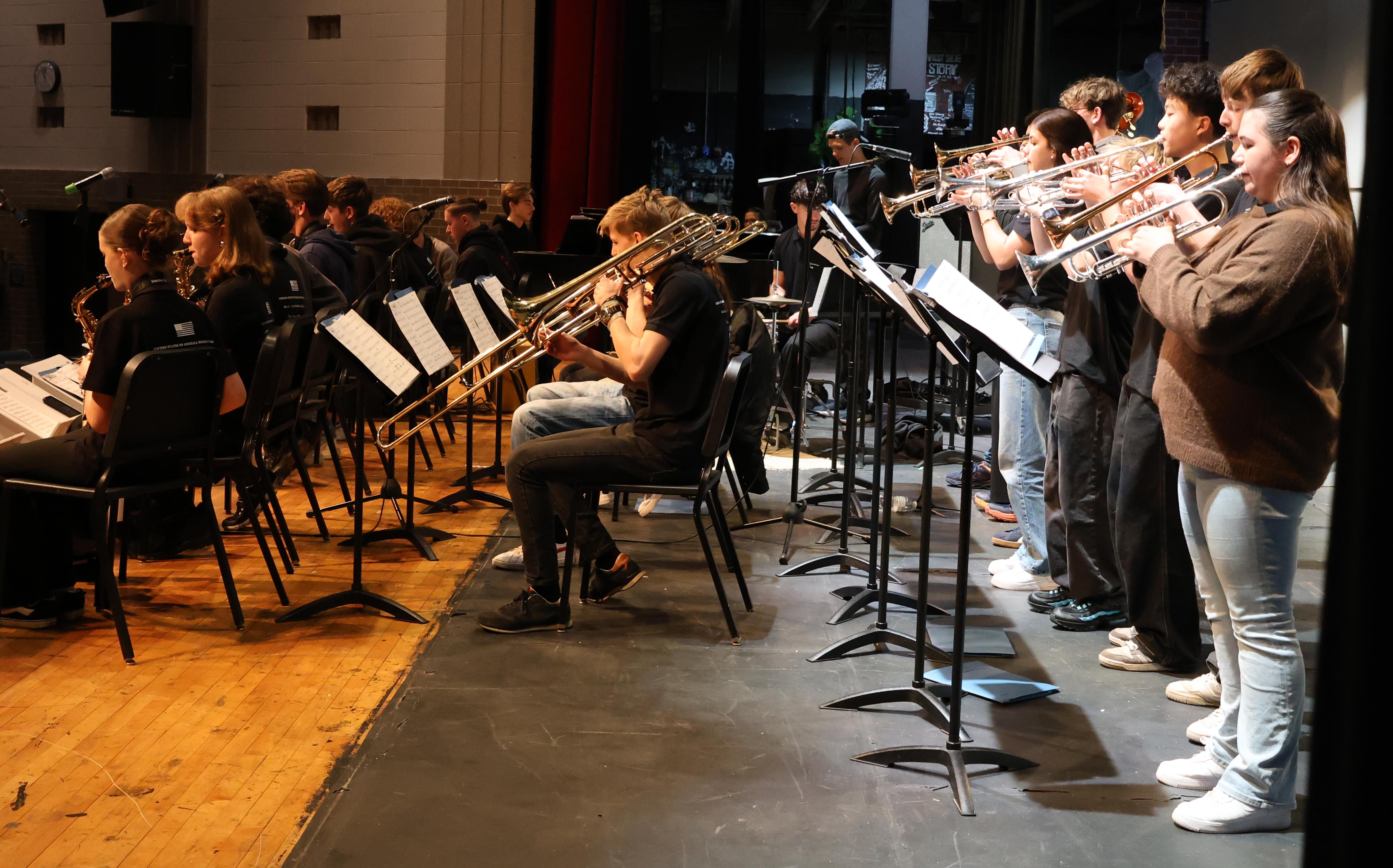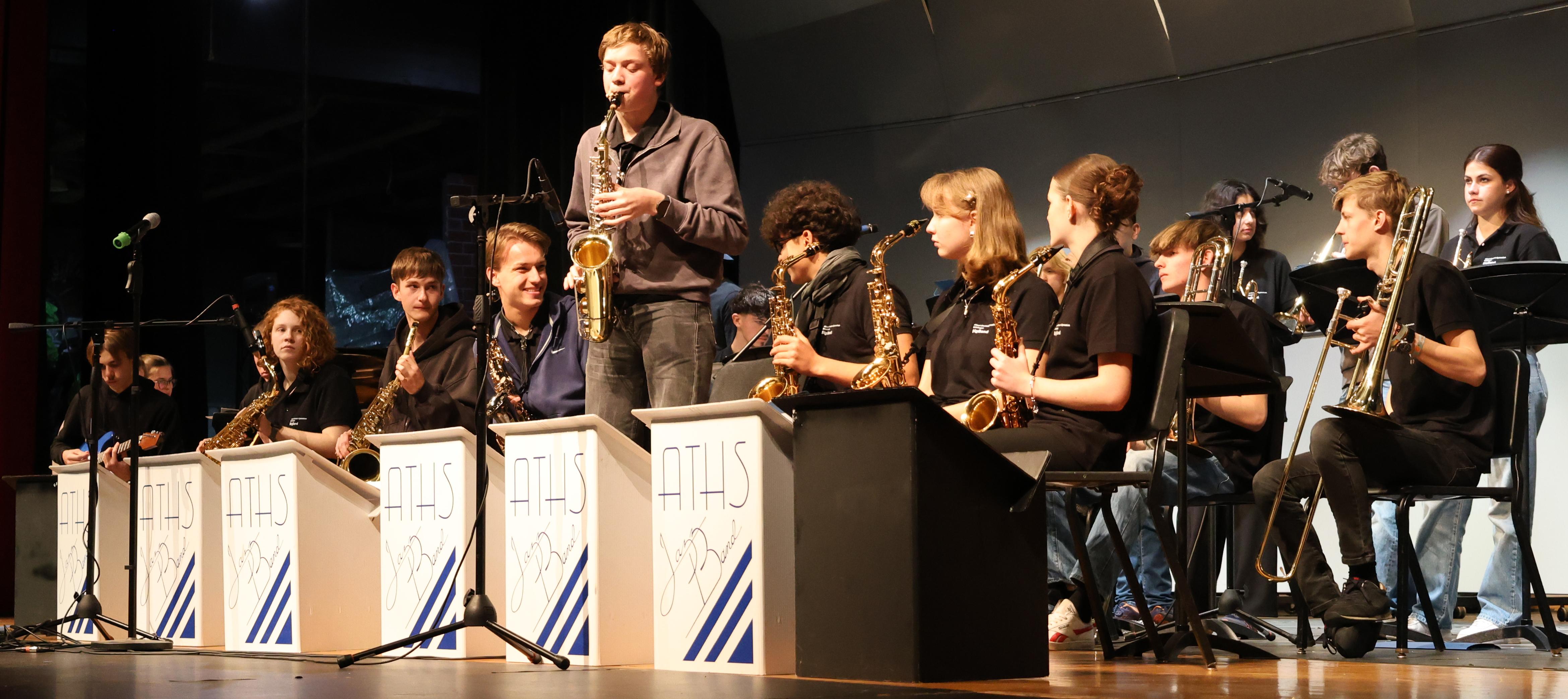The Jazz Ensemble from Albert-Einstein-Gymnasium (AEG) in Böblingen, Germany, performed 12 pieces of music for about 150 students. The genre of music played showcased jazz and Latin jazz.