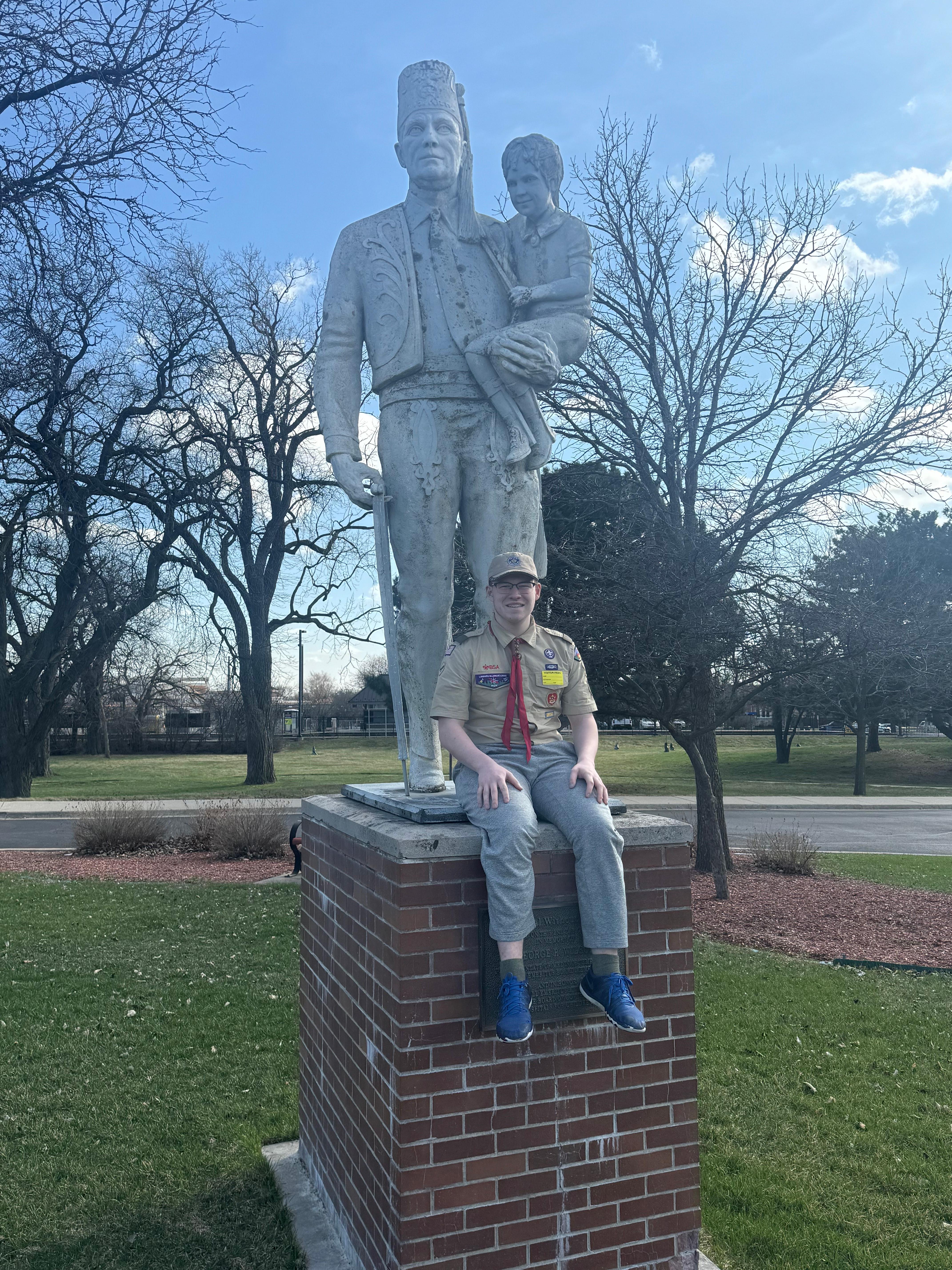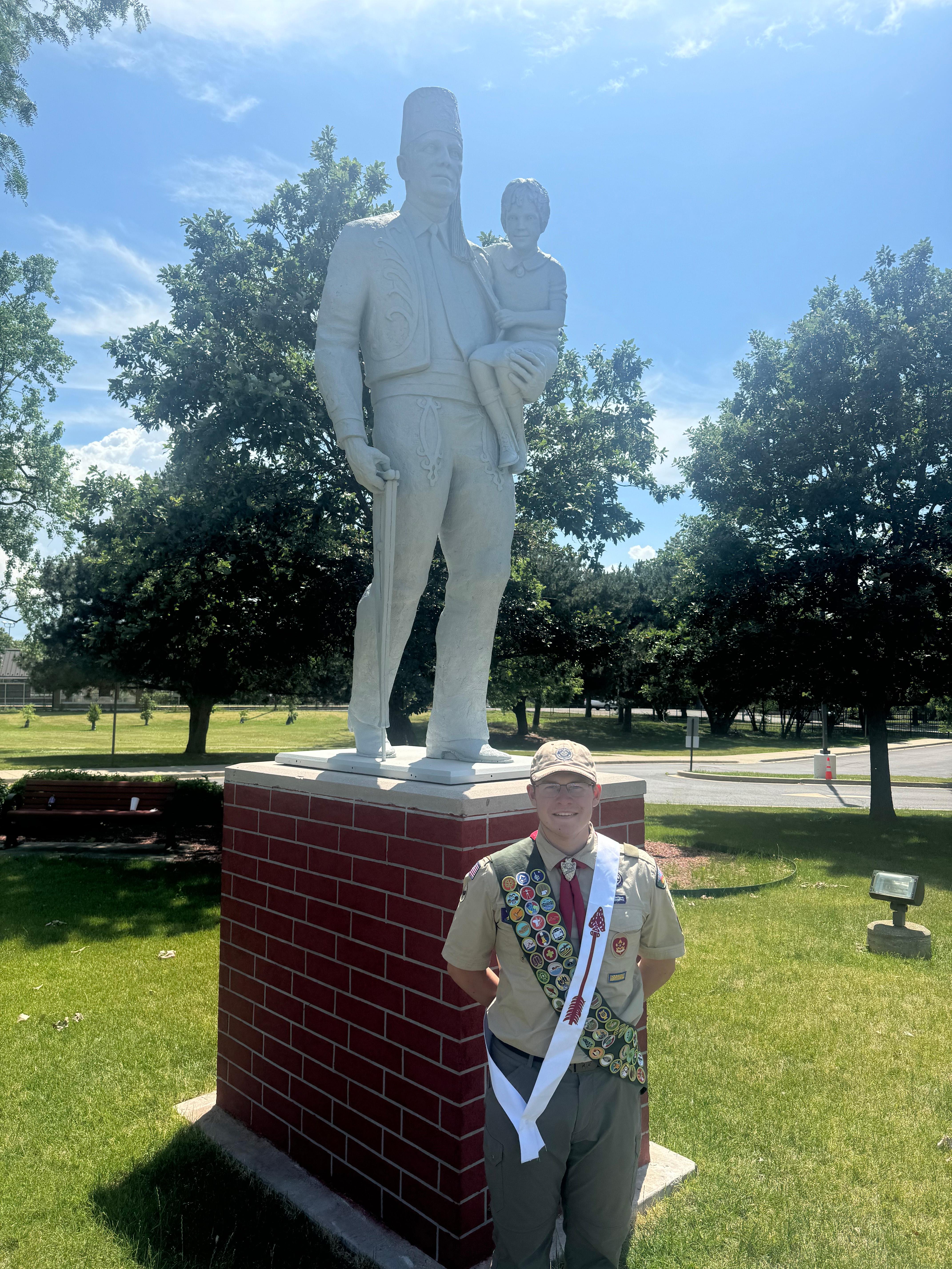 For his Eagle Scout project, Medinger restored a six-foot-tall statue at Shriners Children’s Chicago. The statue, which sits on a brick pedestal that’s 64 inches high and 48 inches wide, is a symbol based on a newspaper photo taken in 1970. That photo, known as the “Editorial without Words,” shows a Shriner carrying a child and her crutches. Medinger said it took 14 months to plan, fundraise and execute the project. He raised $1,100 to repair the damaged brick base and weathered statue. Medinger said he was able to complete the work with the help of 24 people, who volunteered more than 150 hours.