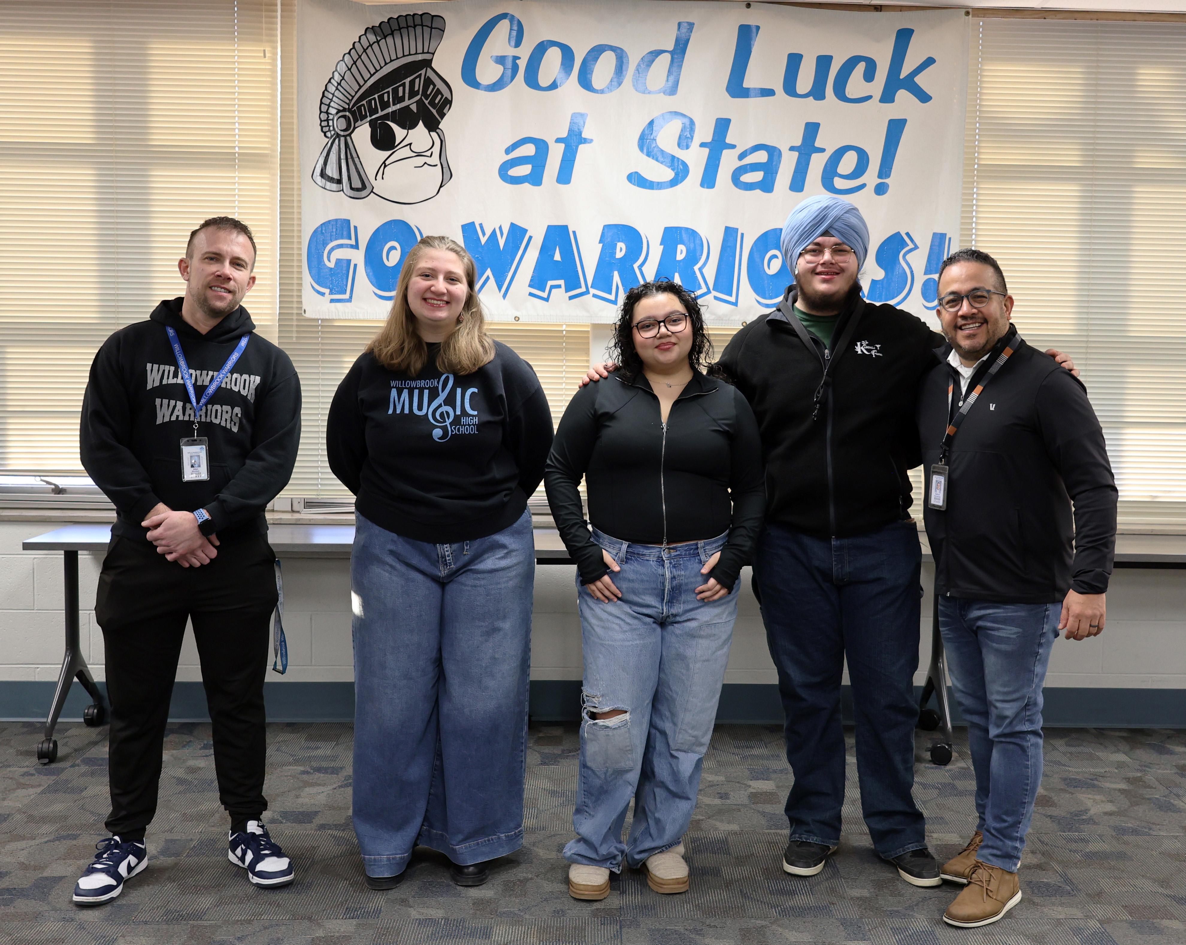 Willowbrook Band Director Allan Rendak (left) and Willowbrook Choir Director Belford Hernandez (right) pose with Willowbrook students who were named as All-State Musicians by the Illinois Music Education Association (ILMEA). They are (from left) junior Christina Legutki, senior Isabel Weaver and senior Malachy Heneghan. On Jan. 28, Willowbrook hosted a State send-off celebration for the students.
