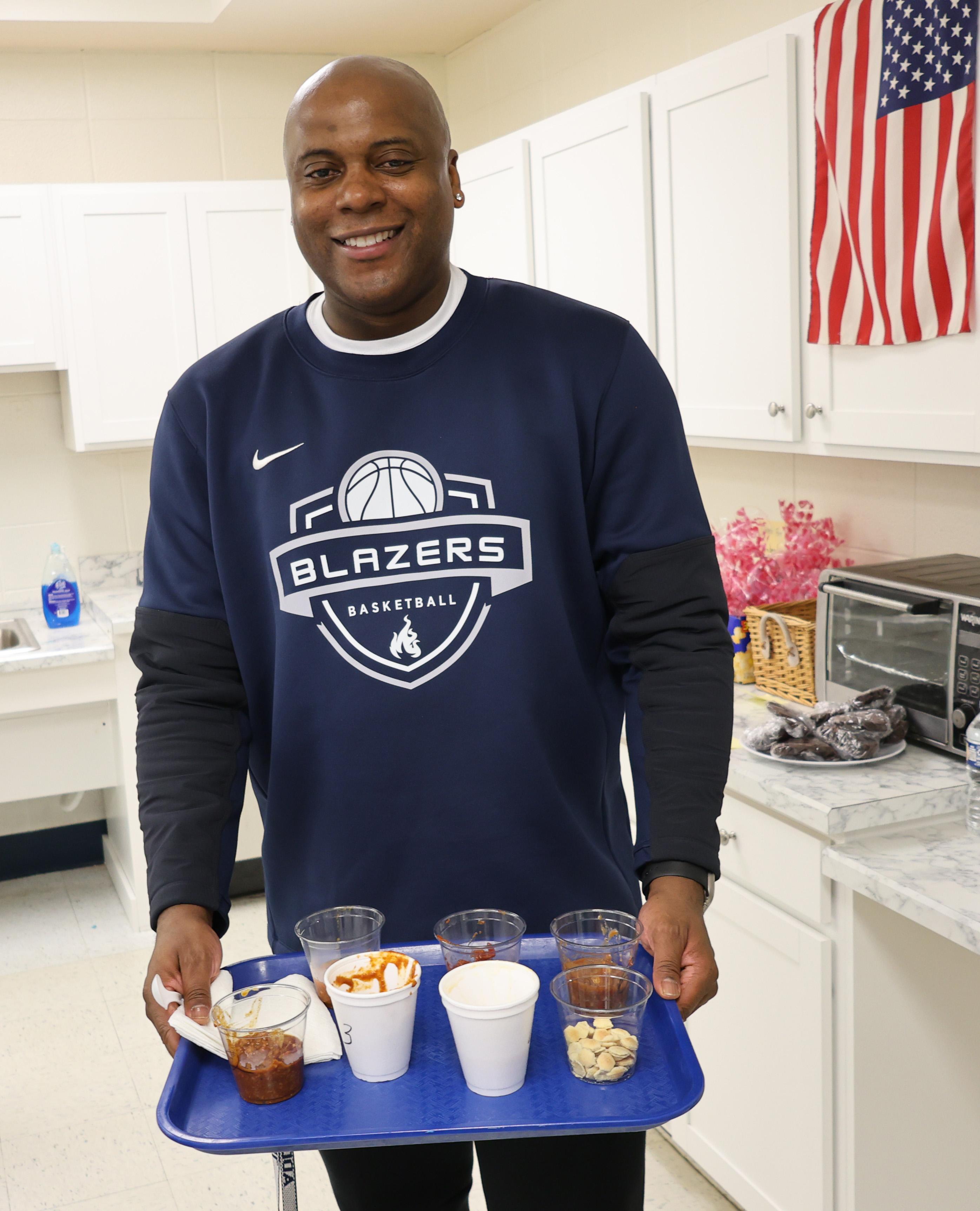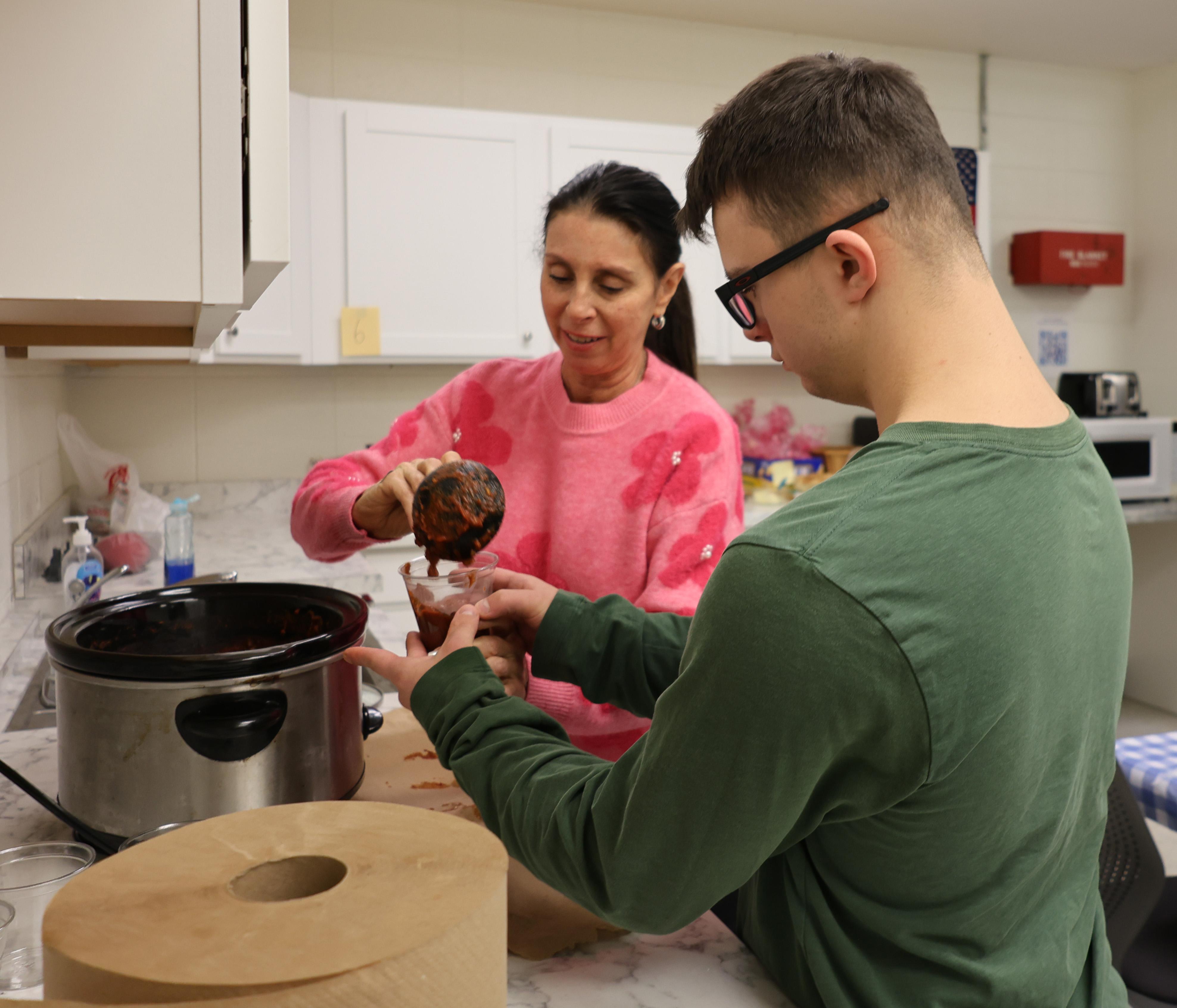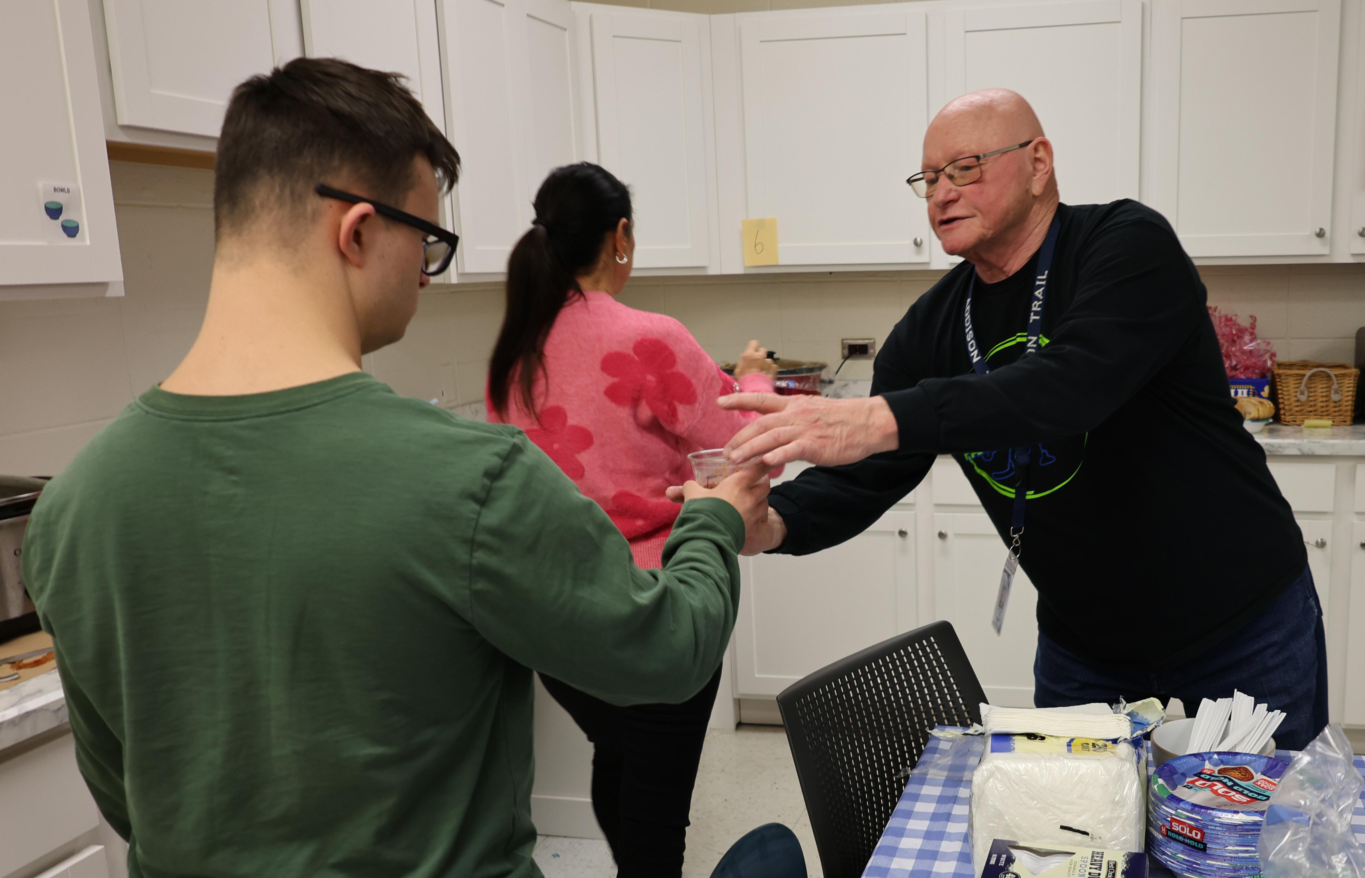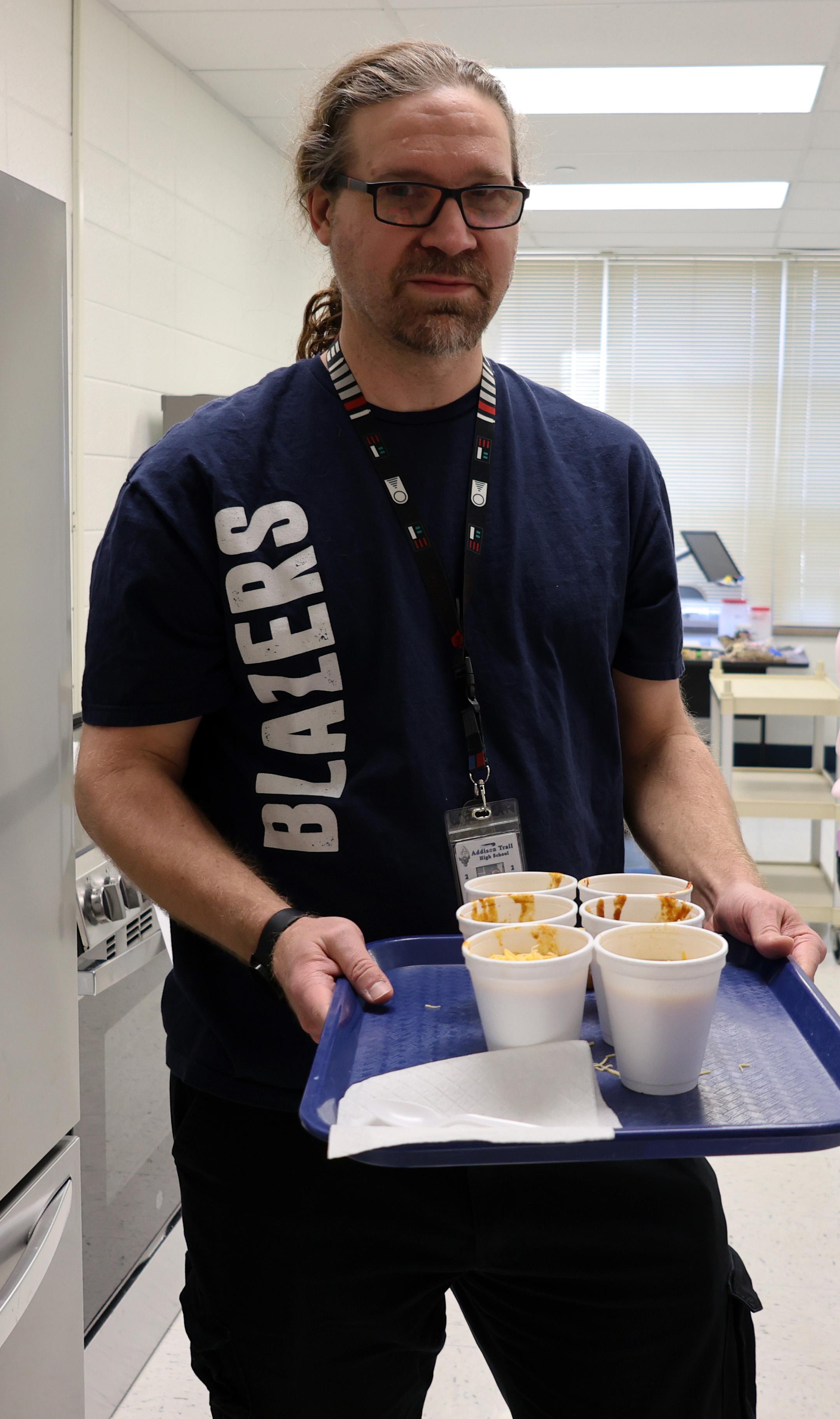 Six Addison Trail staff members (Chris Bazant, Michael Kennedy, Bob Carlson, Kelly Downer, Nick Pingel and Freddy Crone) made their best chili, which was available for other staff members to buy. Cookies (made by Jessica Murphy) and candy bags (prepared by Laura Weinbrenner) also were an option. Students in the School to Work and Link 1 classes helped as well, by making cornbread, promoting the event and taking payments.