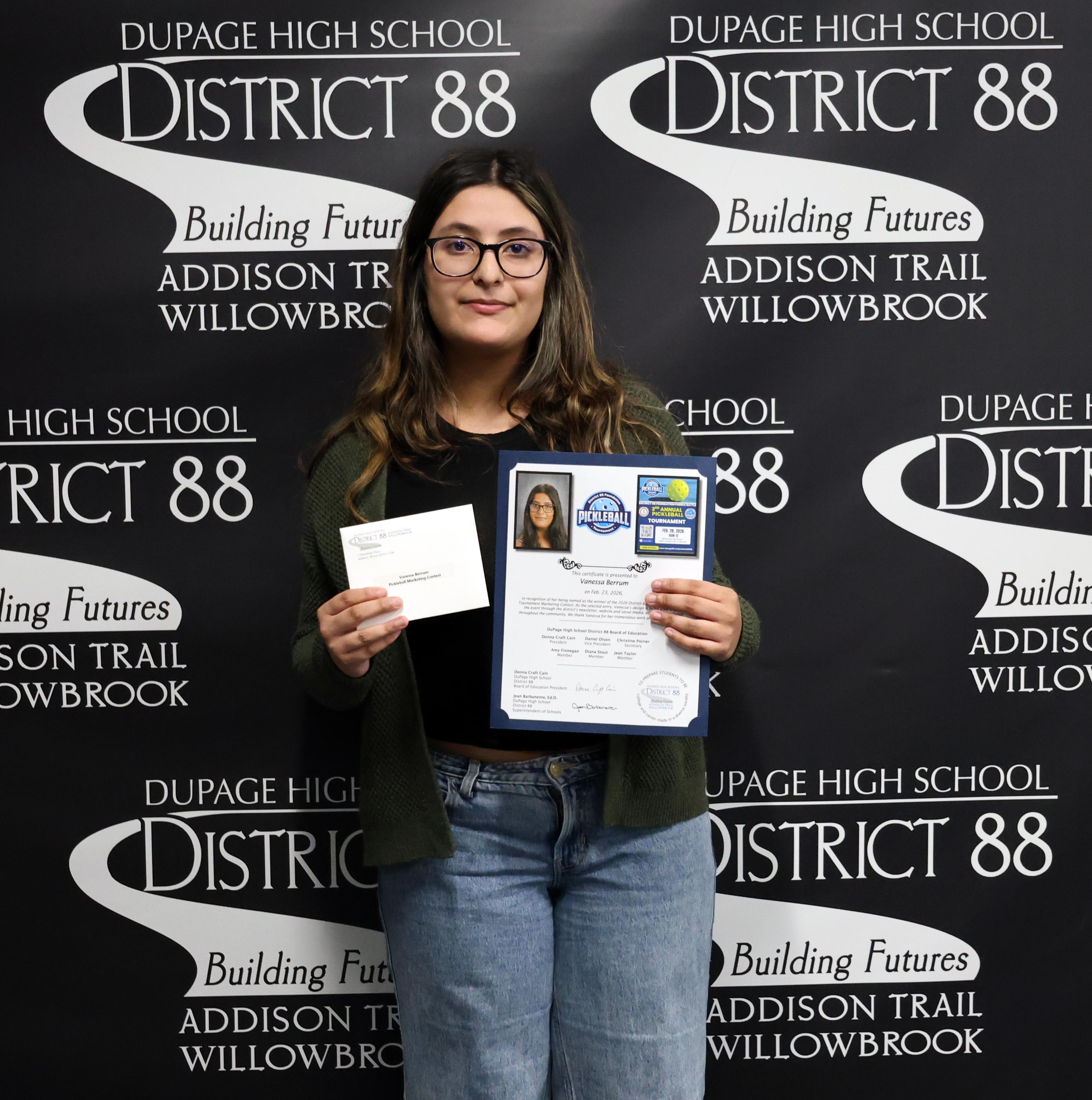During its Feb. 23 meeting, the District 88 Board of Education, along with the administration, congratulated and recognized Addison Trail junior Vanessa Berrum (pictured above) on being named as the winner of the 2026 District 88 Foundation Pickleball Tournament Marketing Contest.