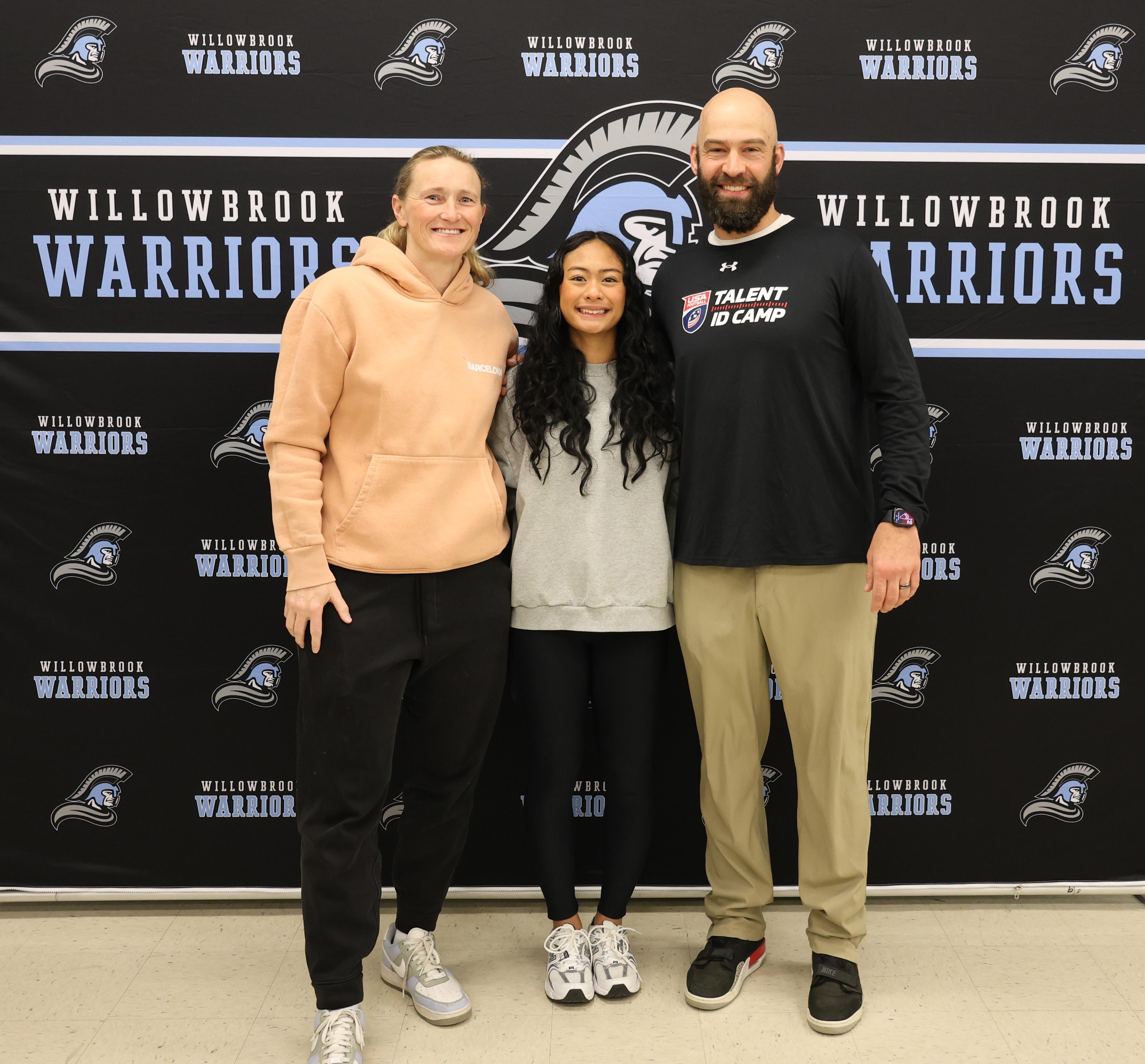 On March 17, Willowbrook hosted a National send-off celebration to recognize and honor senior Leigh Bernardo (pictured above, with Willowbrook Girls Flag Football coaches Rachel Karos and Nick Hildreth).