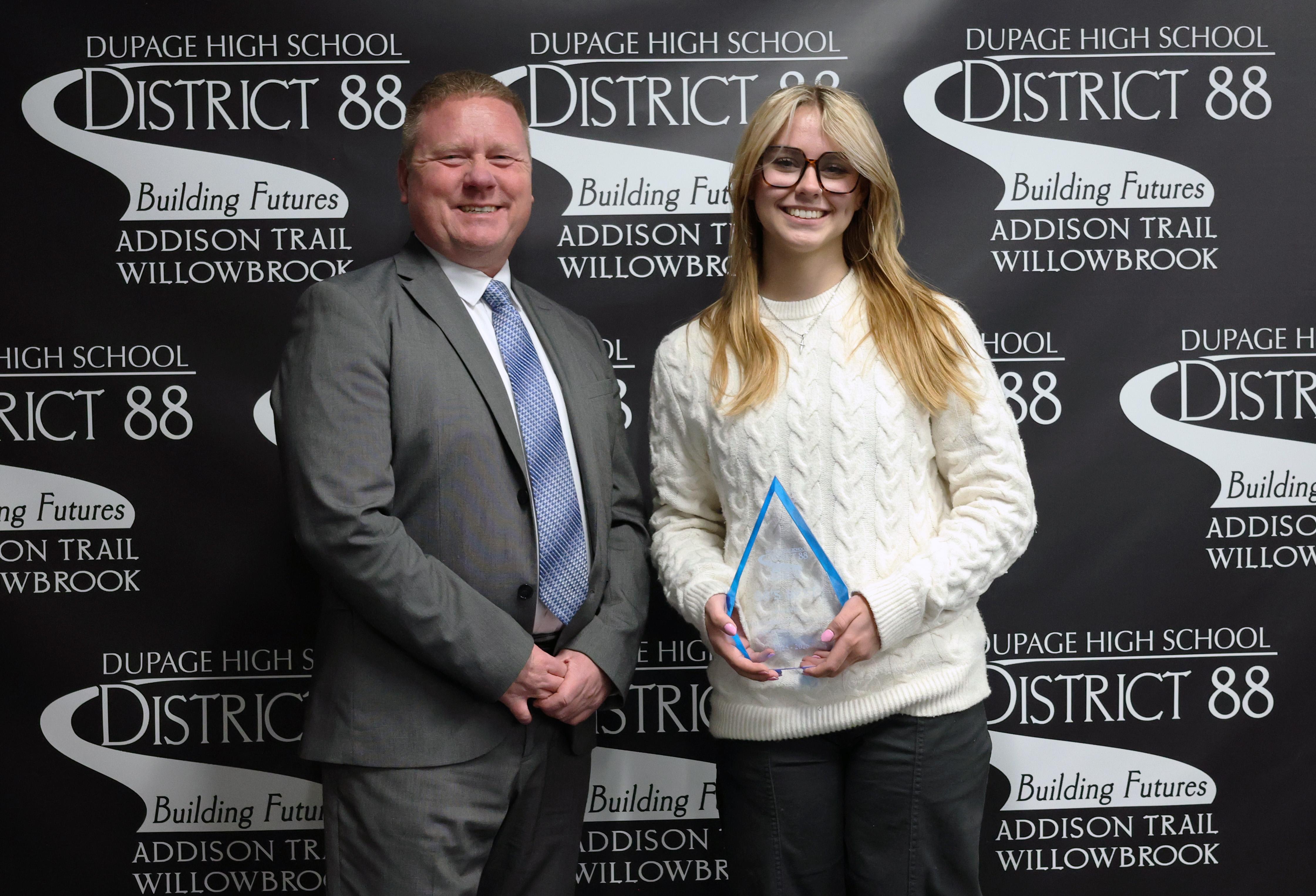 Emily Hanson (pictured at right, with Willowbrook Principal Dr. Daniel Krause) has been named as Willowbrook’s March recipient of 88’s Best recognition for her outstanding work in the performing arts/electives.