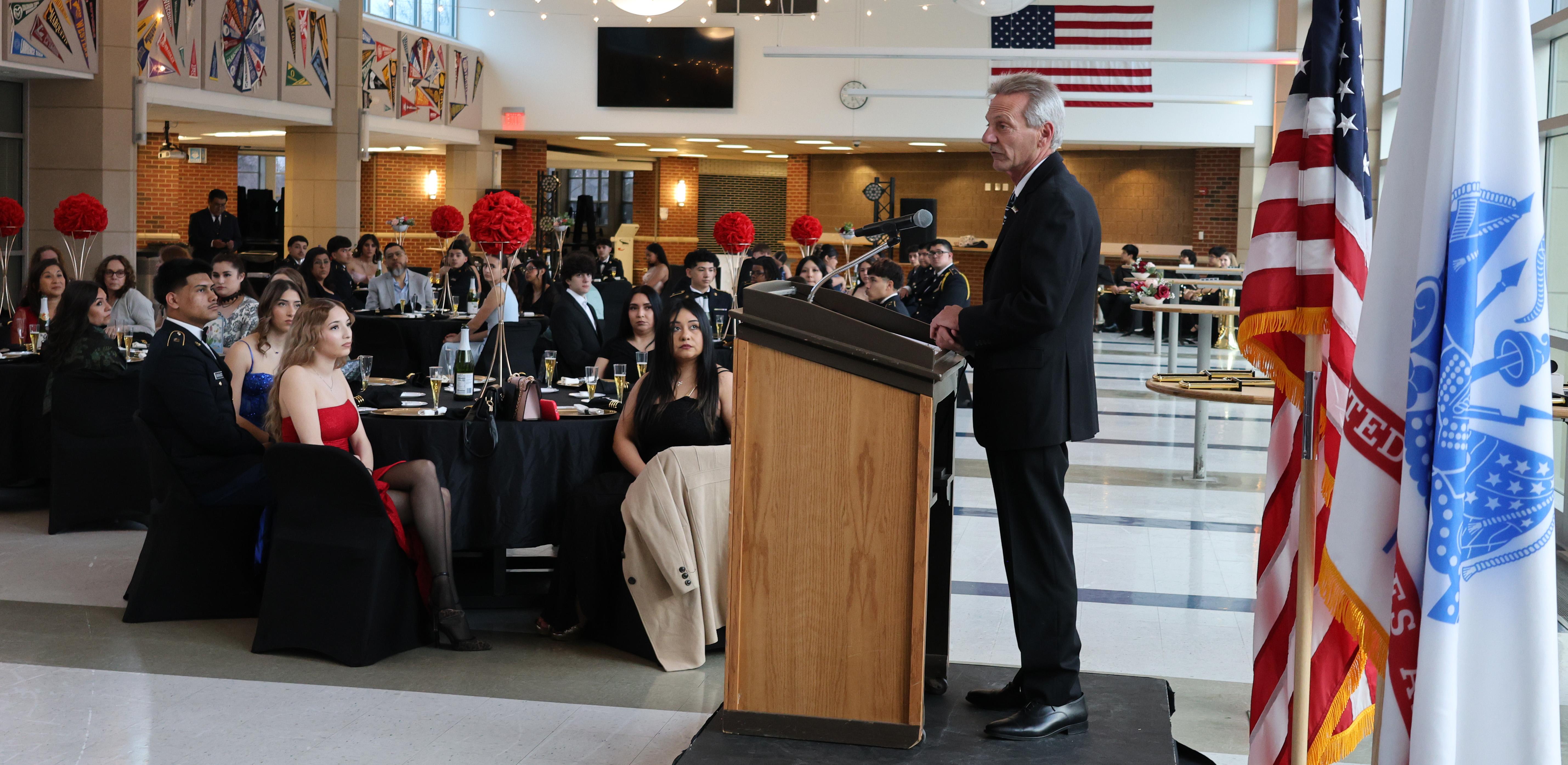 During the evening, Addison Trail JROTC instructor MSG William E. Jones and Battalion Commander C/LTC Sophia Barragan (a senior at Addison Trail) welcomed those in attendance after they entered through a reception line; Village of Addison Mayor and military veteran Tom Hundley served as the guest speaker and congratulated the cadets on their dedication to leadership, community service and civic responsibility; and several cadets made celebratory toasts with sparkling cider.