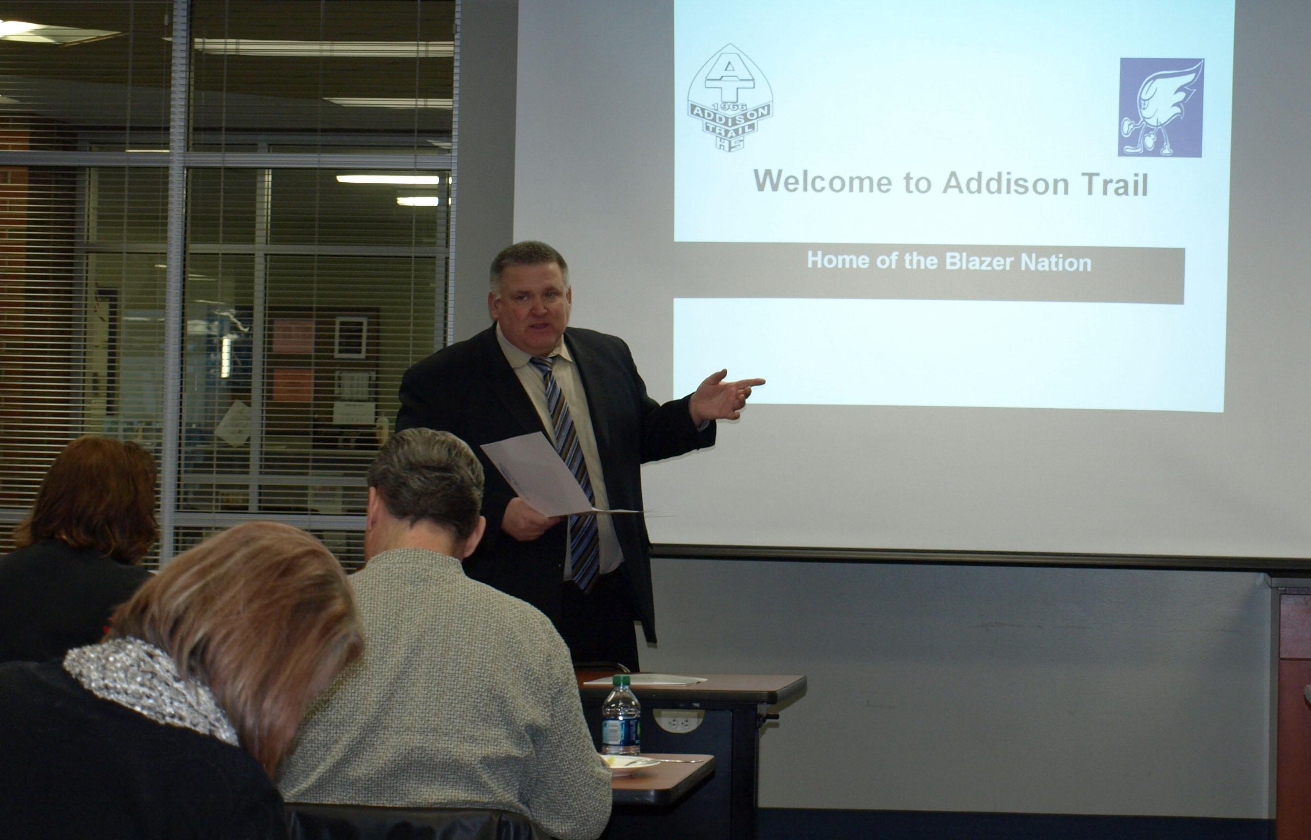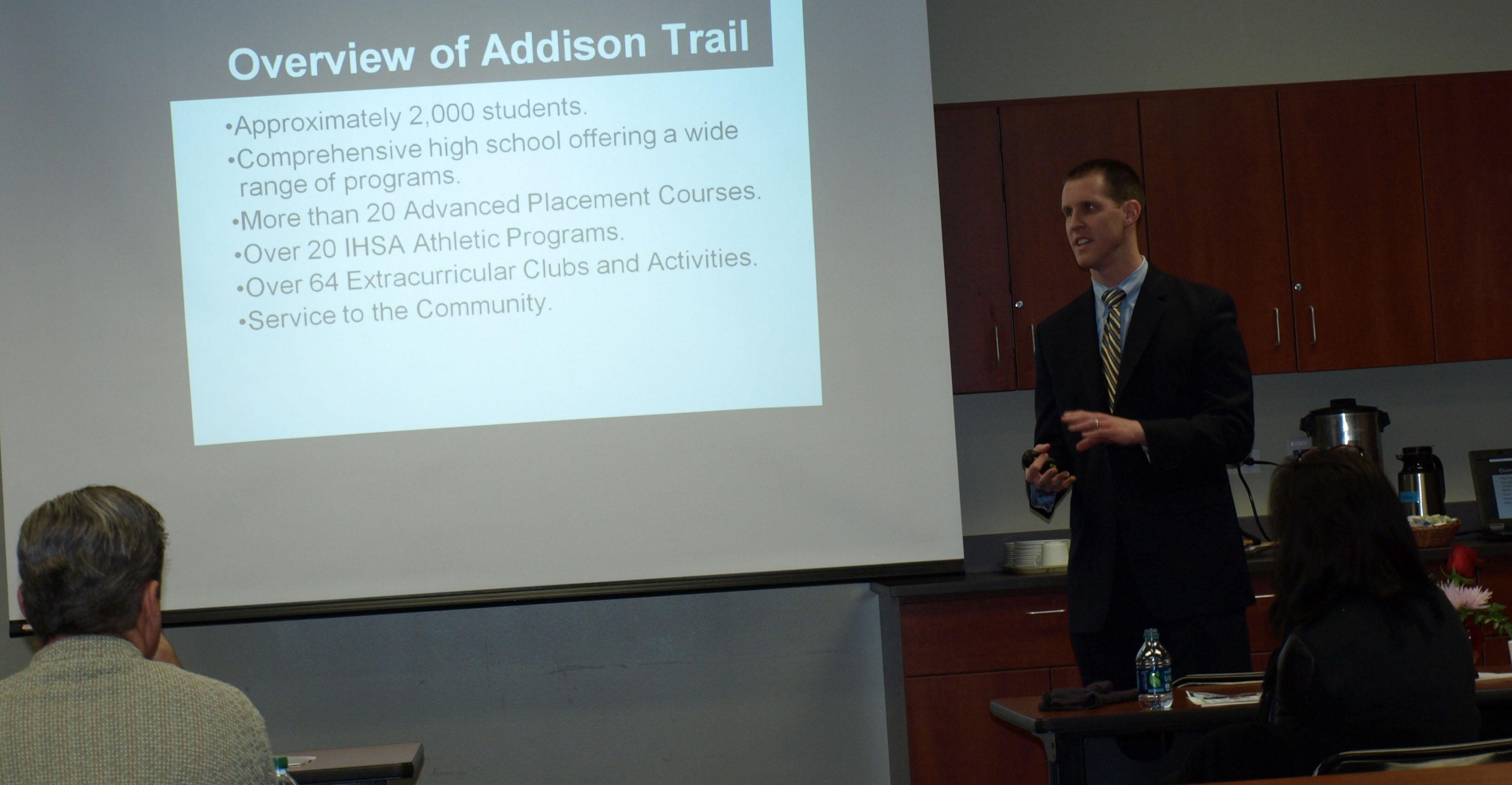 During the event, District 88 Superintendent Dr. Scott Helton, Addison Trail Principal Adam Cibulka, members of the District 88 Board of Education and Addison Mayor Rich Veenstra shared successes of the village, district and school. Real estate agents also were able to hear from students (junior Ariel Murphy, senior Genesis Garcia and senior Bret Novak) and a staff member (teacher Enza Spilotro) what they enjoy about Addison Trail, and each participant was given a video about the district to share with potential homeowners in the area.