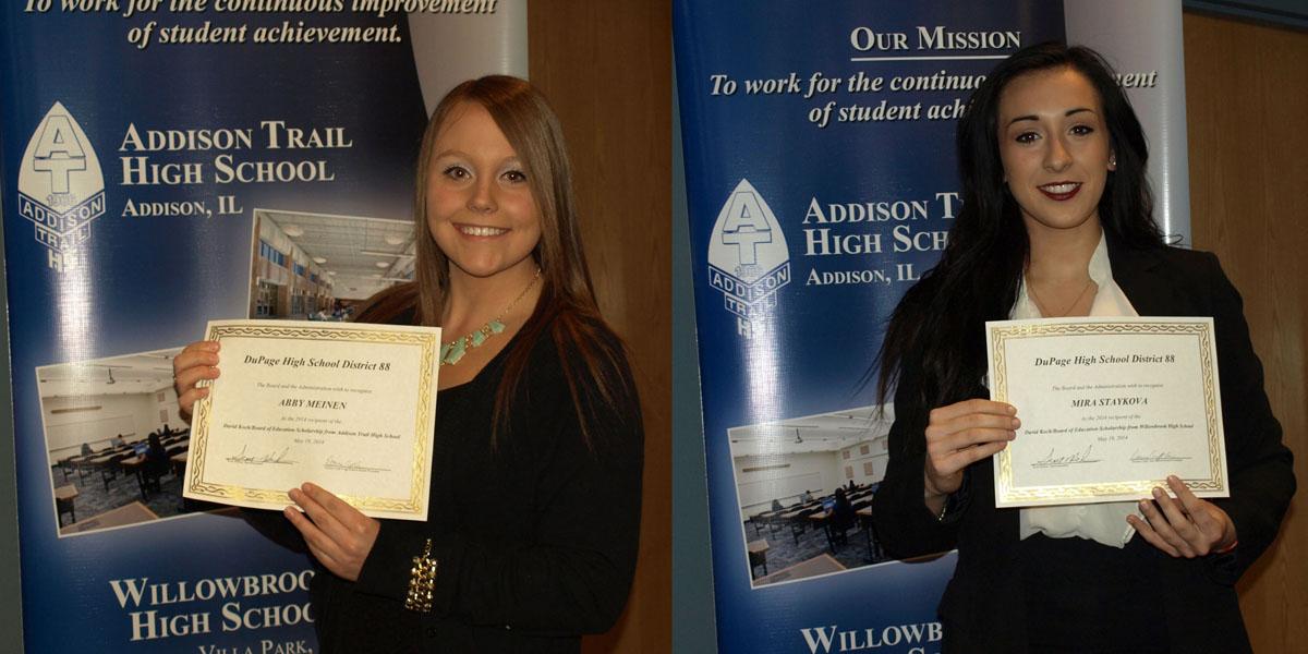 Addison Trail senior Abby Meinen and Willowbrook senior Mira Staykova are the recipients of the David Koch Board of Education Scholarship for 2014.