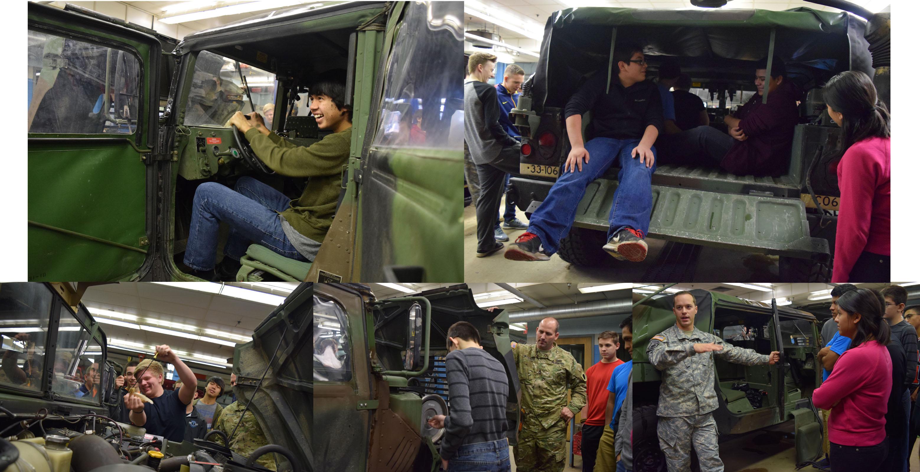 Staff Sgt. Mike Vertucci, a recruiter with the Illinois Army National Guard, and Sgt. 1st Class Josh Wittenauer, a team leader for recruiting command, spoke to automotive classes about the vehicle. Students were able to check the oil, transmission fluid and air filter on the HMMWV, as well as sit in the driver’s seat to look around inside.