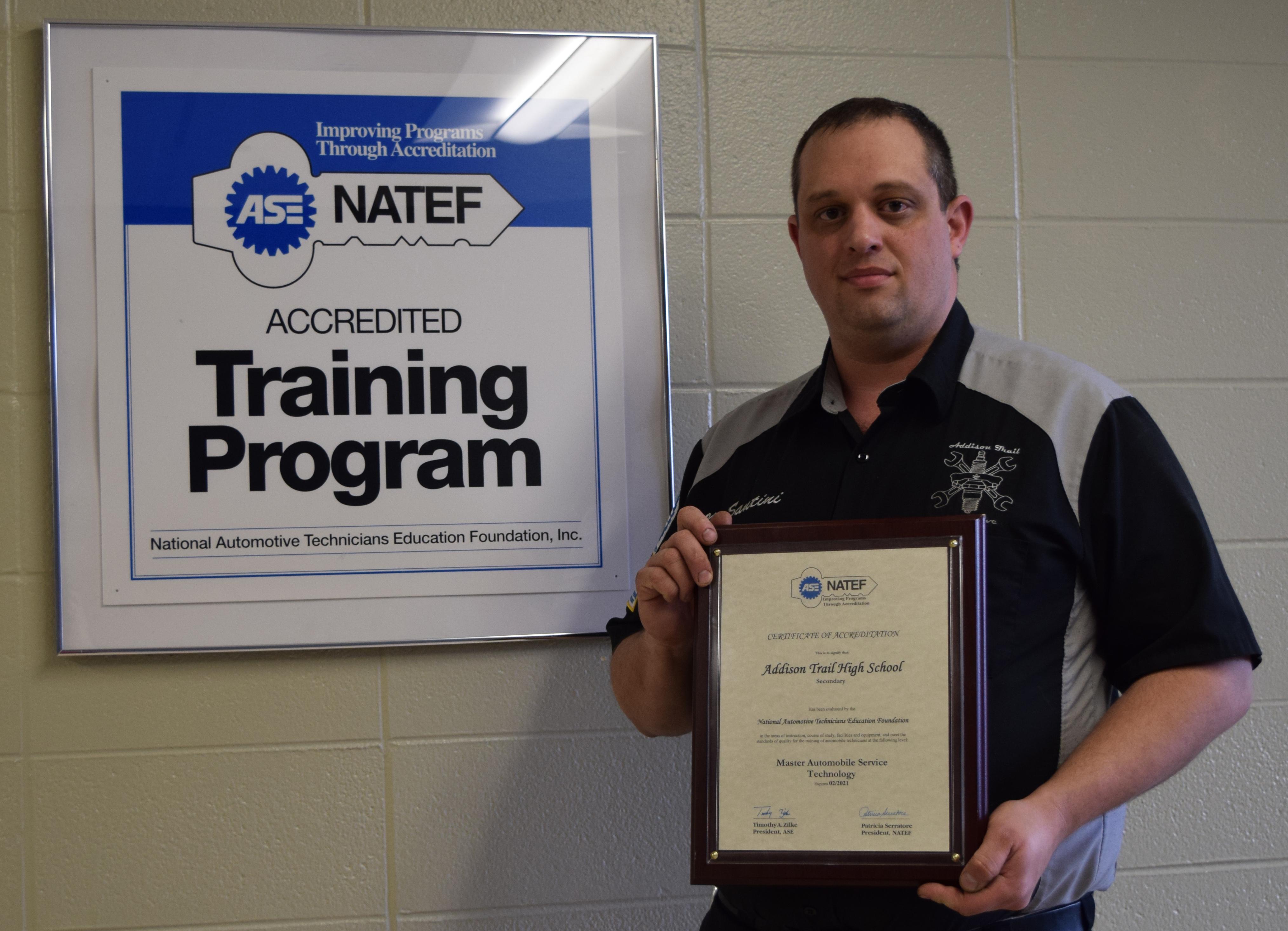 For nearly a decade, Addison Trail Career and Technical Education (CTE) teacher Keith Santini has continued to enhance the school’s automotive program, with a goal to earn accreditation by the National Automotive Technicians Education Foundation (NATEF) and the National Institute for Automotive Service Excellence (ASE).