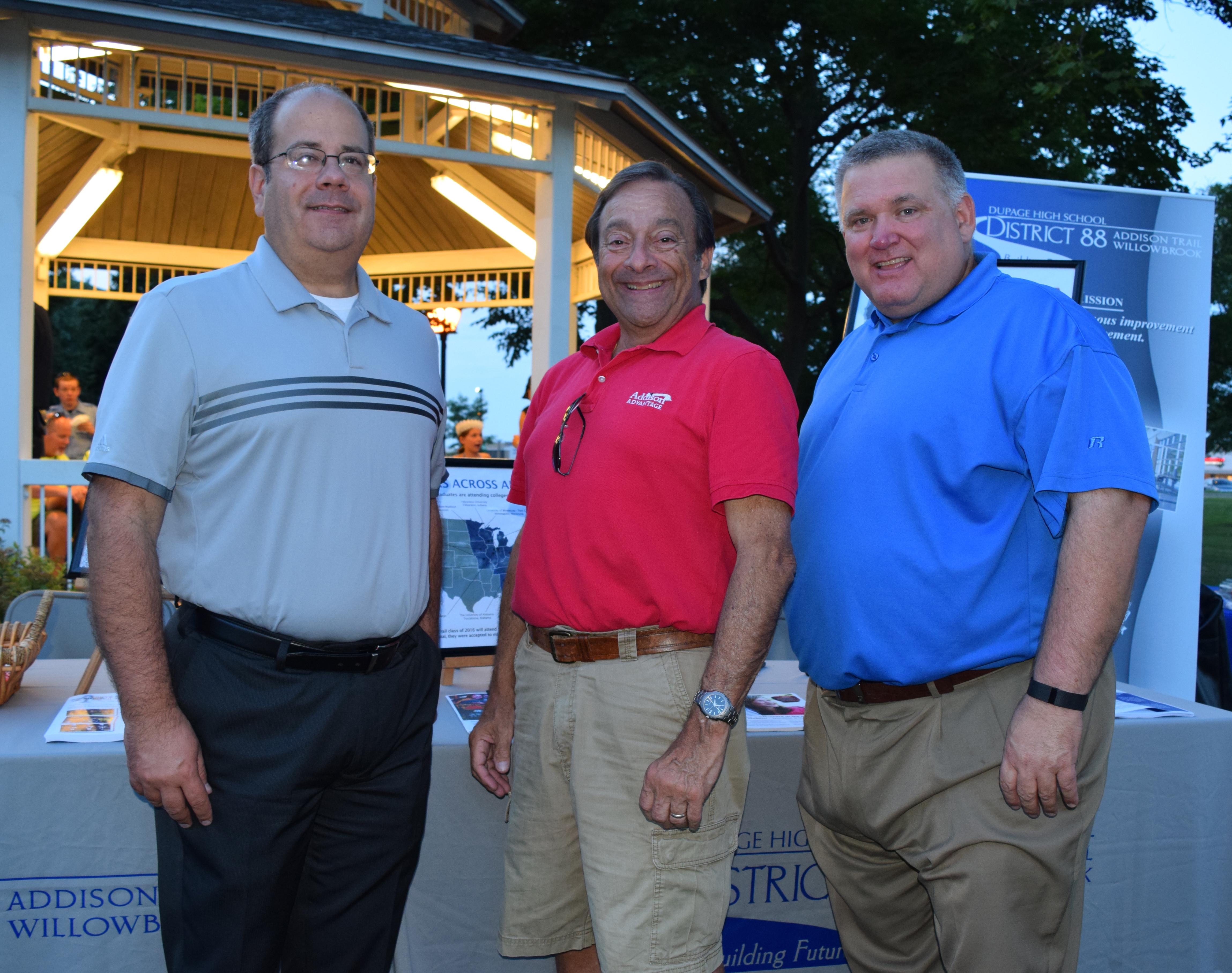 (From left) Addison Trail Principal Michael Bolden, Village of Addison Mayor Rich Veenstra and District 88 Superintendent Dr. Scott Helton enjoy the Village of Addison's Rock 'N Wheels event on Aug. 4.