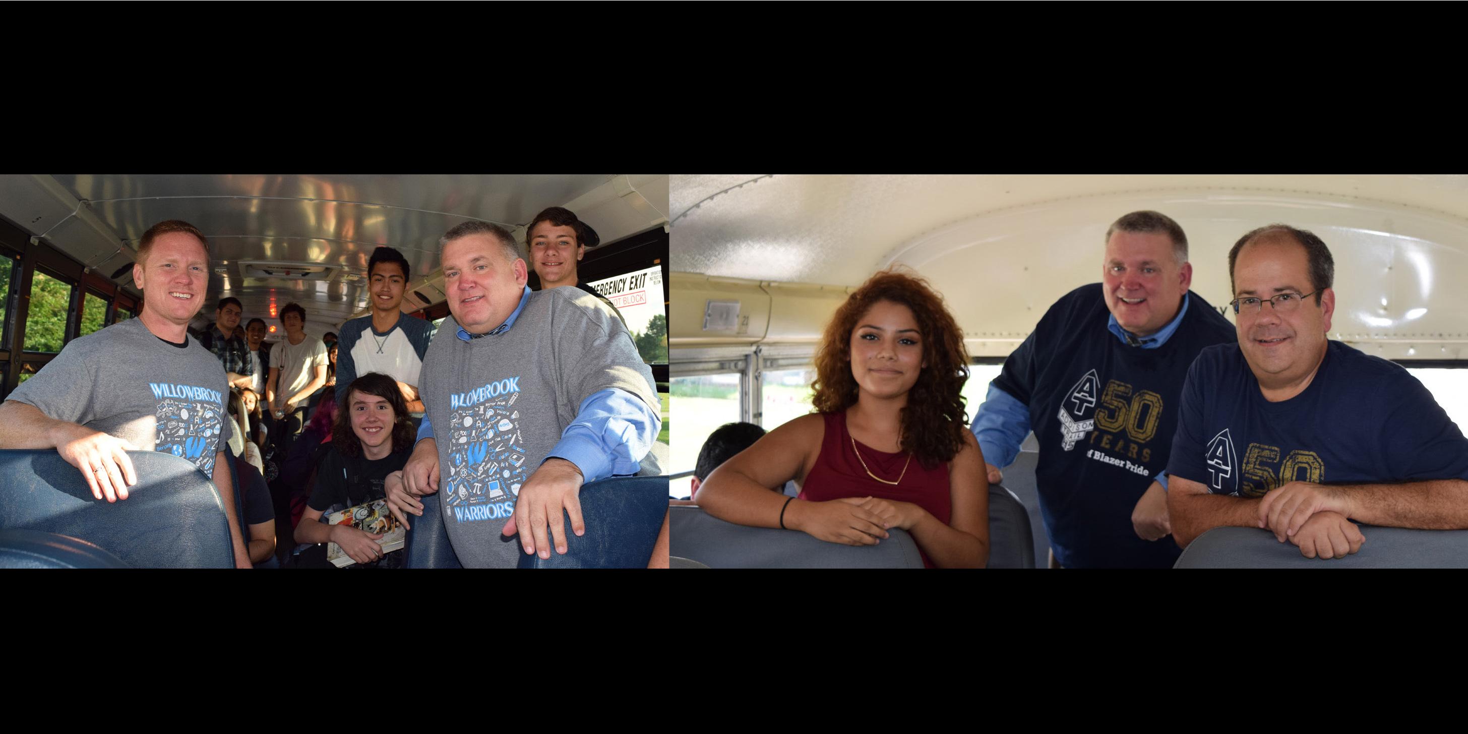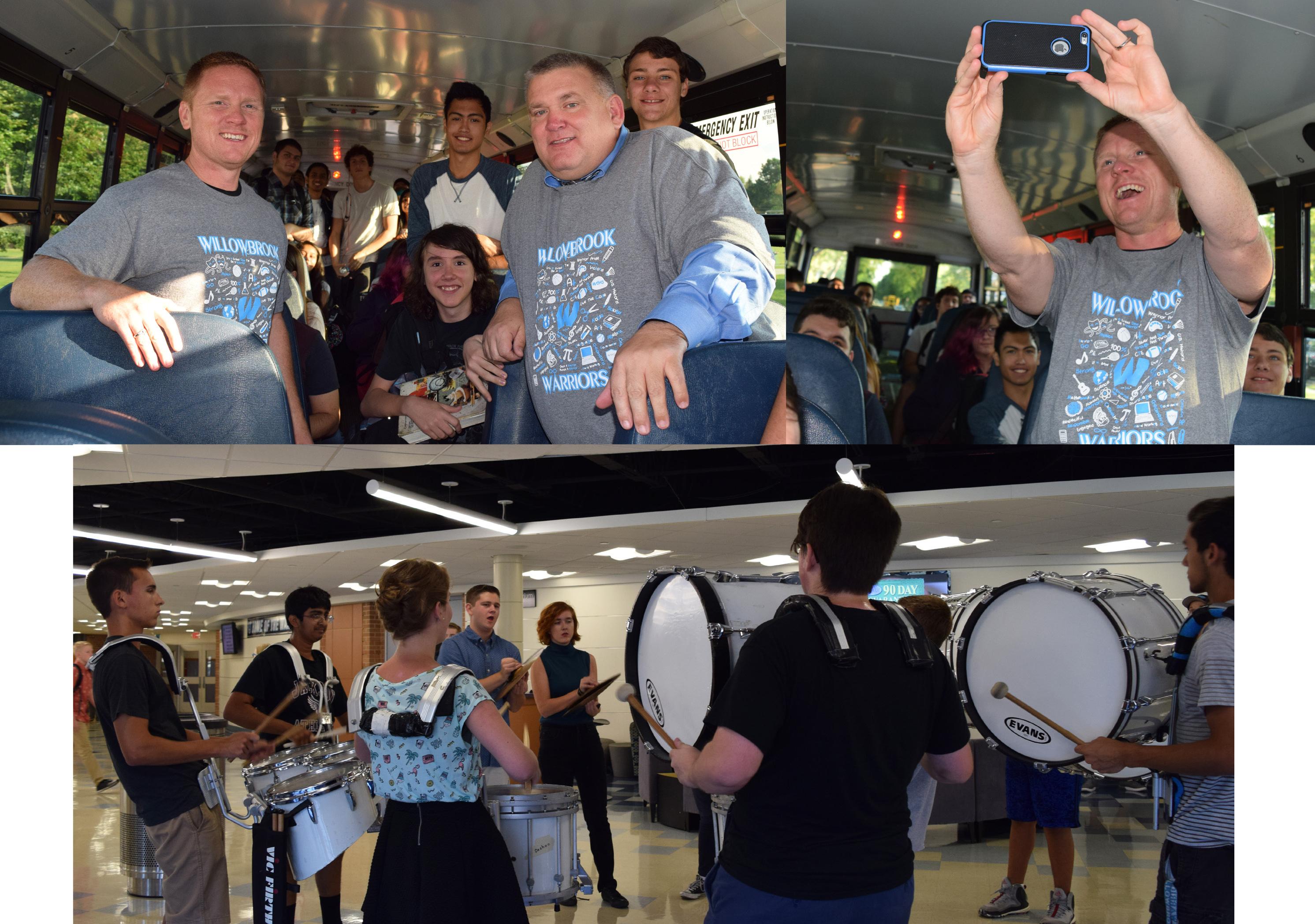 Top left: Willowbrook Principal Dan Krause (left) and District 88 Superintendent Dr. Scott Helton (right) ride a bus to school with students to celebrate the beginning of the 2016-17 school year on Aug. 17. Top right: Willowbrook Principal Dan Krause takes a selfie with students during a bus ride on the first day of the 2016-17 school year, Aug. 17. Bottom: Willowbrook Drum Line members spread school spirit as they perform throughout the school on the first day of the 2016-17 school year, Aug. 17.