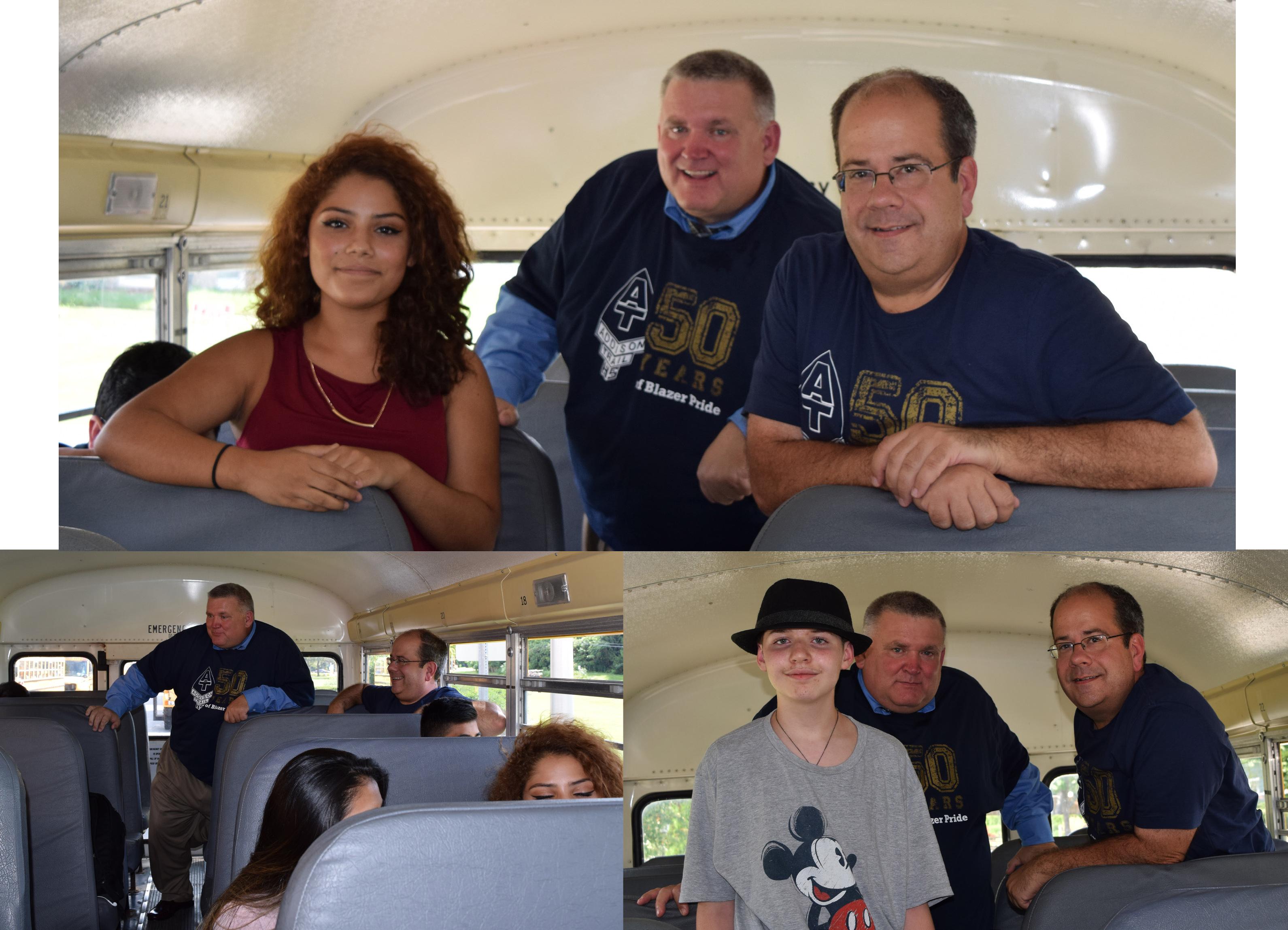 Top: District 88 Superintendent Dr. Scott Helton (center) and Addison Trail Principal Michael Bolden (right) welcome sophomore Alicia Acevedo to the 2016-17 school year. Helton and Bolden rode a bus with students to celebrate the beginning of the school year on Aug. 17. Bottom left: District 88 Superintendent Dr. Scott Helton (left) and Addison Trail Principal Michael Bolden (right) ride a bus with students to celebrate the beginning of the 2016-17 school year on Aug. 17. Bottom right: District 88 Superintendent Dr. Scott Helton (center) and Addison Trail Principal Michael Bolden (right) welcome freshman Joshua Sundling to the 2016-17 school year.