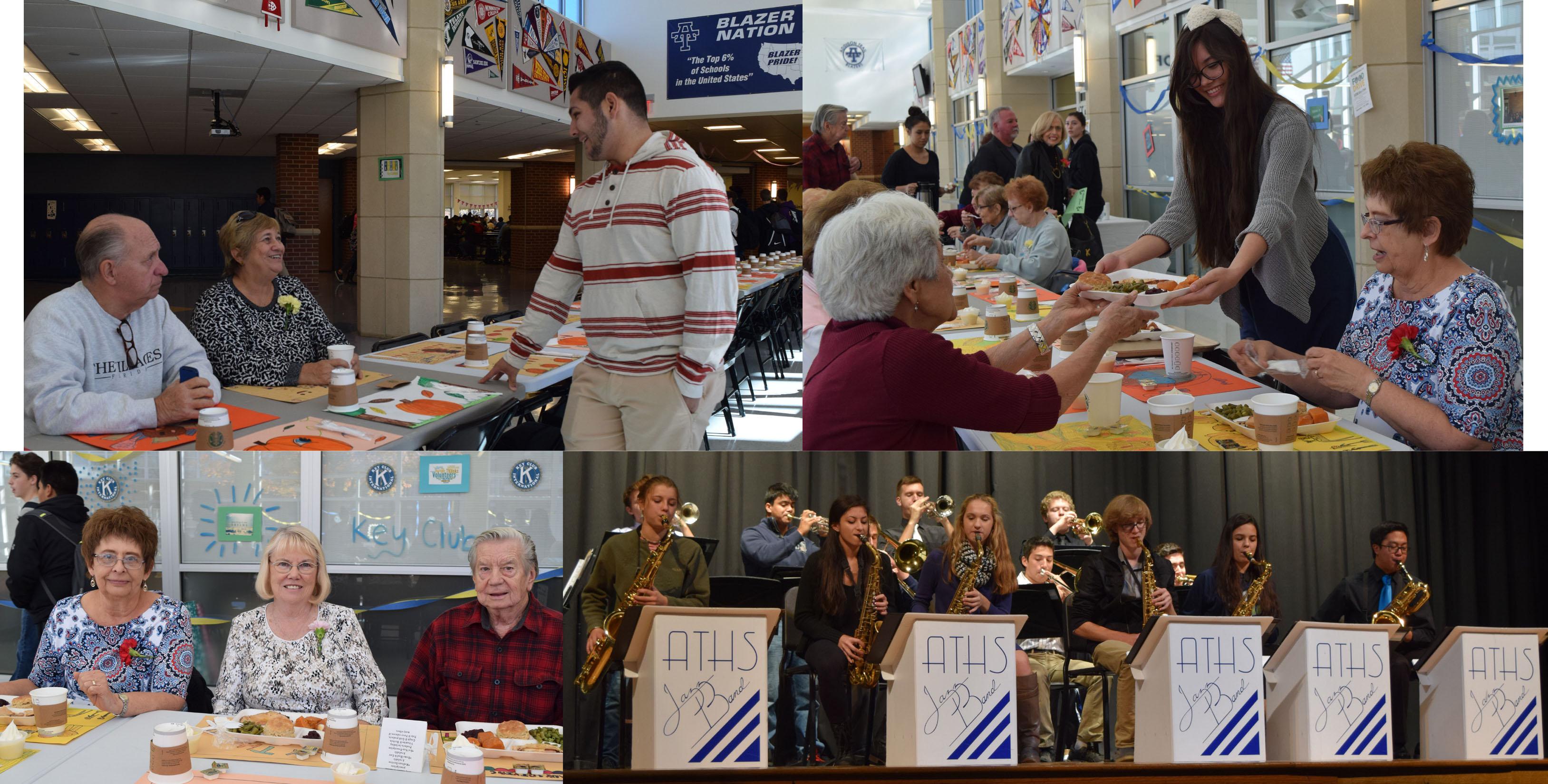On Nov. 9, Addison Trail hosted the annual Senior Citizen Thanksgiving Luncheon. Top left: Addison Trail senior Andrew Felix (right) chats with Anita and Paul Harshbarger of Addison during the event. Top right: Addison Trail junior Brittney Stano hands a Thanksgiving lunch to Philma Hinkhouse of Addison. Bottom left: Addison residents (from left) Barb Erazmus and Susan and Ron Szatko enjoy the event. Bottom right: The Addison Trail Jazz Band provides musical entertainment before lunch.
