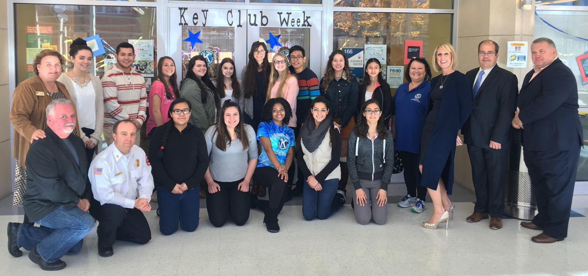 Addison Trail students who are members of the school's Key Club pose with members of the Kiwanis Club of Addison. Kiwanis sponsors Key Club and helped coordinate the Senior Citizen Thanksgiving Luncheon on Nov. 9. Also pictured are District 88 Superintendent Dr. Scott Helton (right) and Addison Trail Principal Michael Bolden (next to Helton).