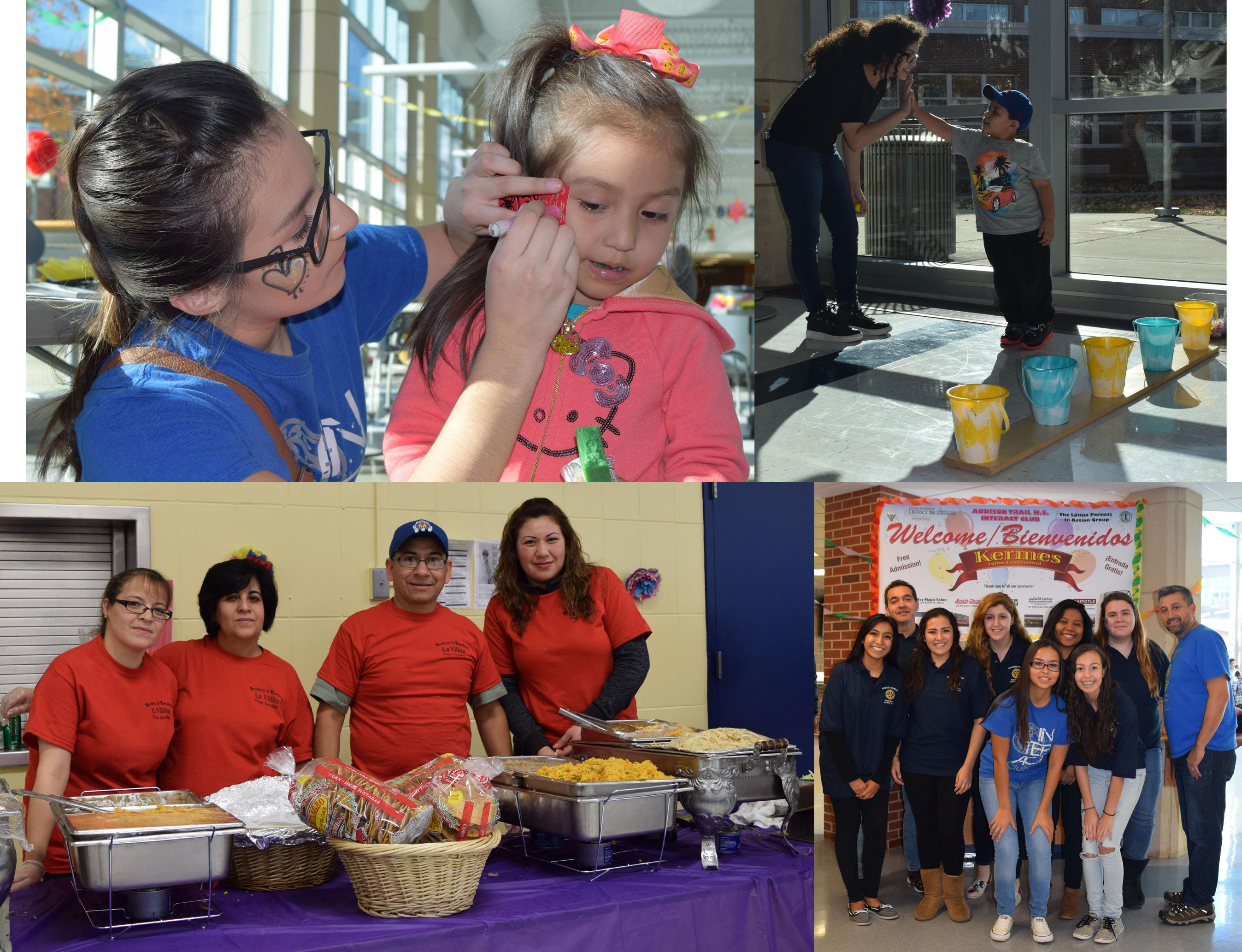 Top left: Addison Trail junior Emily Saucedo paints a design on Skyler Ochoa, 3, during Addison Trail's 3rd annual “Kermes” (Latino food festival) on Nov. 12. The event raised $2,000 for student scholarships. Top right: Addison Trail freshman Bryssa Chaidez gives her brother Daniel Graciano, 3, a high five while he plays a game at the festival. Bottom left: Members of Addison Trail's Padres Latinos en Acción group help serve the food, which was donated by Carnicerias Jimenez. Bottom right: Pictured are the leaders and sponsors of Addison Trail's Interact Club. That group helped coordinate "Kermes."