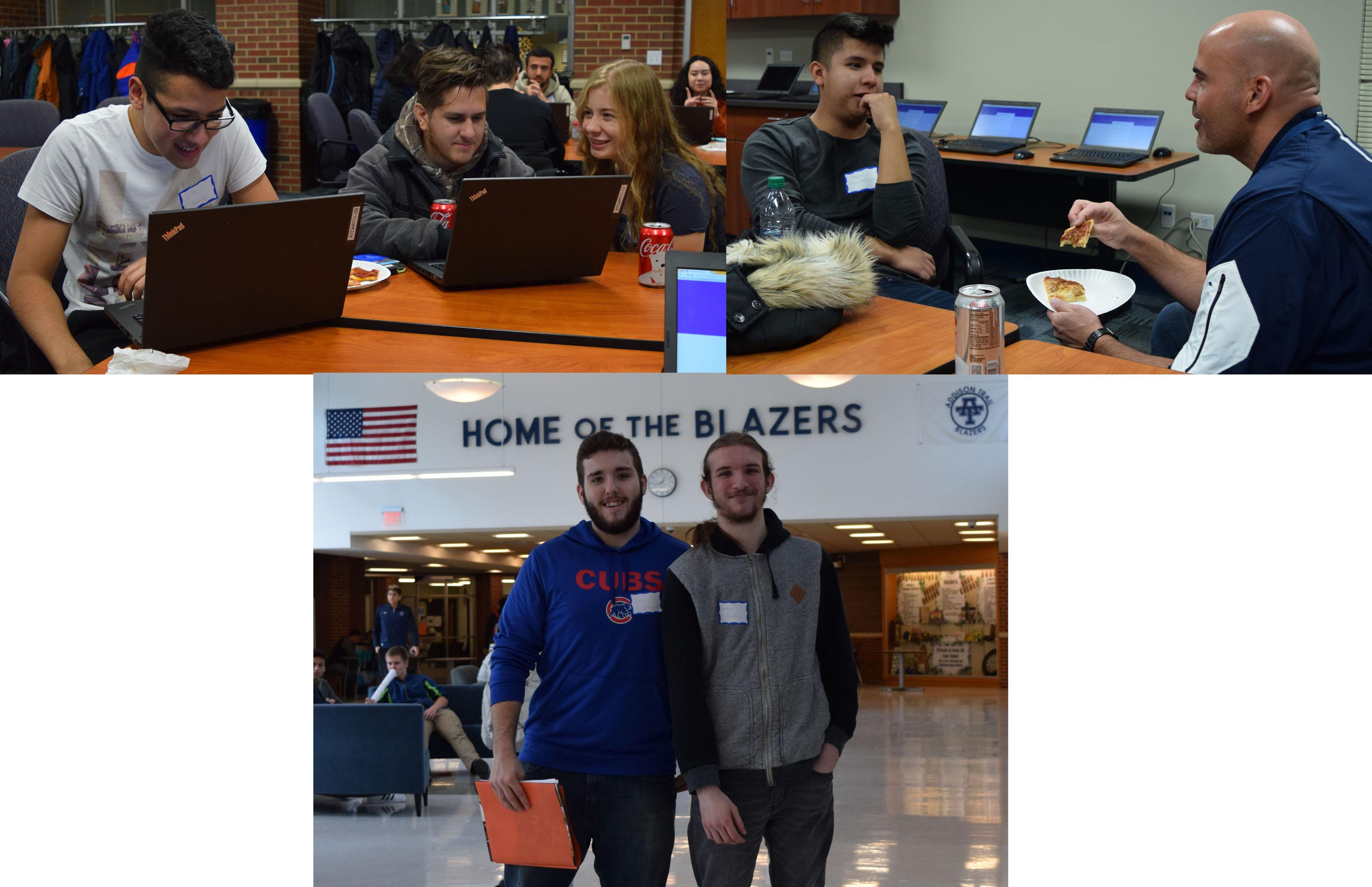 Top left: (From left) Addison Trail alumni Jesus Bonilla, Daniel Nowosad and Marissa Hernandez, all from the class of 2016, fill out a survey about Advanced Placement (AP)/college-level courses during Addison Trail's Young Alumni Day on Jan. 13. Top right: Addison Trail Dean Keith Marston speaks with alumnus Manny Hernandez (class of 2016). Bottom: Alumni Cody Welsh (left) and Larry Nuehring, both from the class of 2015, tour their alma mater.