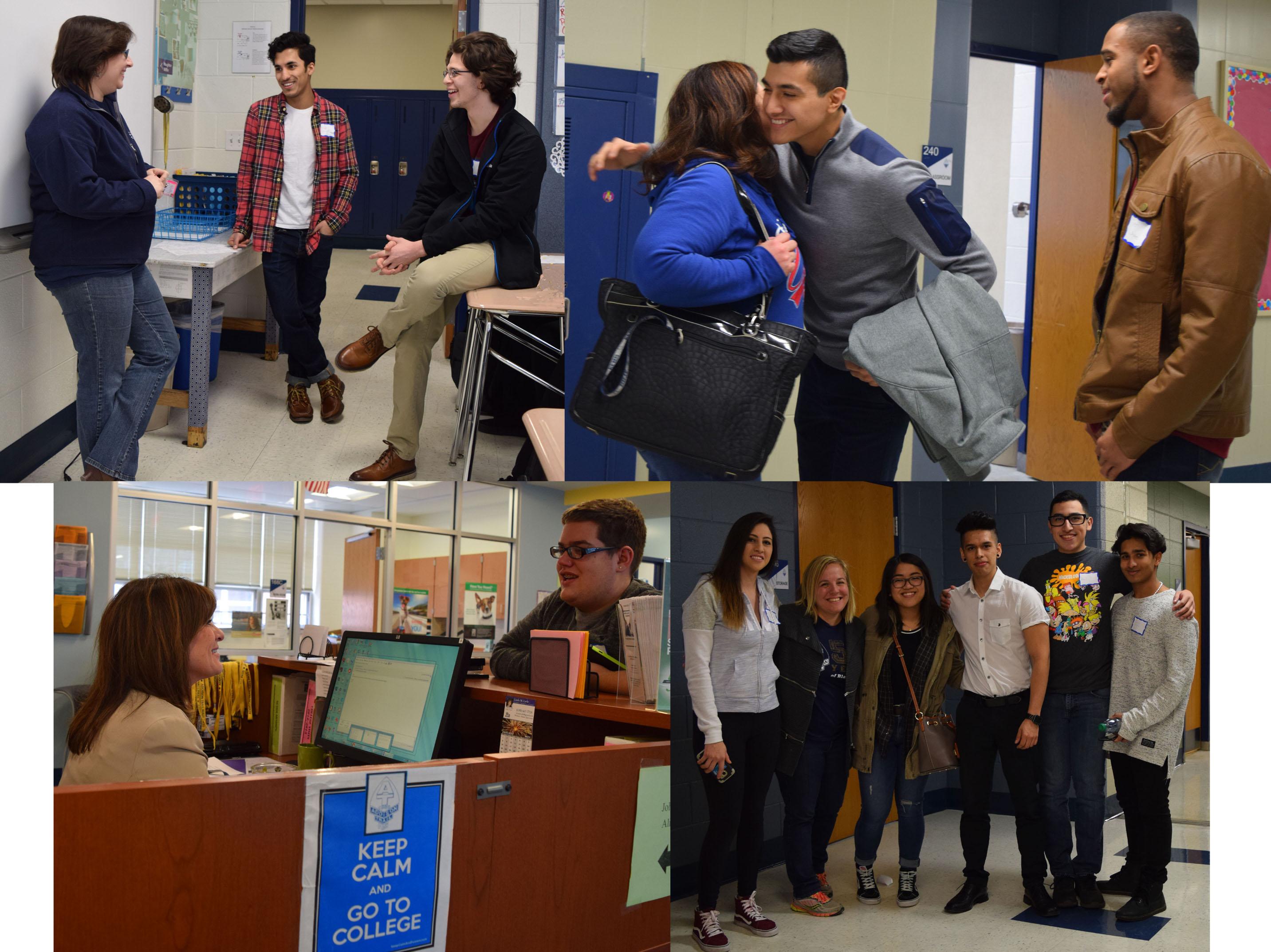 On Jan. 13, Addison Trail hosted its annual Young Alumni Day. Top left: Addison Trail math teacher Natalie Stach Wilen (left) shares a laugh with alumni Rayan Baig (center) and Natael Avila, both from the class of 2016. Top right: Addison Trail alumnus Jonathan Nevarez (class of 2015) gives Addison Trail English Department Chair Amy Ferraro a hug. Also pictured is alumnus Tyler White (class of 2015). Bottom left: Addison Trail Guidance Department Administrative Assistant Karen Grady chats with alumnus Alex Bennici (class of 2016). Bottom right: Addison Trail English teacher Hannah Sutton (second from left) poses with a group of alumni.