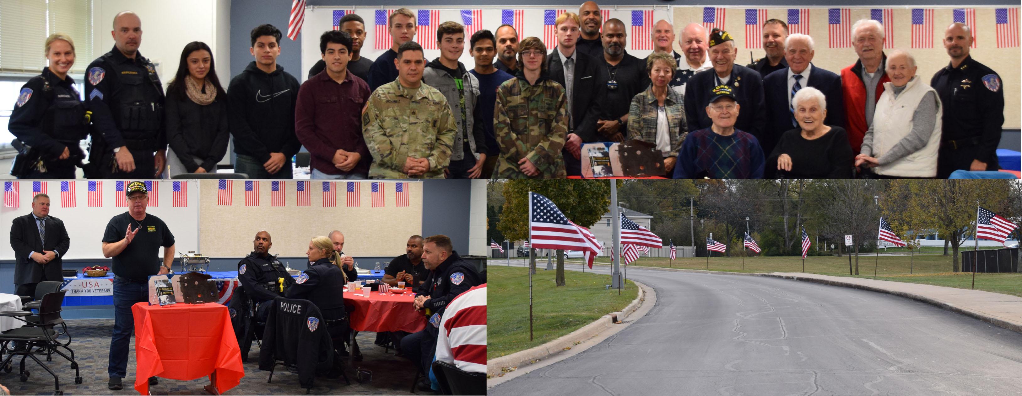 Top: On Nov. 10, Willowbrook welcomed veterans, first responders and local service groups in honor of Veterans Day (Nov. 11). They are pictured with Willowbrook students who plan to serve in the military. Bottom left: During the Veterans Day event, Addison Trail parent Mike Green (pictured) presented Willowbrook with a relic from the USS Arizona (a 12-by-12-inch piece of the deckhouse), a battleship that was sunk during the attack on Pearl Harbor on Dec. 7, 1941. He also gave the school a copy of the book “All the Gallant Men,” signed by co-author and USS Arizona survivor Donald Stratton, who is his stepfather. Pictured at left is District 88 Superintendent Dr. Scott Helton. Bottom right: American flags line the entryway to Willowbrook in honor of Veterans Day.