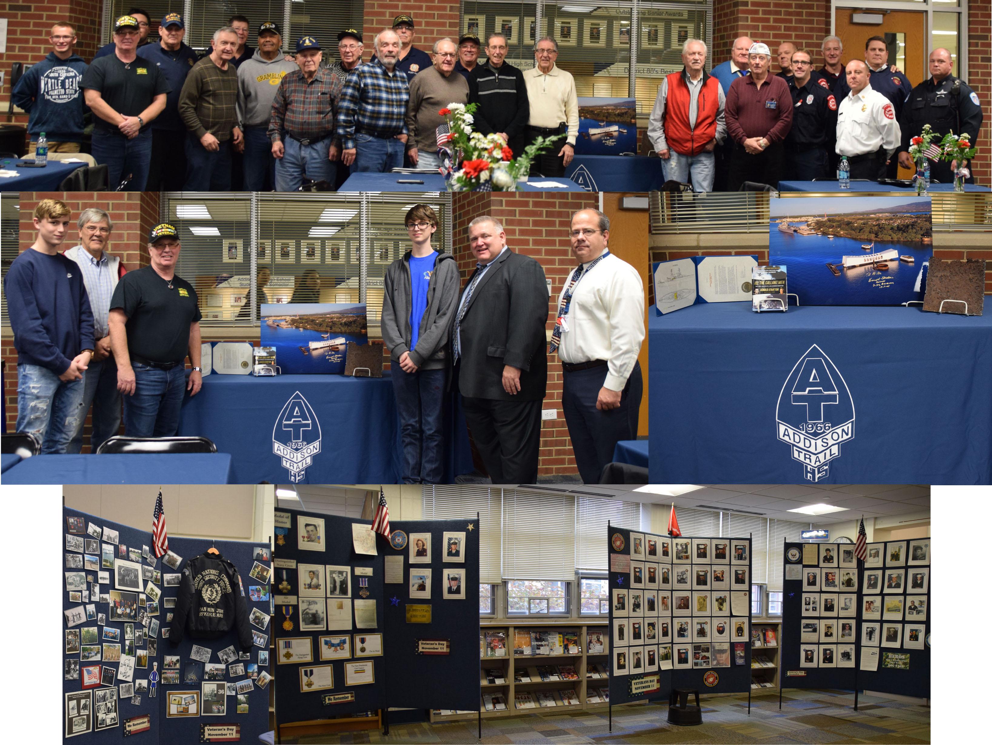 Top: On Nov. 10, Addison Trail welcomed veterans and first responders in honor of Veterans Day (Nov. 11). They are pictured with Addison Trail students who plan to serve in the military. Middle left: During the Veterans Day event, Addison Trail parent Mike Green (third from left) presented Addison Trail with a relic from the USS Arizona (a 12-by-12-inch piece of the deckhouse), a battleship that was sunk during the attack on Pearl Harbor on Dec. 7, 1941. He also gave the school a copy of the book “All the Gallant Men,” signed by co-author and USS Arizona survivor Donald Stratton, who is his stepfather. Green is pictured with (from left) his son Jonathan, District 88 Board of Education Member Mark Turk, his son Alec, District 88 Superintendent Dr. Scott Helton and Addison Trail Principal Michael Bolden. Middle right: Pictured are the items that were presented by Green. Bottom: Pictured is a Veterans Day display in Addison Trail's media center that featured photos and items of veterans with a connection to Addison Trail or the Village of Addison.