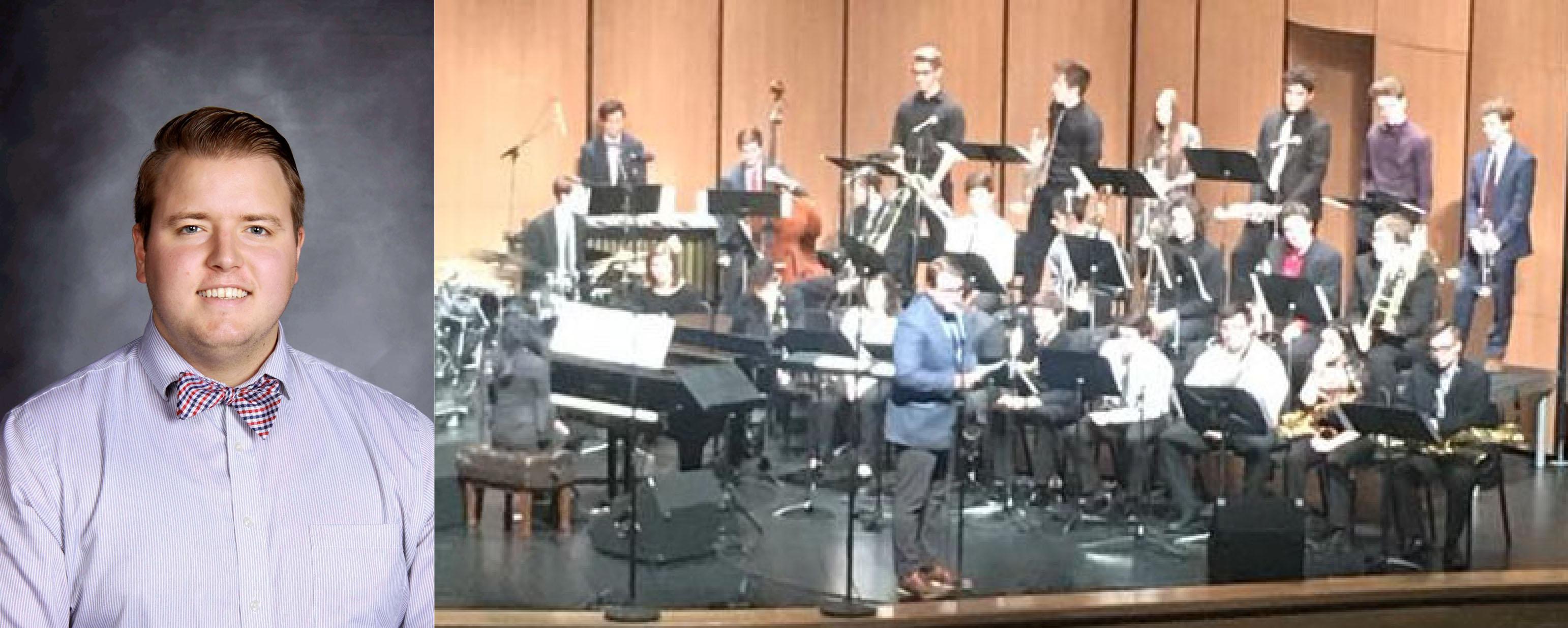 Left: Pictured is Addison Trail Orchestra Director Alex Stombres, who was selected to conduct during the District 9 Illinois Music Education Association Senior Jazz Festival on Nov. 18. Right: Stombres conducts the Jazz Band 3 during the event.