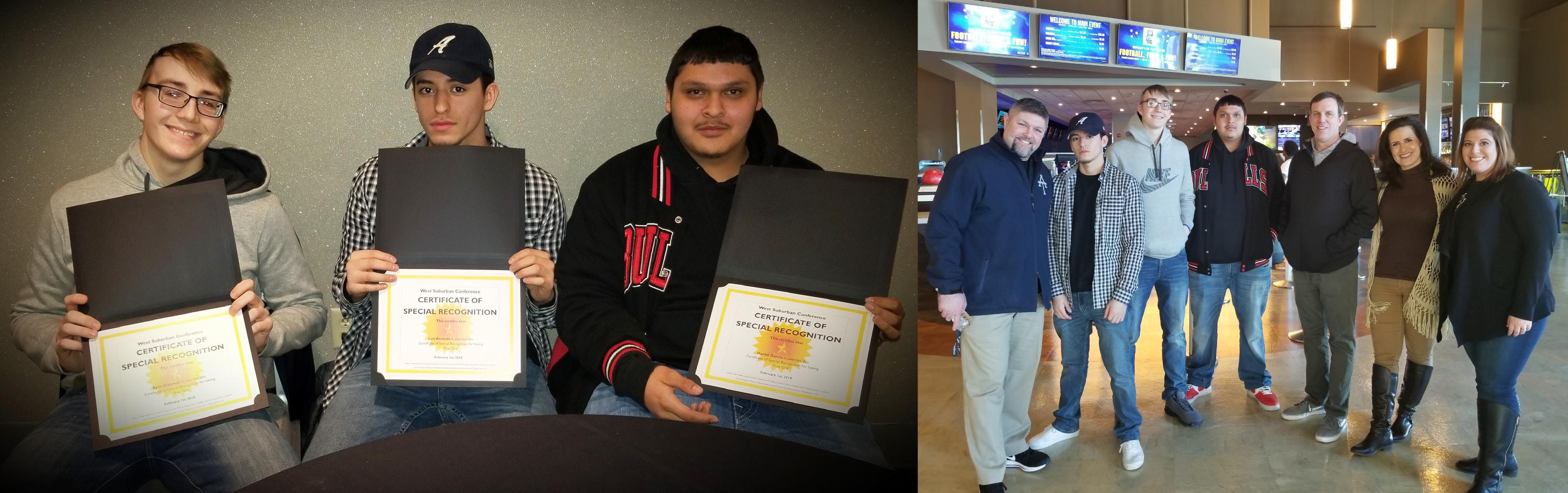 Left: (From left) Addison Trail senior Ryan Glatchak, junior Luis Acevedo and sophomore Daniel Garcia are recognized during the West Suburban Conference Activities Directors and Principals second annual GRIT Award event on Feb. 1. That award honors students in the conference who have made positive changes in their life. Right: The students attended the GRIT Award event with Addison Trail staff members they invited, who have helped them make better decisions. Pictured are (from left) Addison Trail teacher and Head Football Coach Paul Parpet Jr., junior Luis Acevedo, senior Ryan Glatchak, sophomore Daniel Garcia, Guidance Counselor Shane Cole, Assistant Principal Iridia Niewinski and Jessica Riopell, Behavior Interventionist for the school's ACHIEVE program.