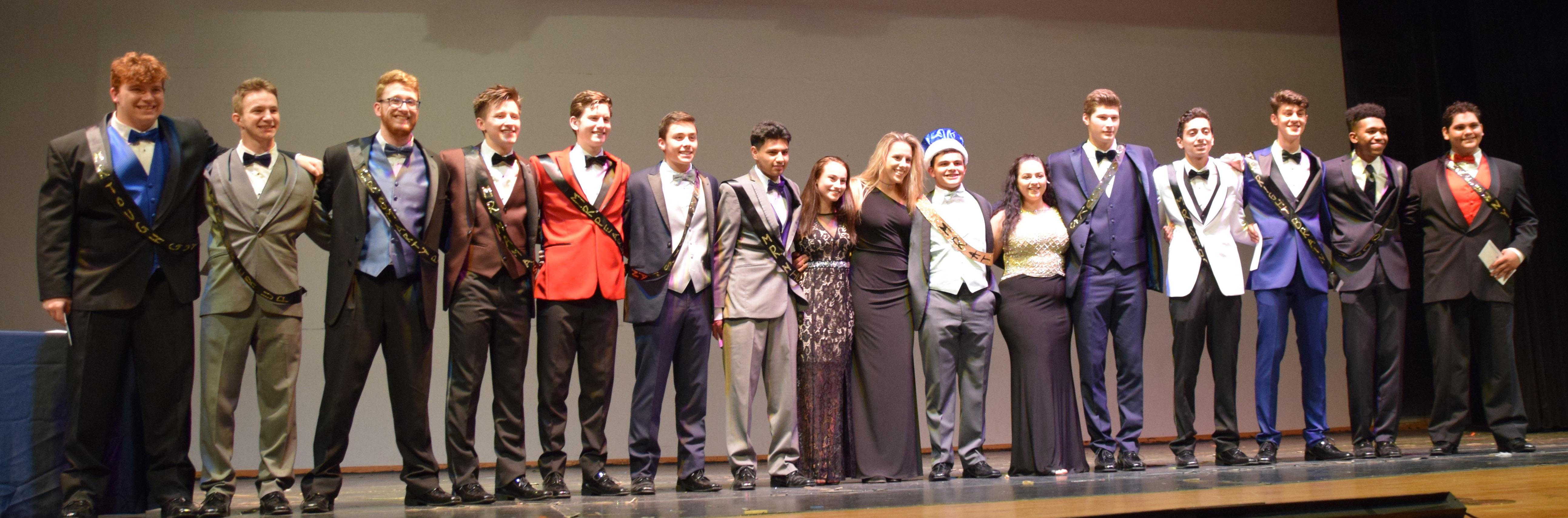 Pictured are the Addison Trail senior boys who competed in Mr. AT 2018, along with the event's three hosts. They are (from left) Michael Renc, Simon Marinelli, Lucas Walsh, Kenneth Bartkiewicz, Michael Strycharz, Jett Ramir, Edgar Rodriguez, Alyssa Anselmini (host), Nicolette Scorza (host), Carlos Rosado (who was named Mr. AT 2018), Andrea Susa (host), Jacob Grygo, Nicolas Gazdacka, Nicholas Savinos, Albert White III and Brandon Olea.