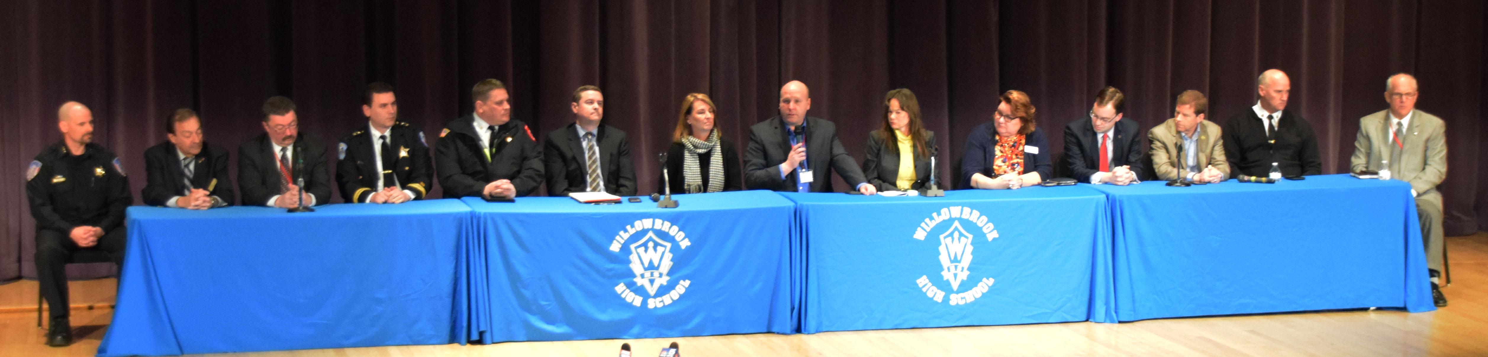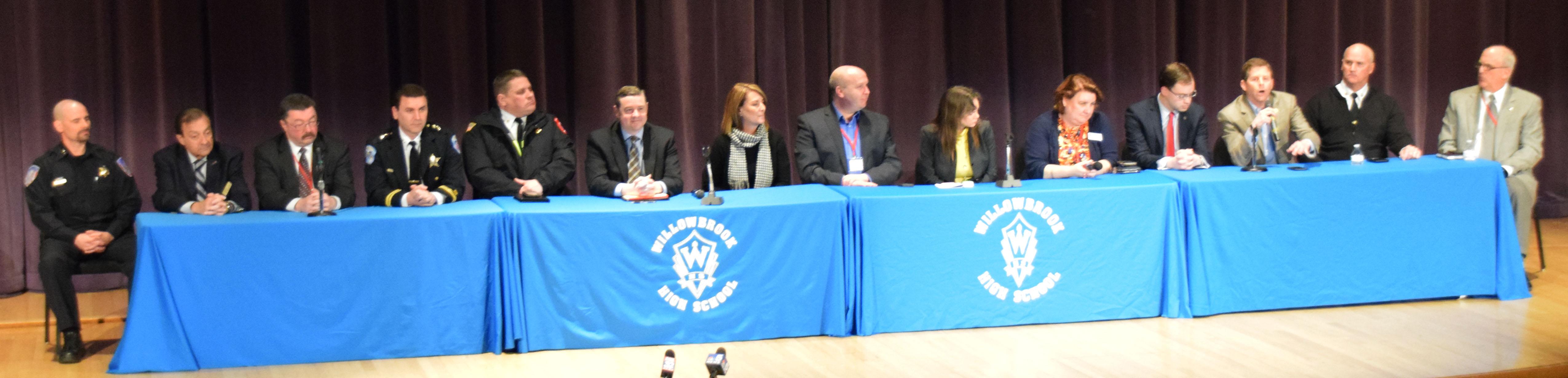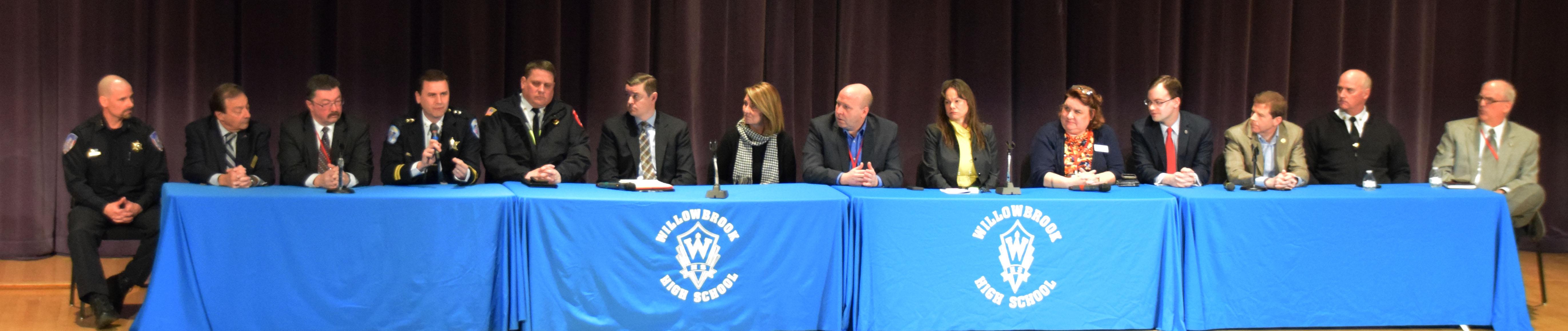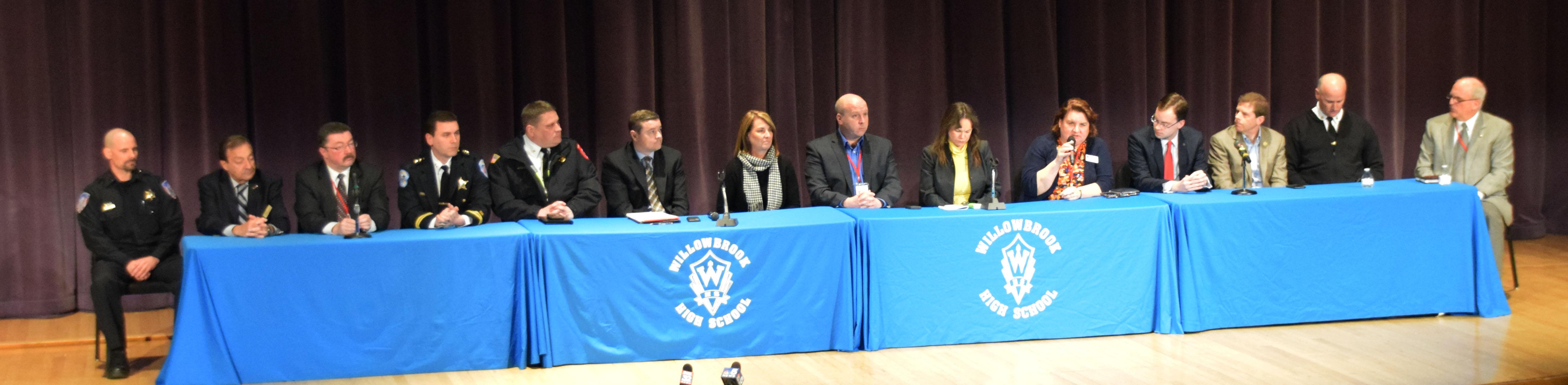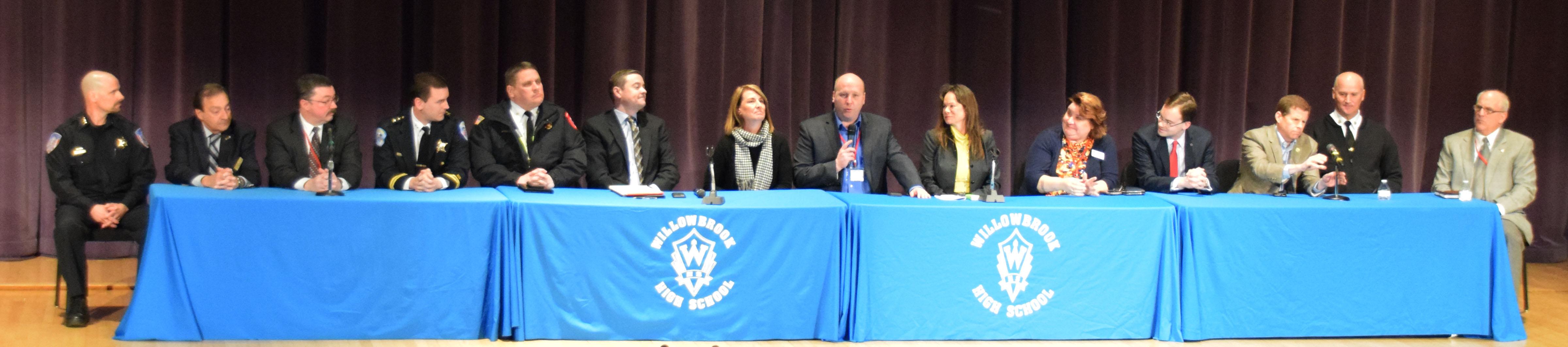 Panelists: Mike Lay (Police Chief, Village of Villa Park), Rich Veenstra (Mayor, Village of Addison), Murray Snow (Director, DuPage County Office of Homeland Security and Emergency Management), Joe Maranowicz (Deputy Police Chief, Village of Addison), Scott Walker (Deputy Fire Chief, Village of Addison), State Sen. Chris Nybo, State Rep. Deb Conroy, State Sen. Tom Cullerton, State Rep. Christine Winger, State Rep. Kathleen Willis, State Rep. David S. Olsen, State Sen. Tom Rooney, Ron Rakosnik (Fire Chief, Village of Villa Park) and Rich Jorgensen (DuPage County Coroner)