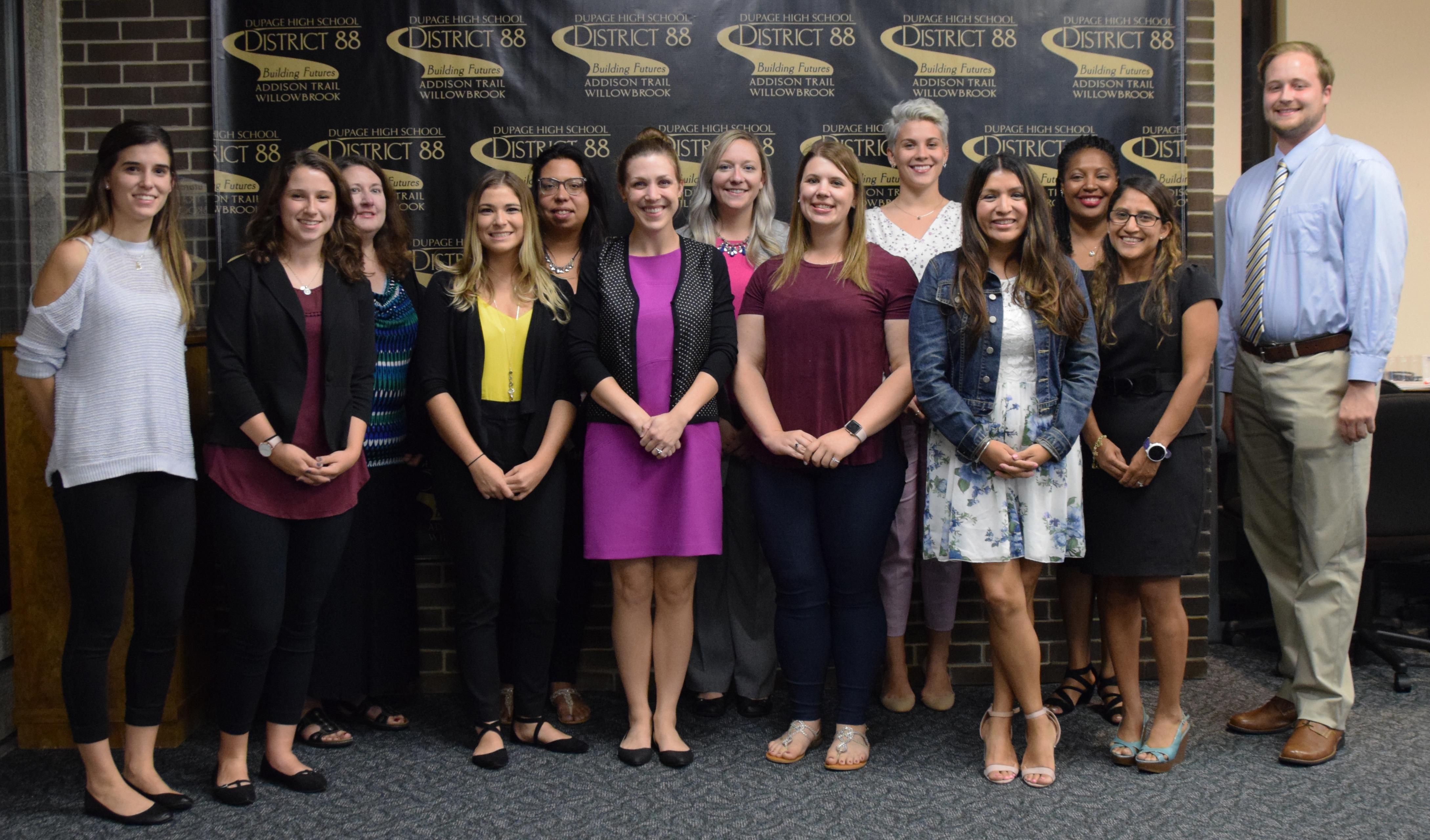 During its Aug. 27 meeting, the District 88 Board of Education welcomed new Addison Trail and new Willowbrook staff members to the District 88 family, as well as returning individuals who have new positions. Pictured are 13 of those staff members. They are (from left) Hanna Arifi (Addison Trail, physical education), Mary Doro (Willowbrook, special education), Leslie Diederich (Addison Trail, special education), Hannah Walsh (Willowbrook, special education), Araceli Herrera (Addison Trail, social work intern), Elizabeth Denz (Willowbrook, math), Madeline Hart (Willowbrook, special education/social studies), Nicole Knebelsberger (Addison Trail, social work intern), Claire Sychta (Addison Trail, social studies), Lucy Almanza-Fernandez (Willowbrook, English/literacy ESL), Portia Ransom (Addison Trail, English), Marisol Johnson (Cholewick) (Willowbrook, reading) and Ryan Peronto (Addison Trail, social studies).